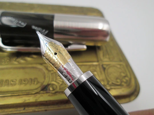 Equipa un plumín realizado a mano, platinado y decorado con un biplano entre nubes, símbolo de la pasión del escritor por las acrobacias aéreas. Bicolor y en oro de 18 quilates 750 milésimas, de punto medio, respiradero circular y escritura fluida y agradable.