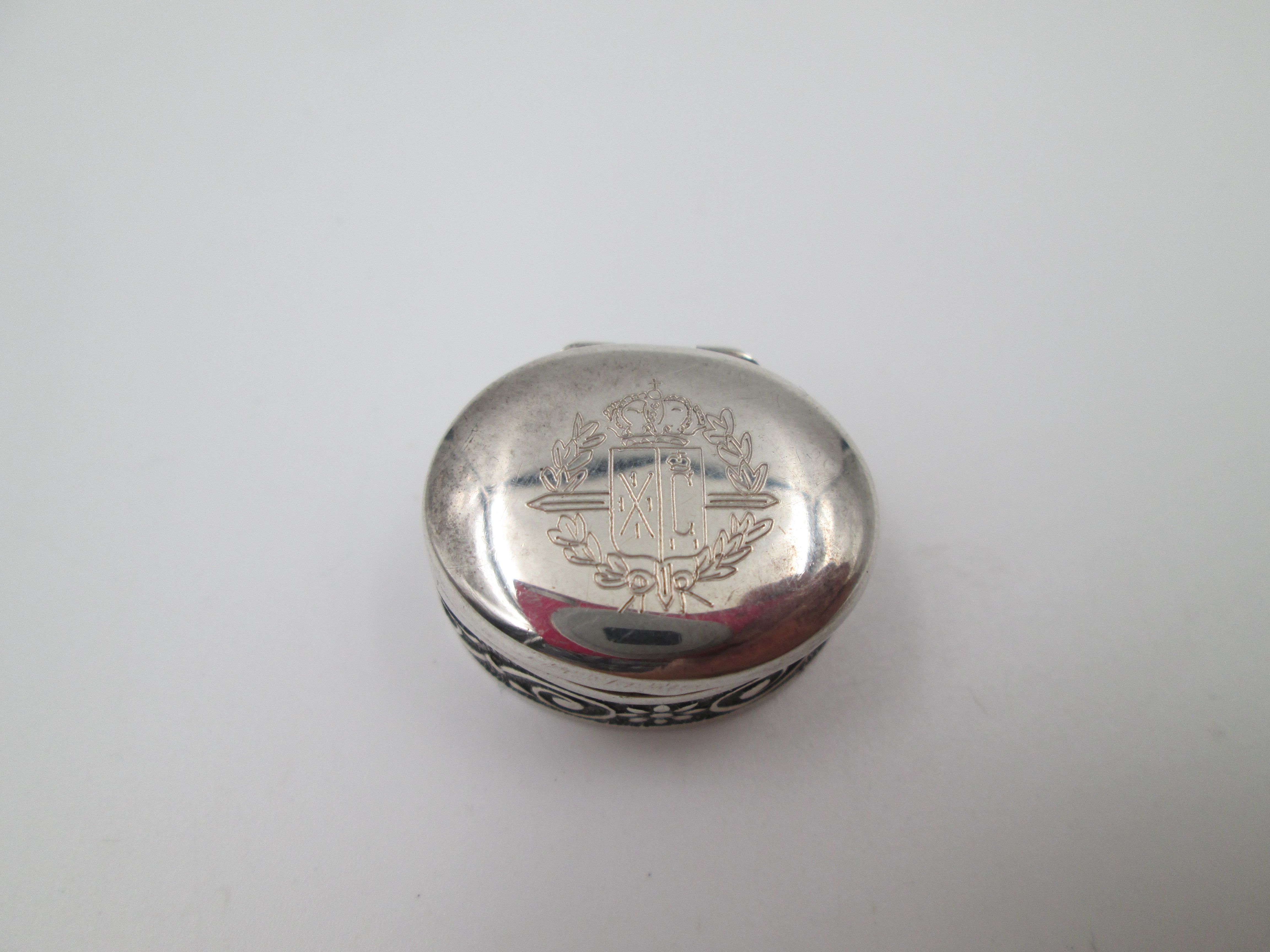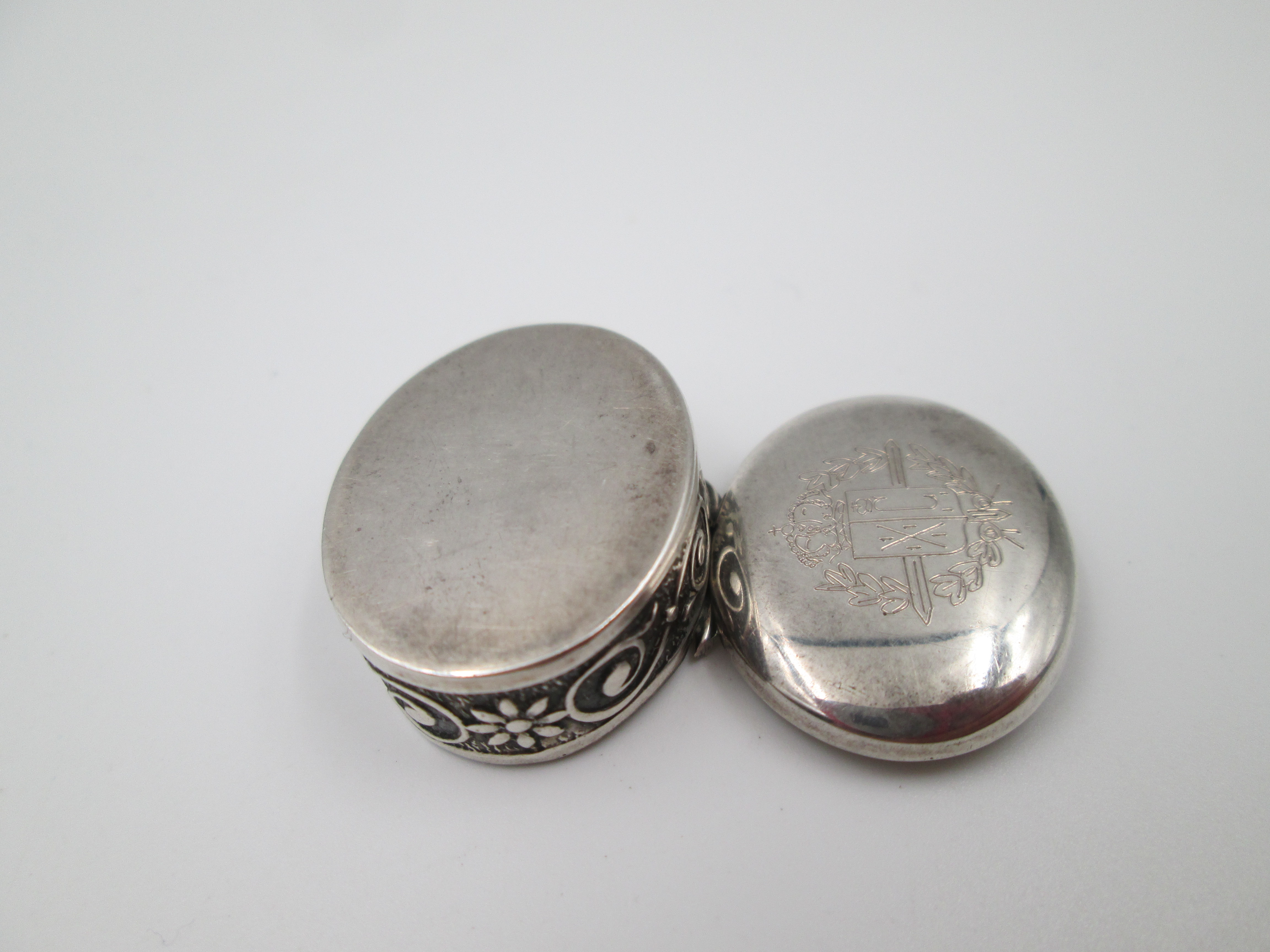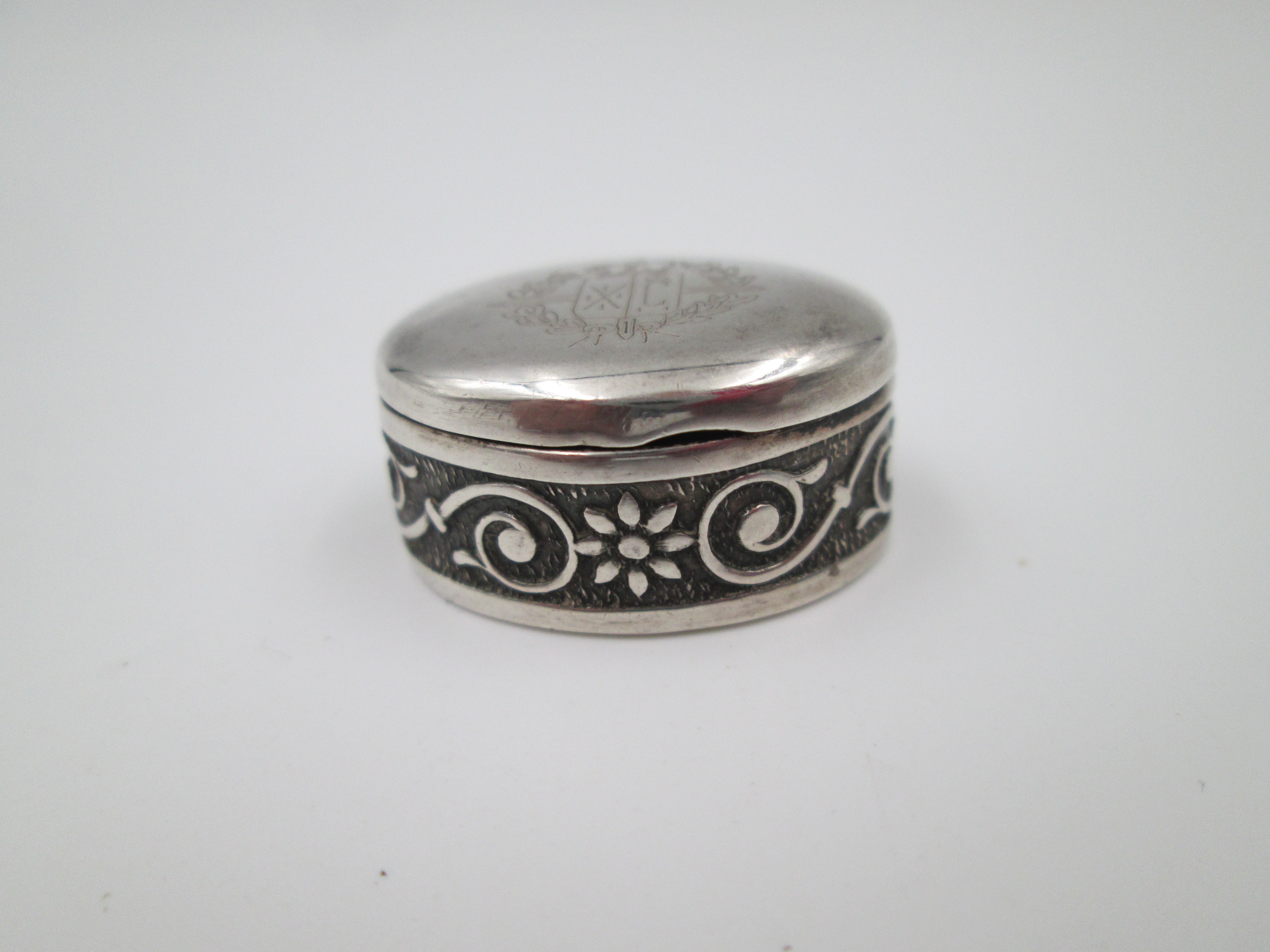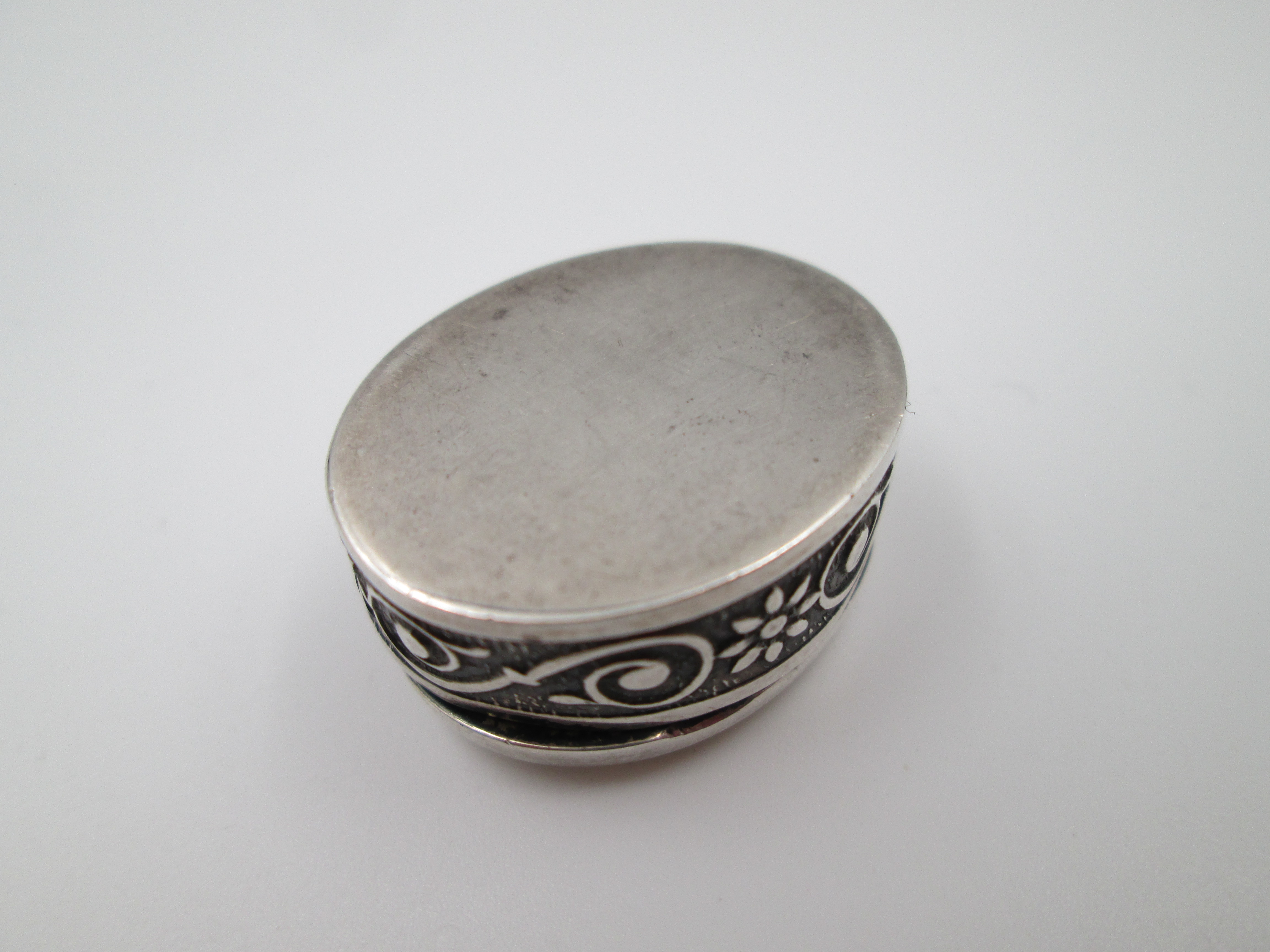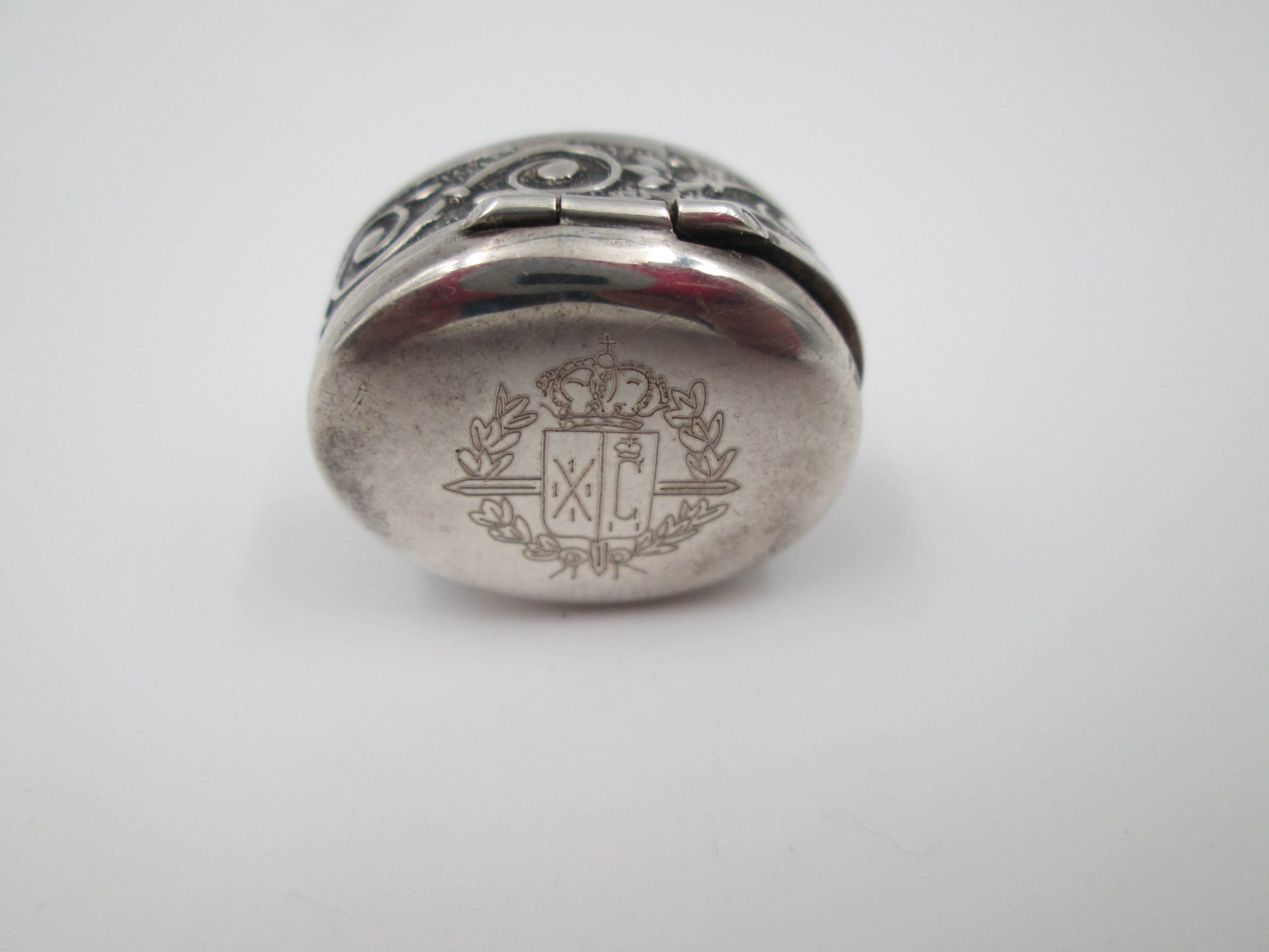 Pequeño pastillero oval en plata de ley. Motivos vegetales y escudo. Europa. 1980