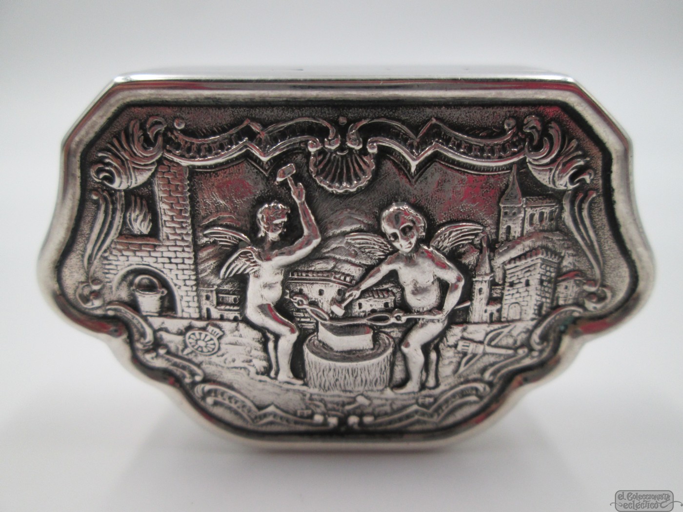 Pastillero. Plata de ley. 1990. Alto relieve. Herreros querubines