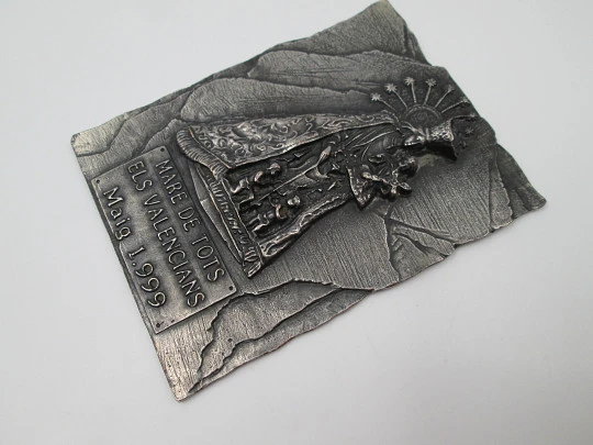 Placa religiosa cuadrada Virgen de los Desamparados. Metal plateado. Relieve. 1999