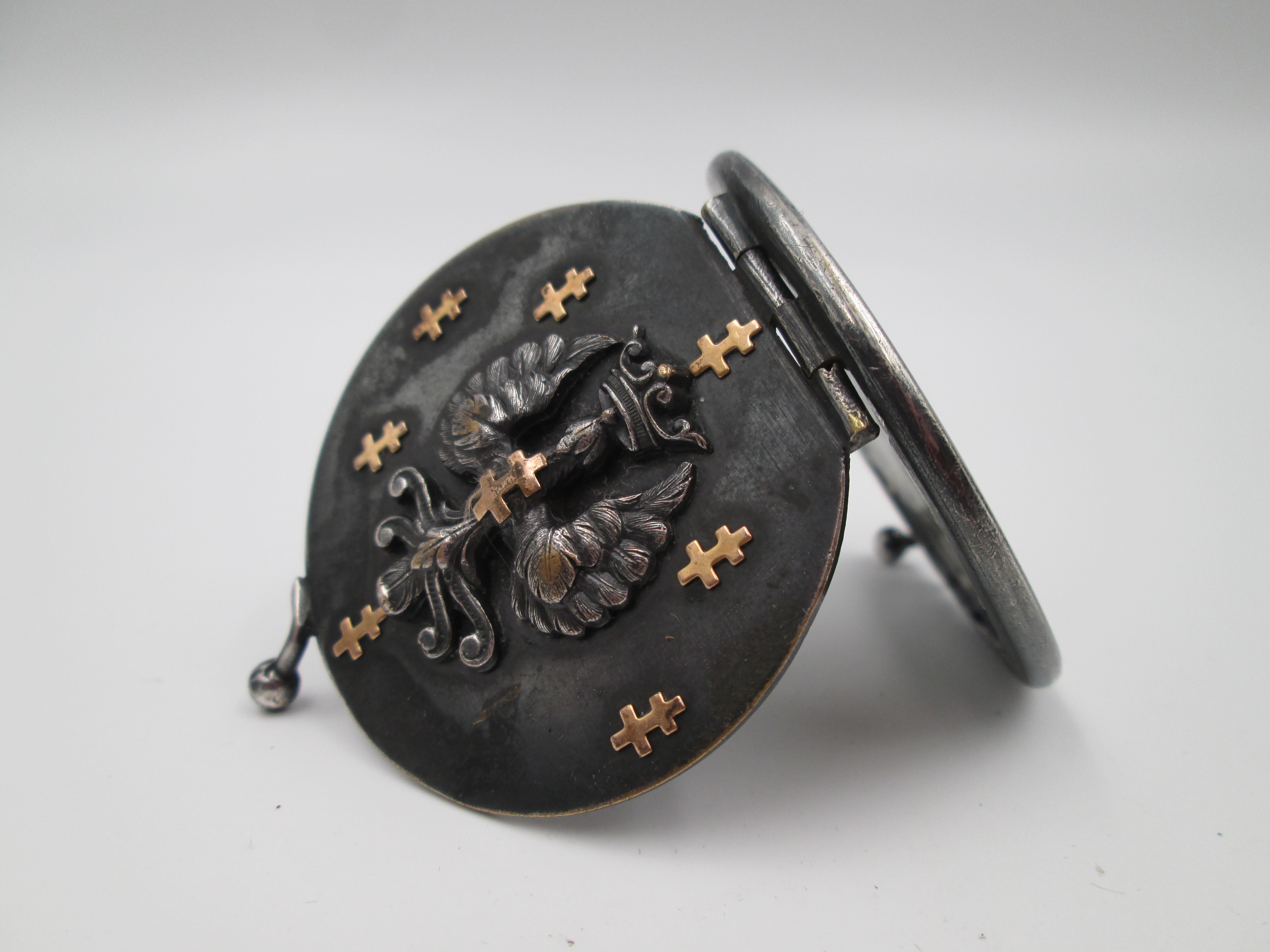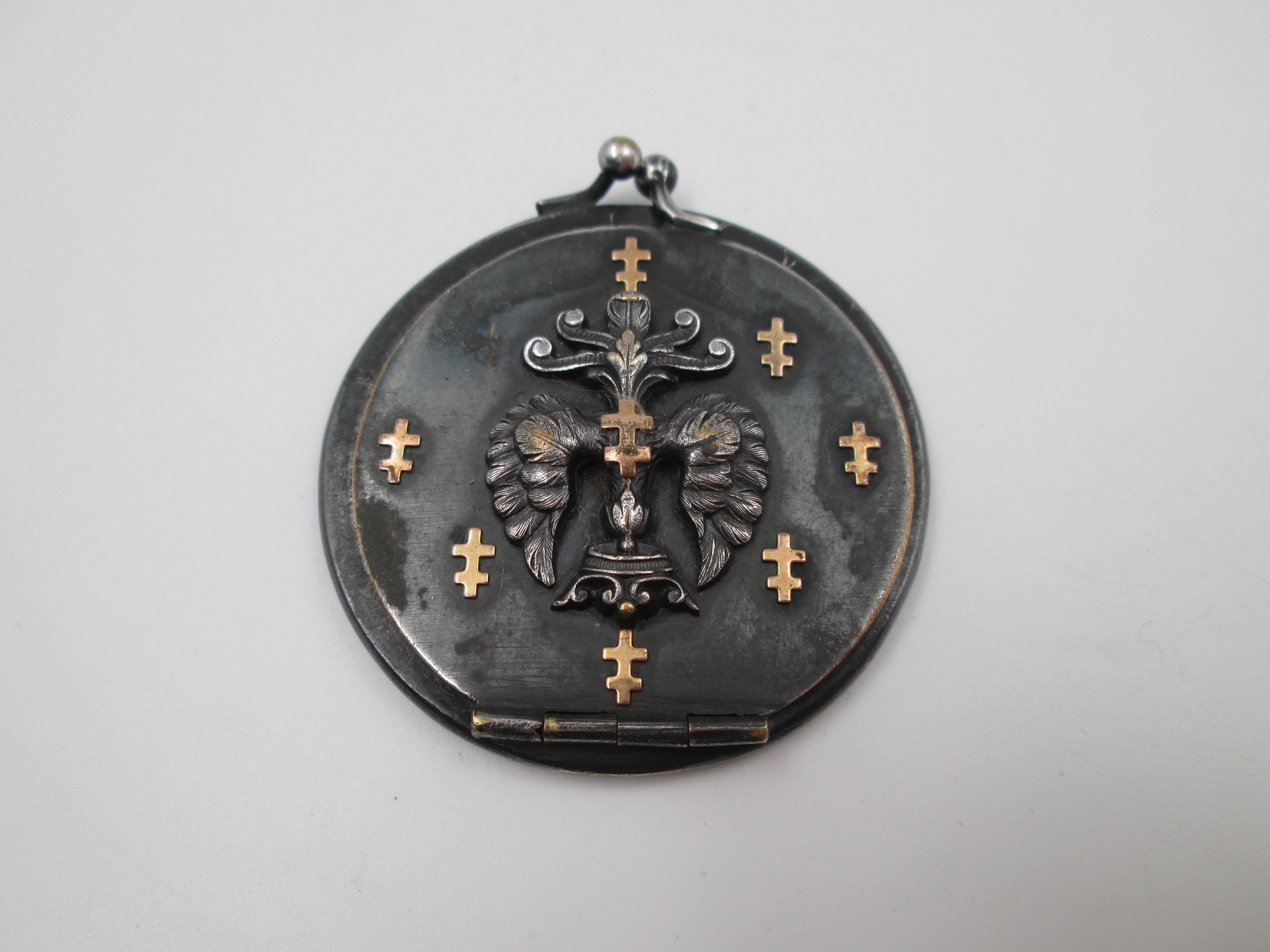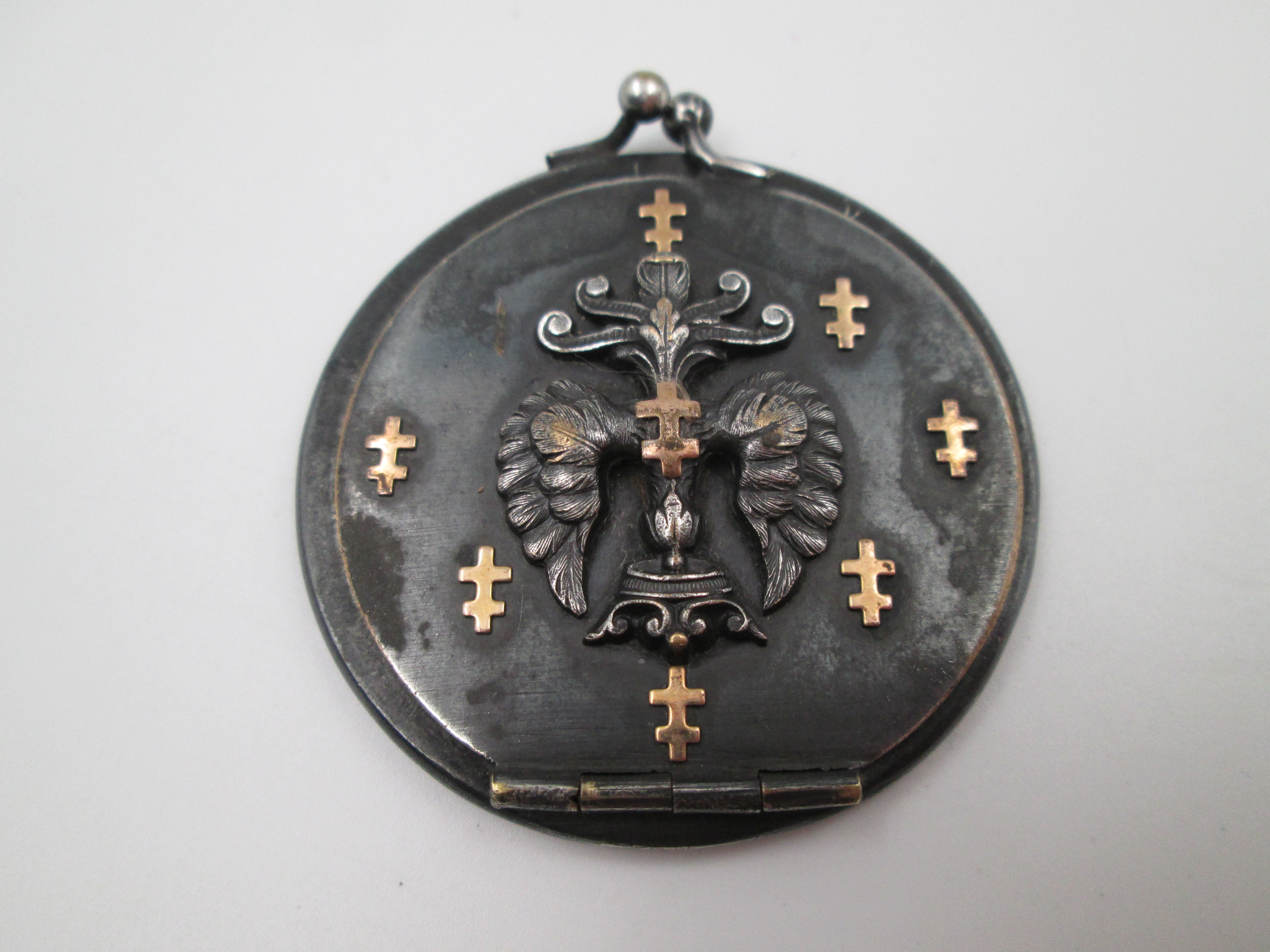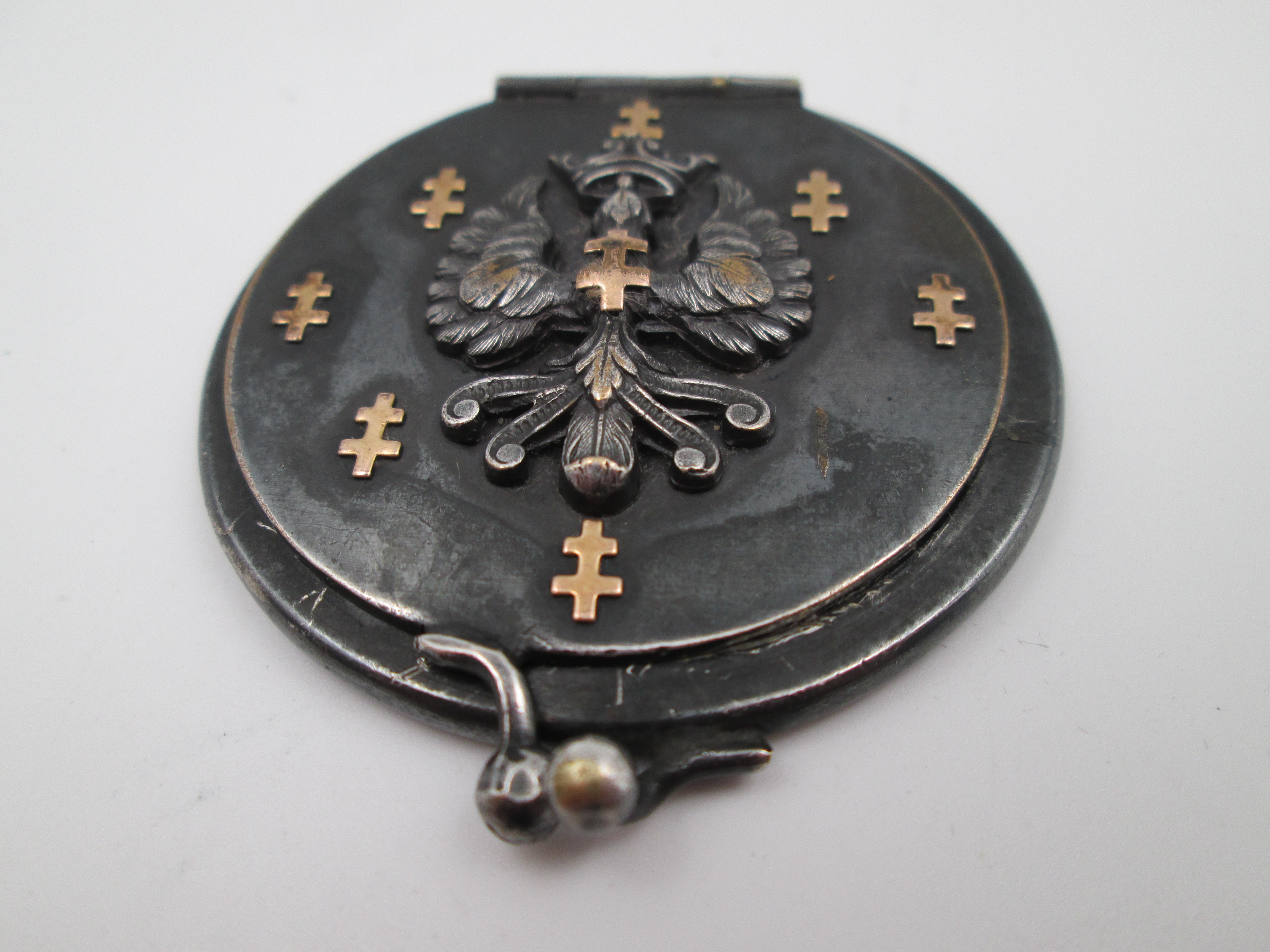 Portafotos de bolsillo unisex. Acero pavonado y detalles oro. Simbología heráldica. 1930