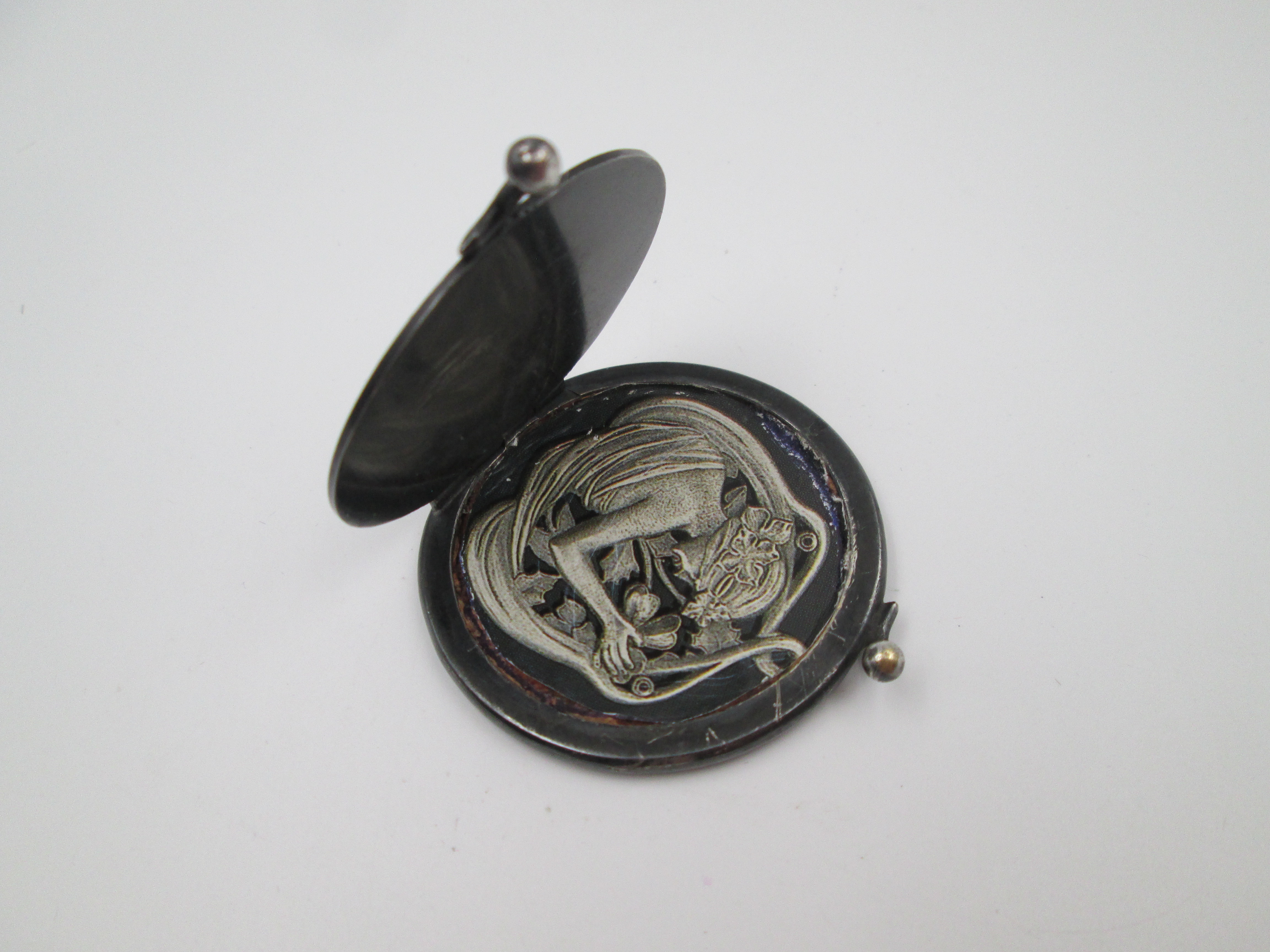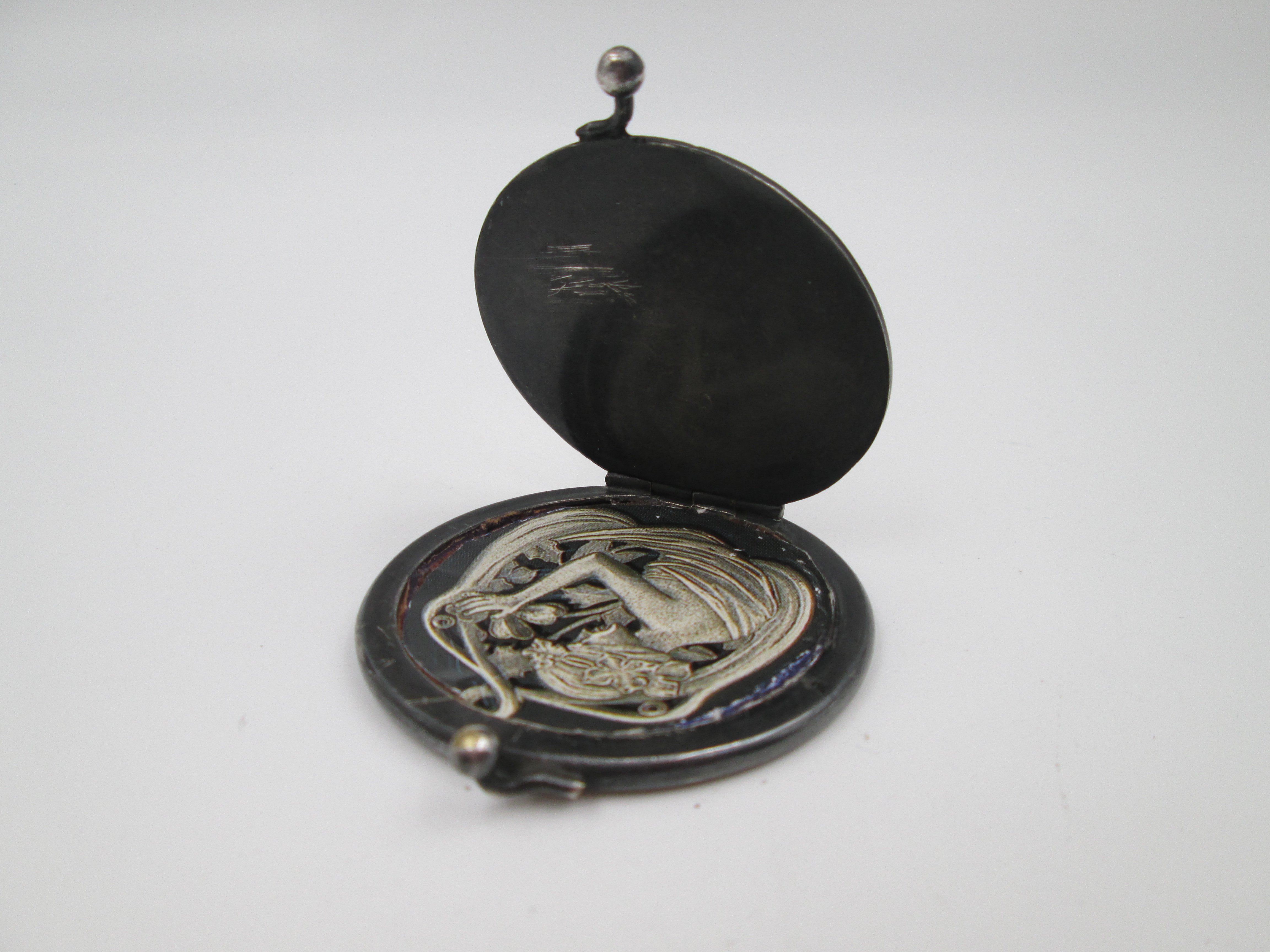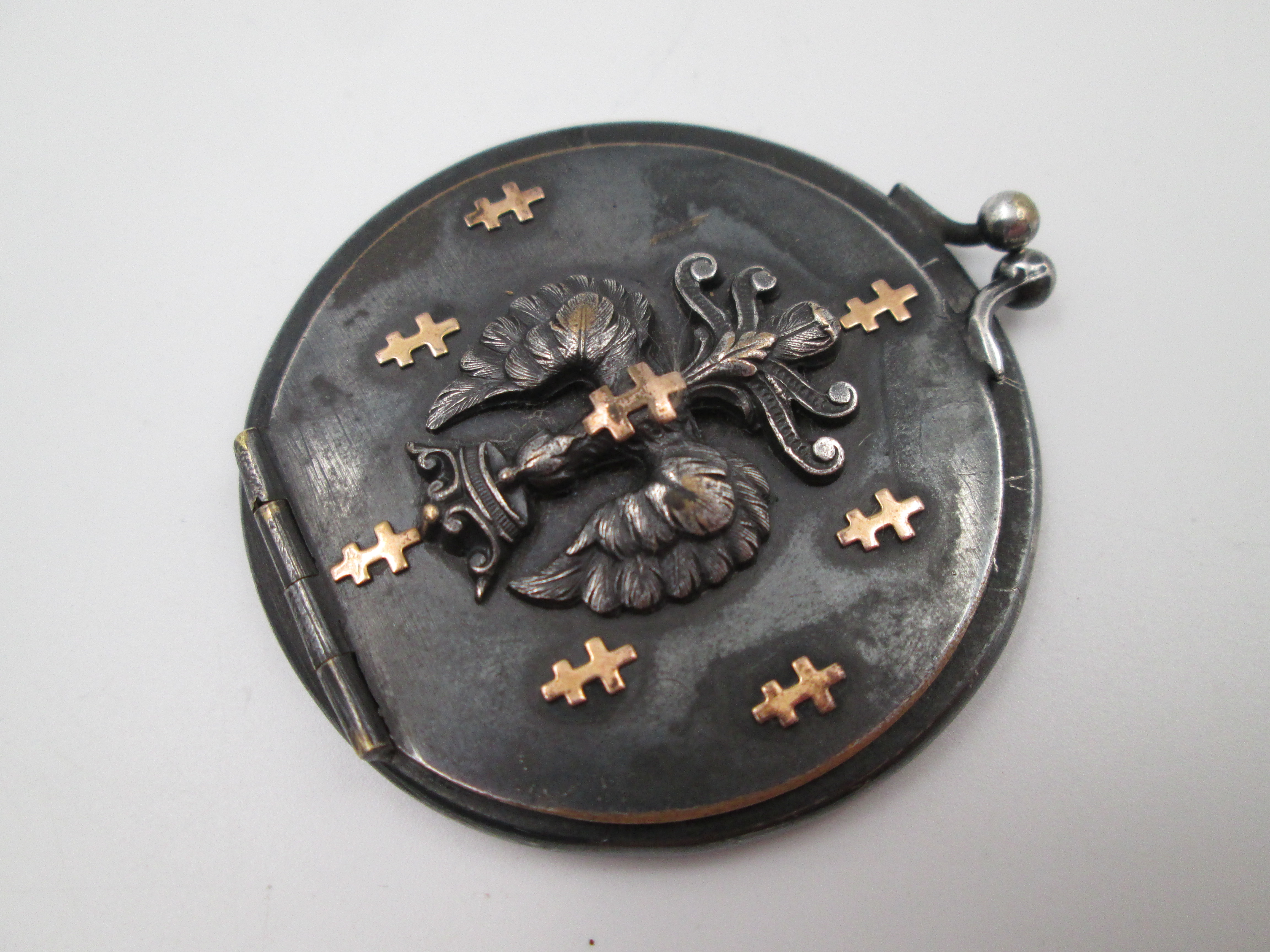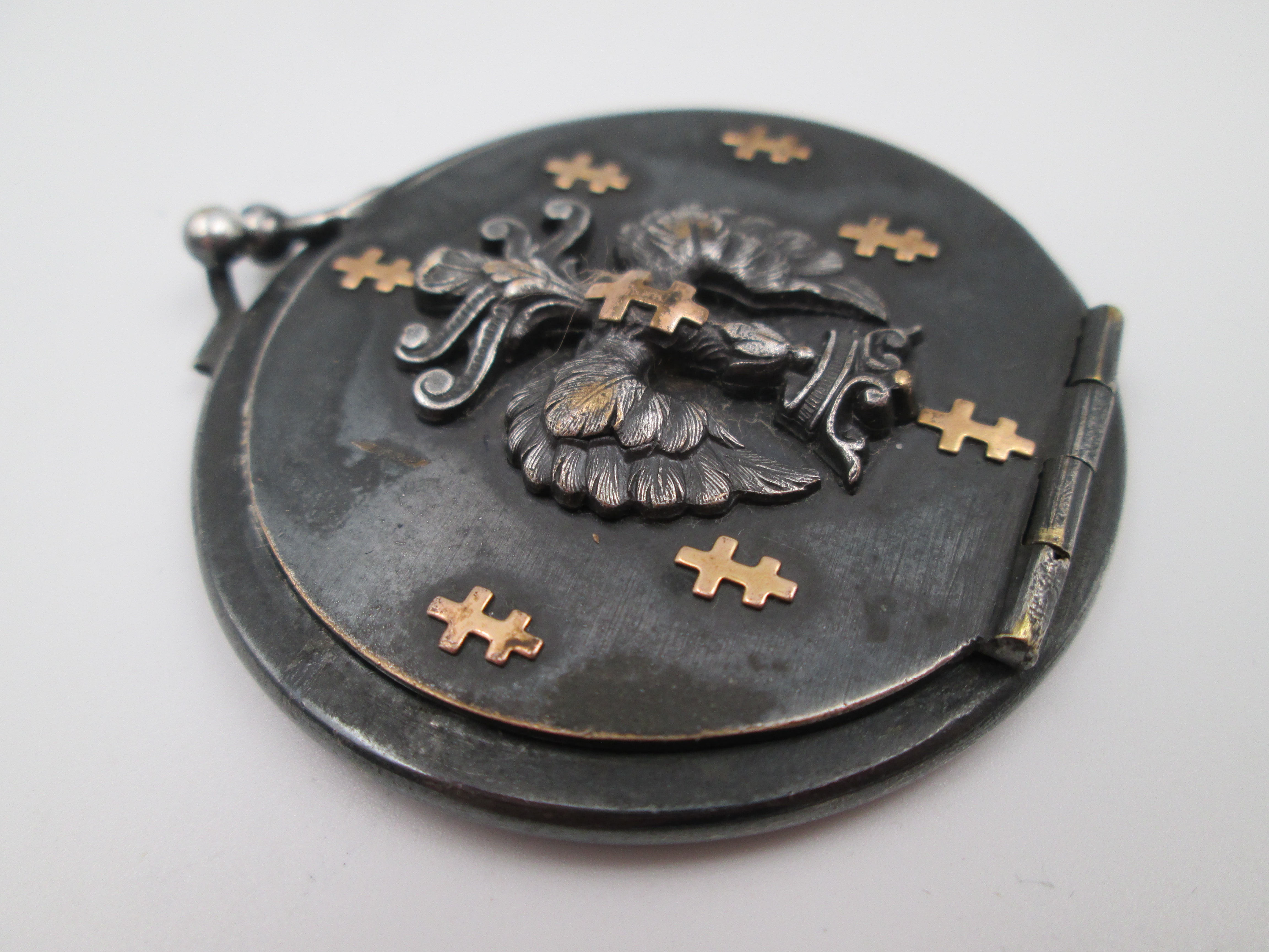 Portafotos de bolsillo unisex. Acero pavonado y detalles oro. Simbología heráldica. 1930