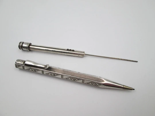 Portaminas ornamentado en plata de ley. Guilloché y volutas. Sistema rotatorio. 1920