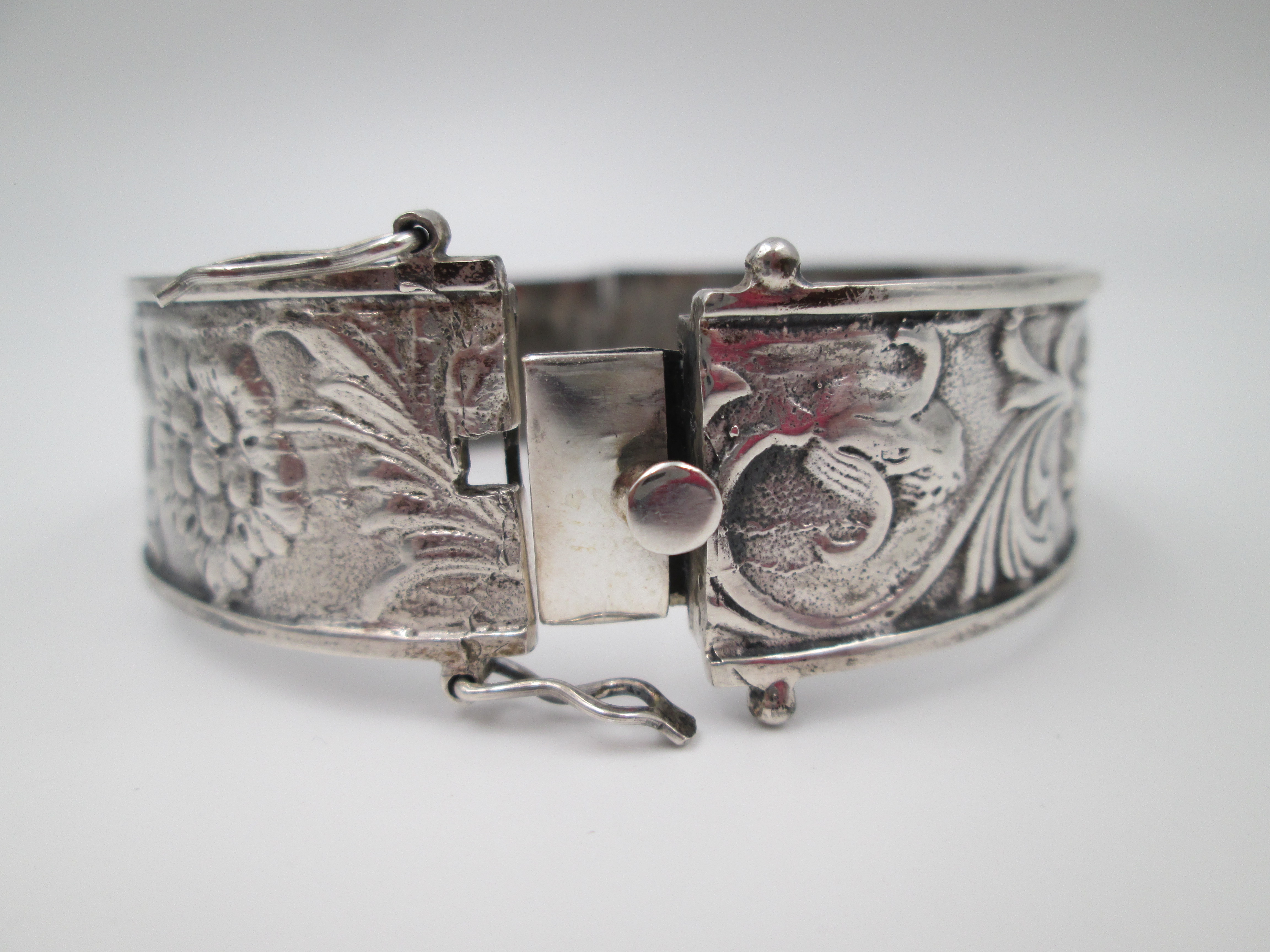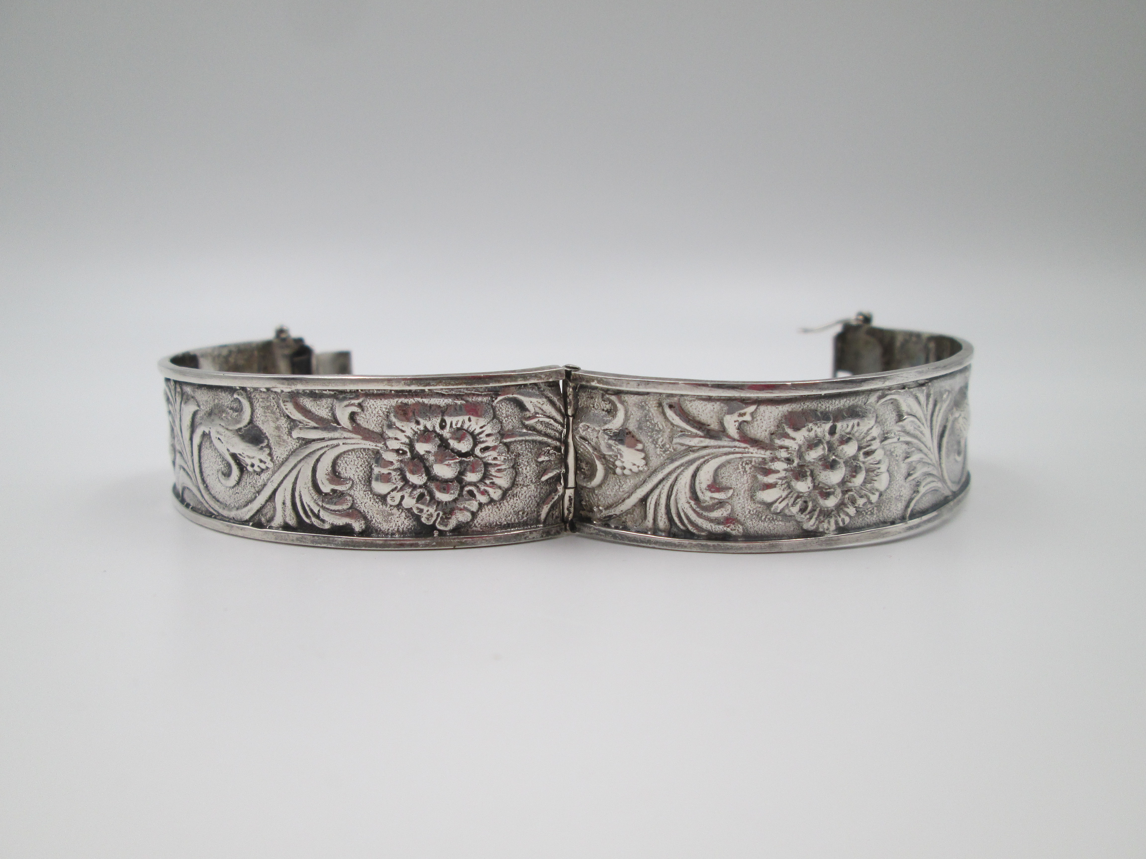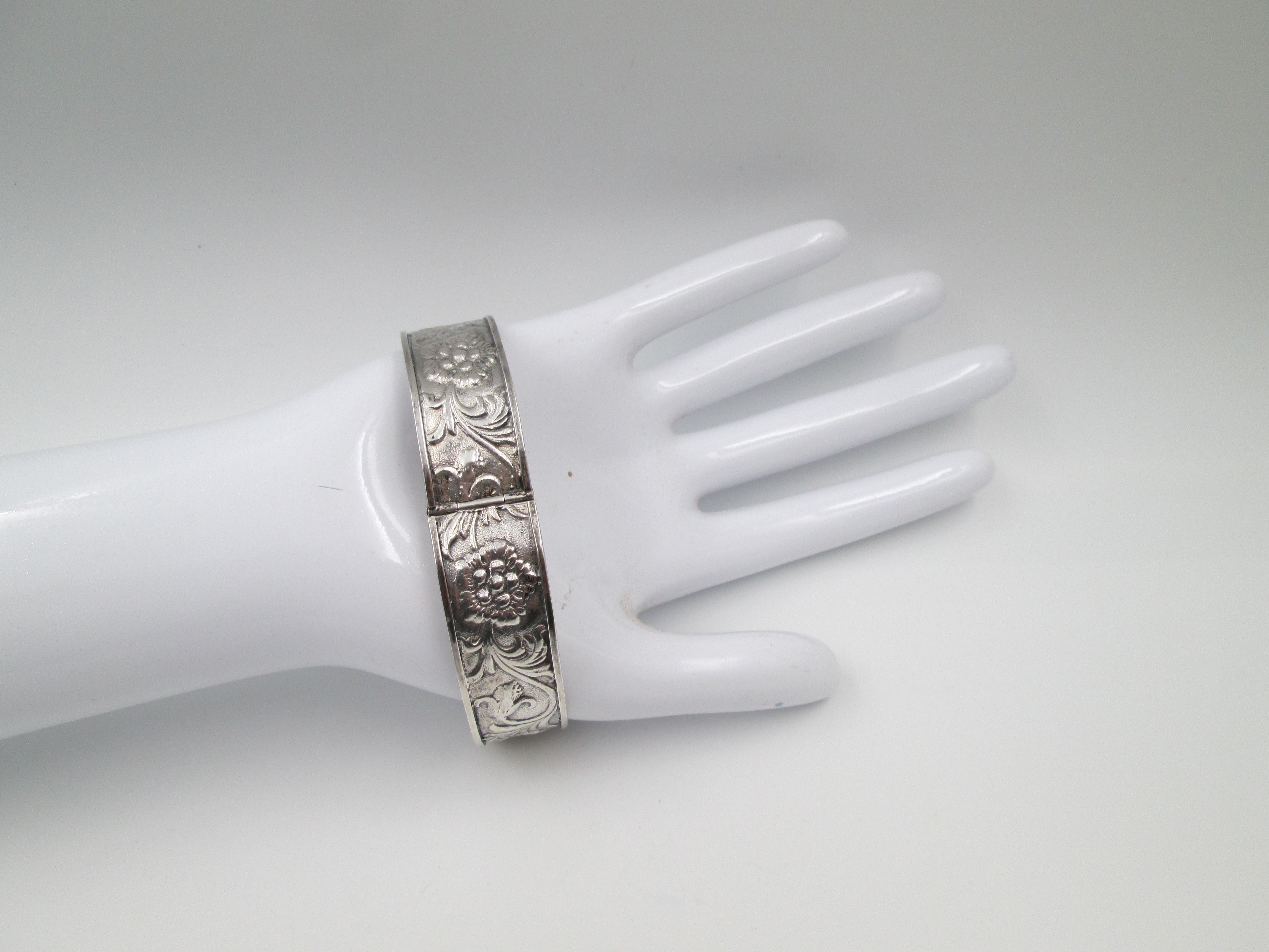 Pulsera brazalete mujer. Plata de ley. Motivos florales y vegetales. Cierre de pestaña. 1980