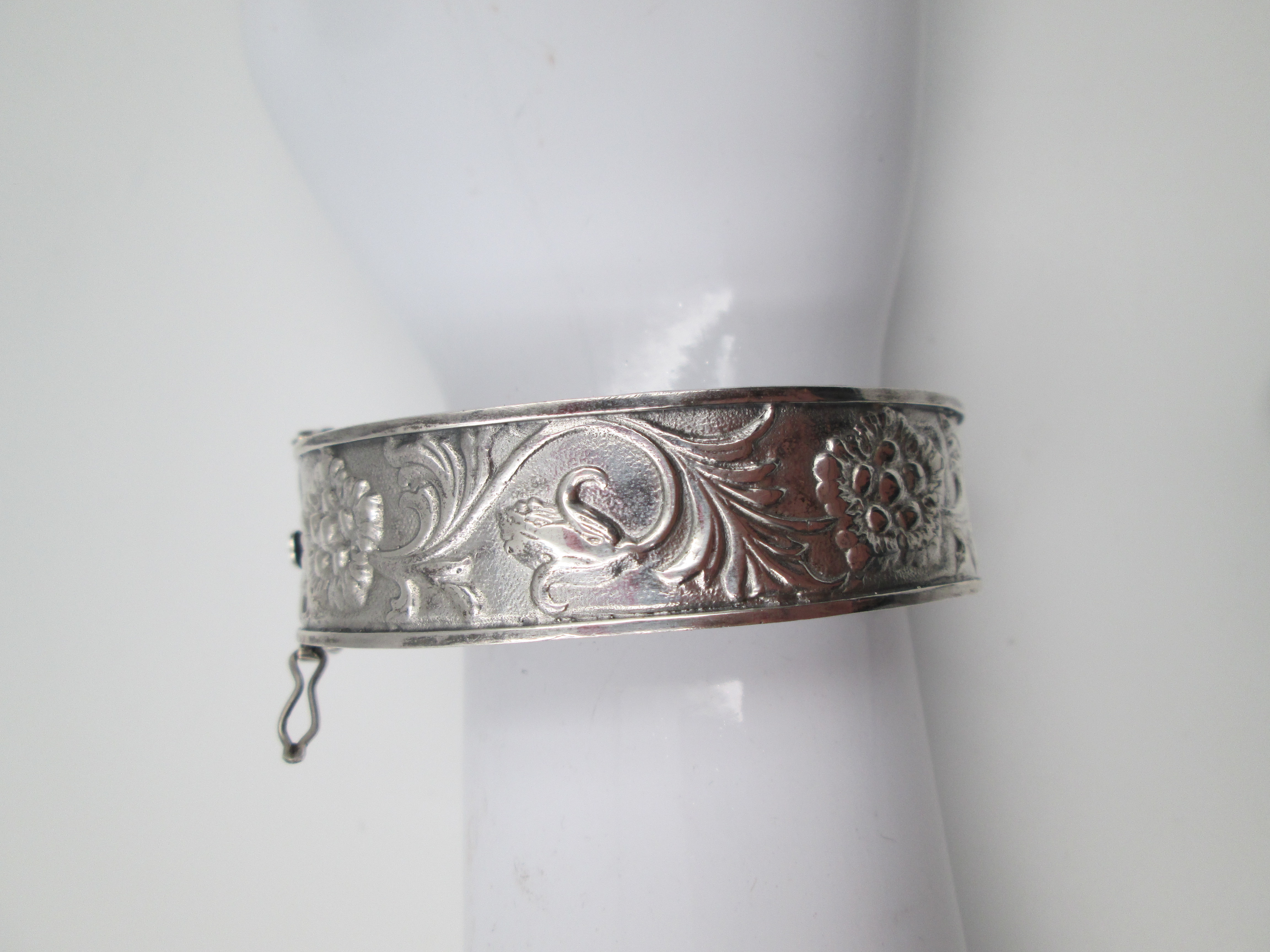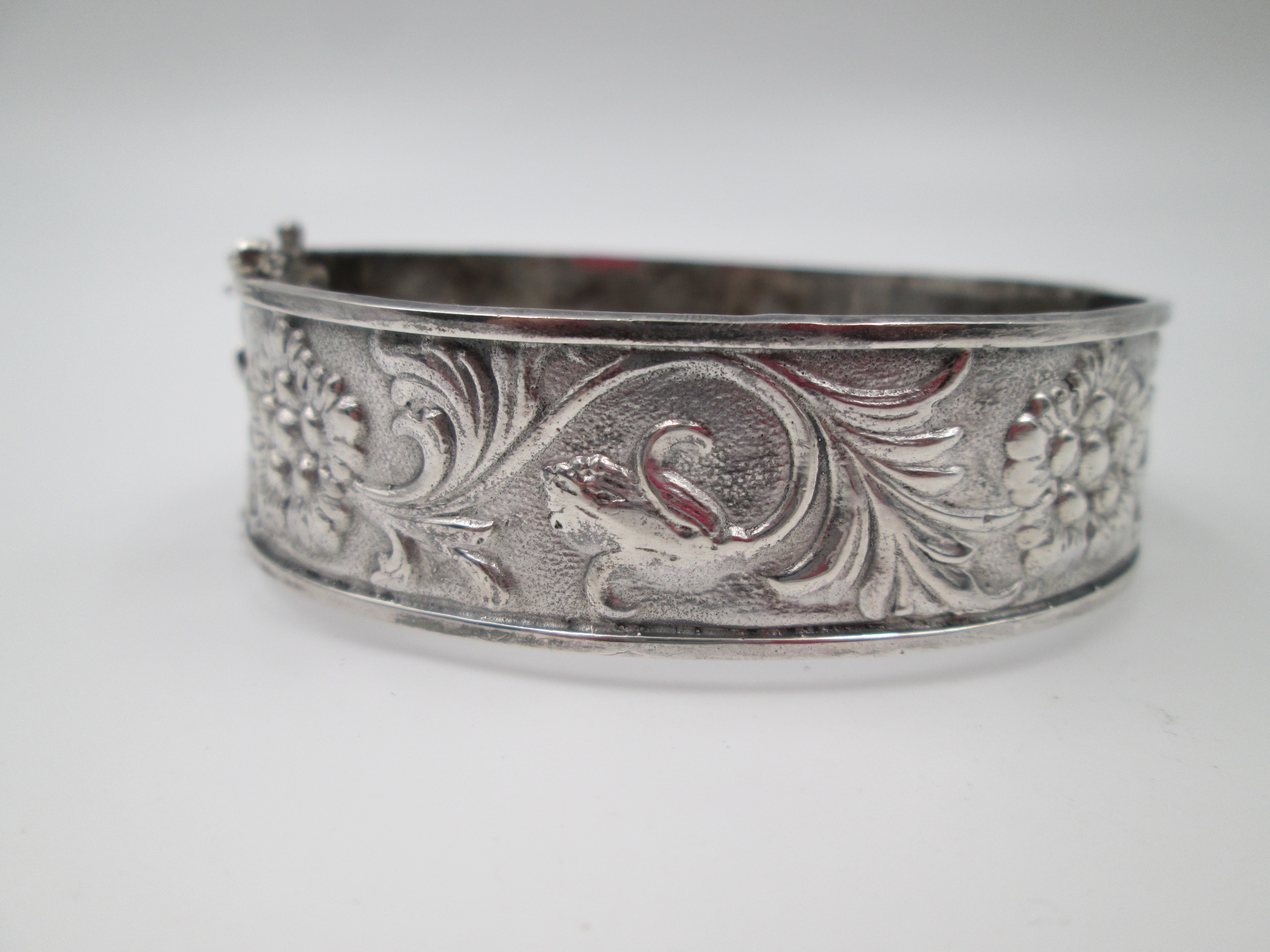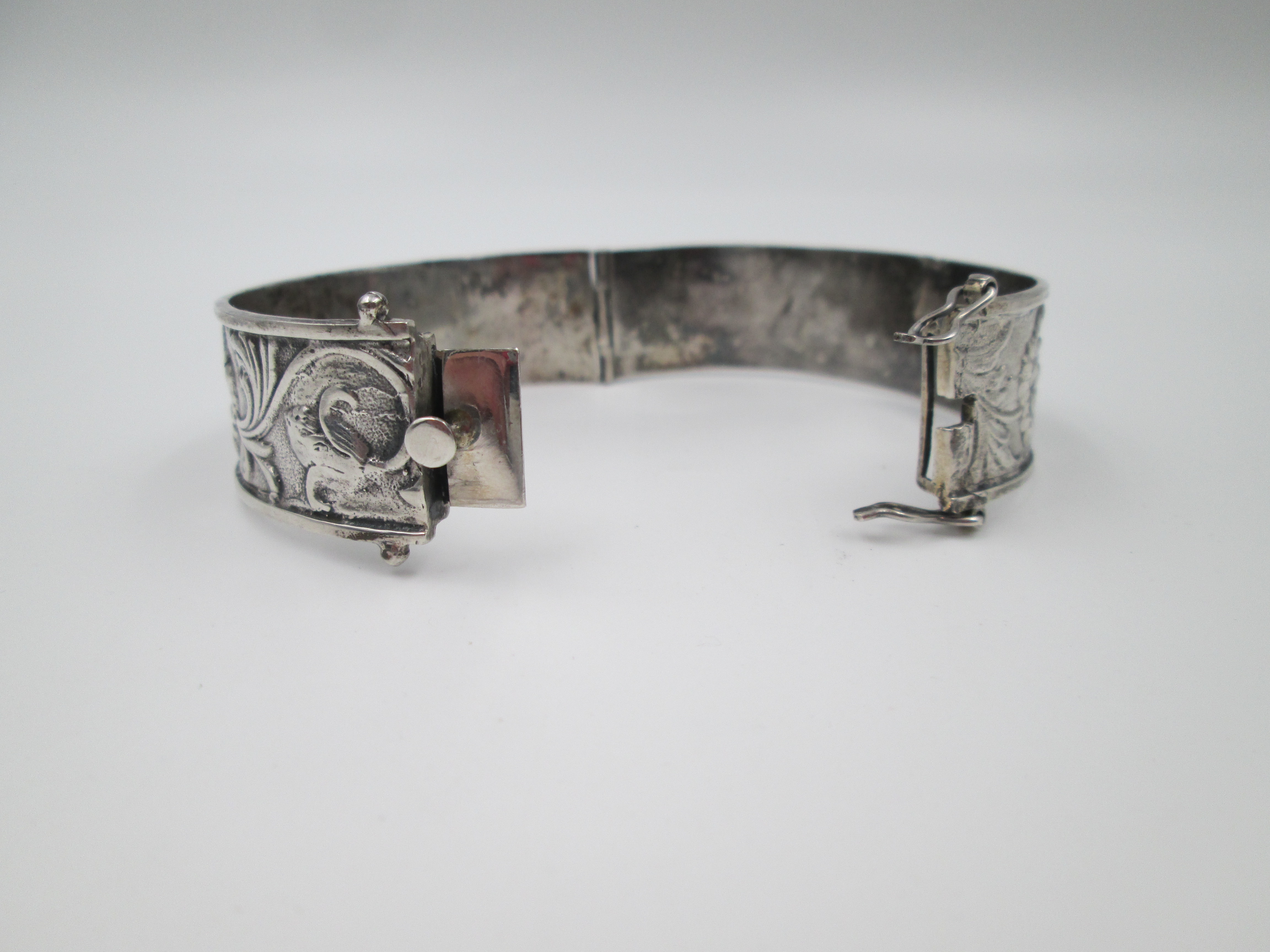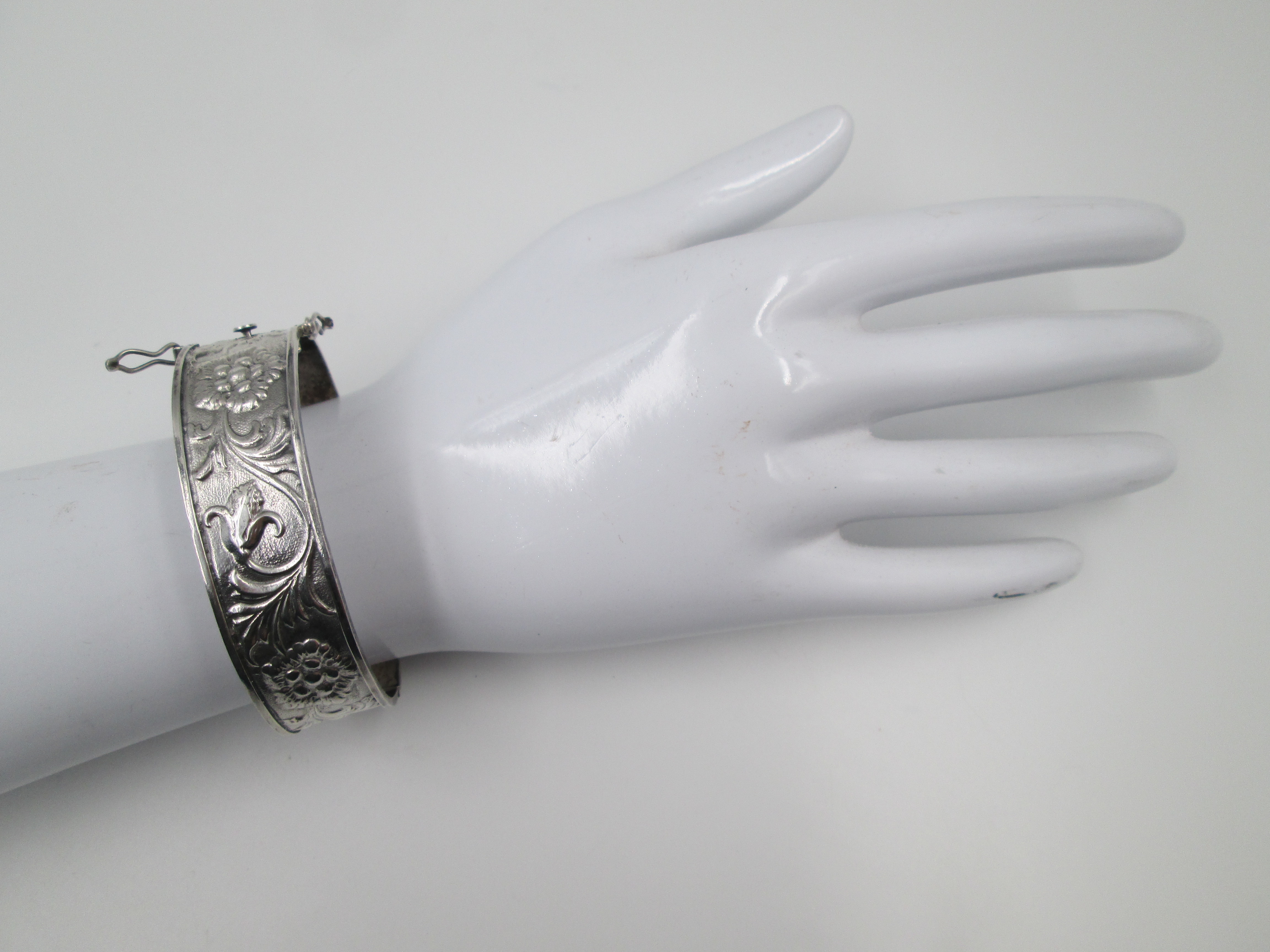 Pulsera brazalete mujer. Plata de ley. Motivos florales y vegetales. Cierre de pestaña. 1980