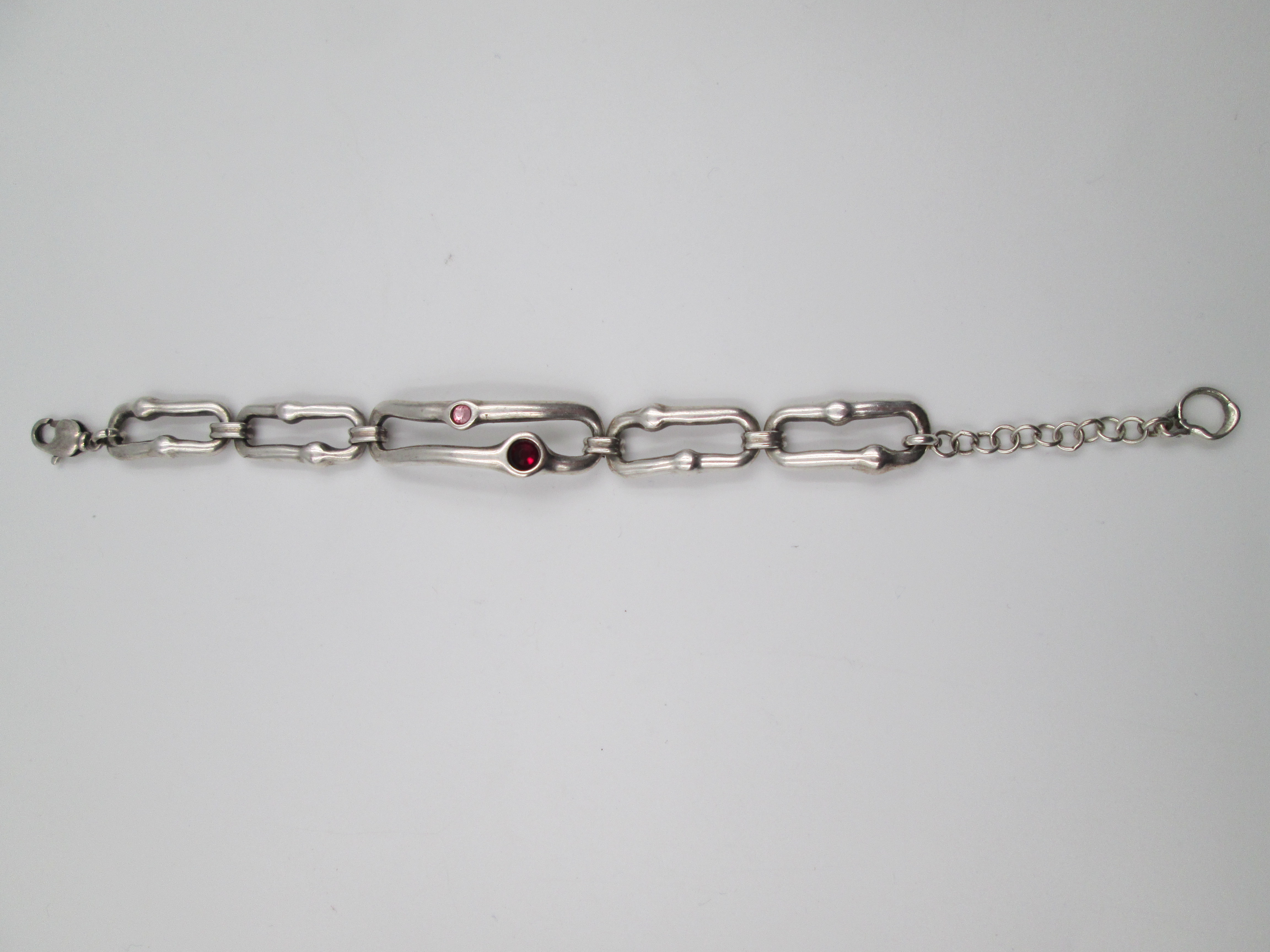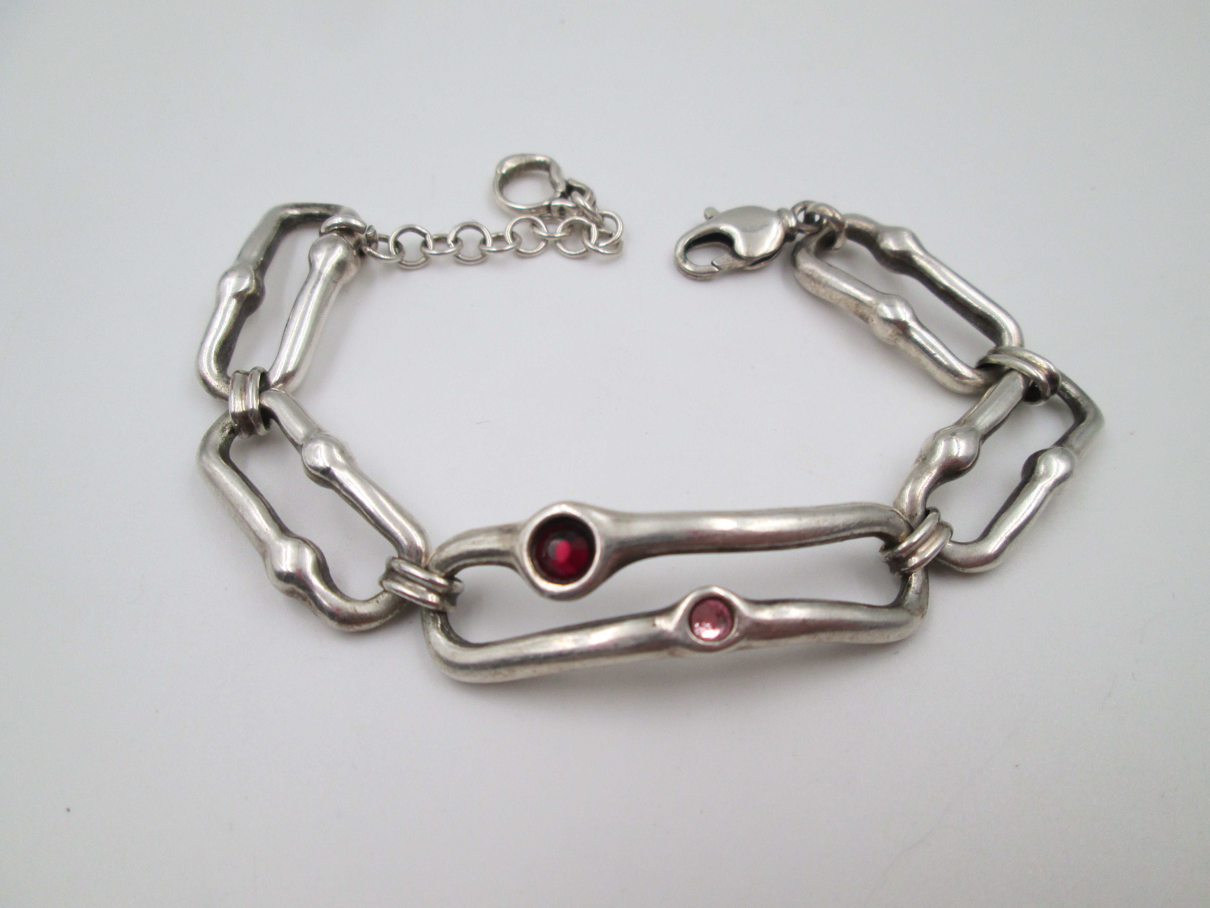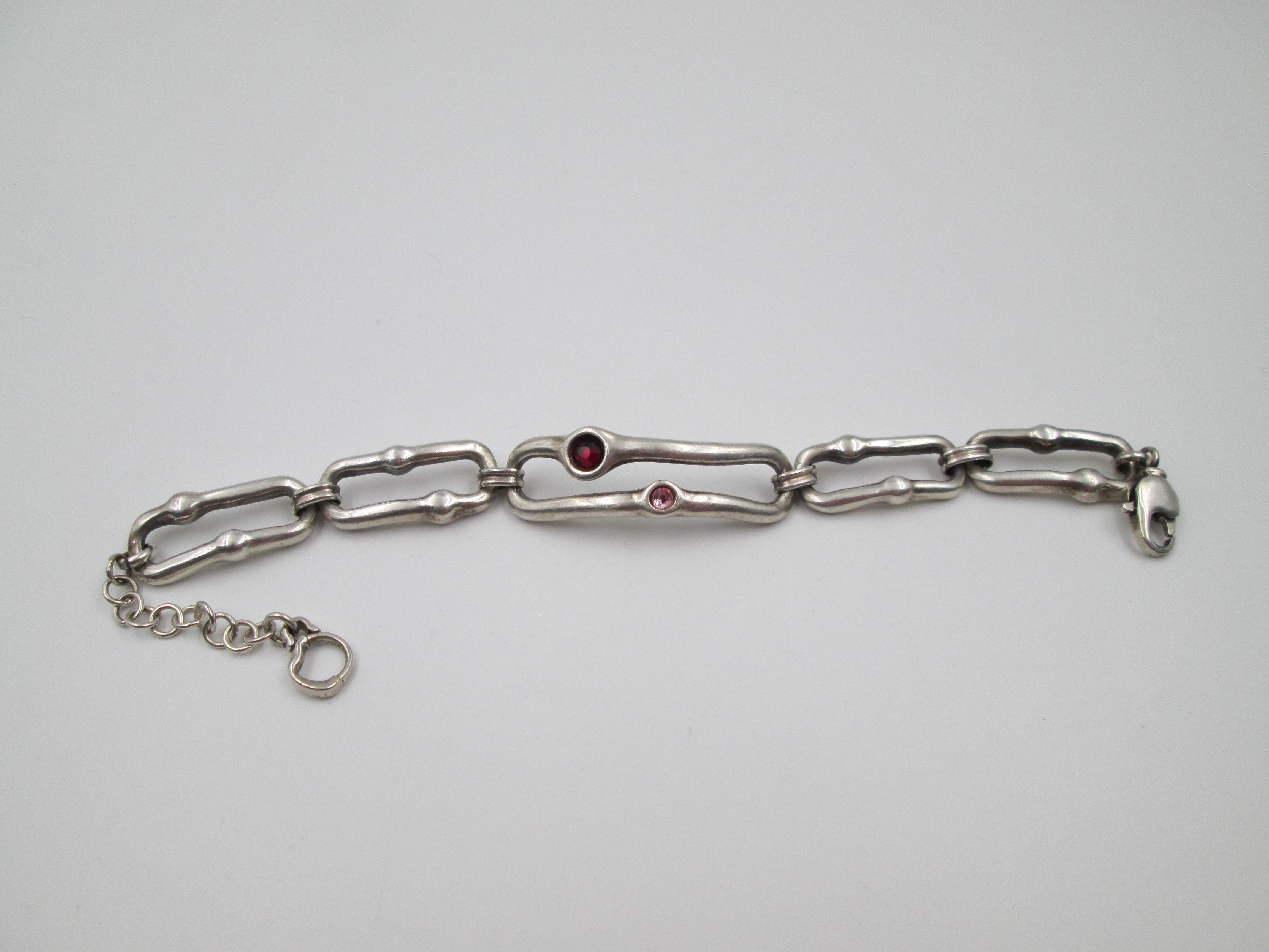 Pulsera mujer plata ley. Eslabones rectangulares calados. Gemas de colores. 1980