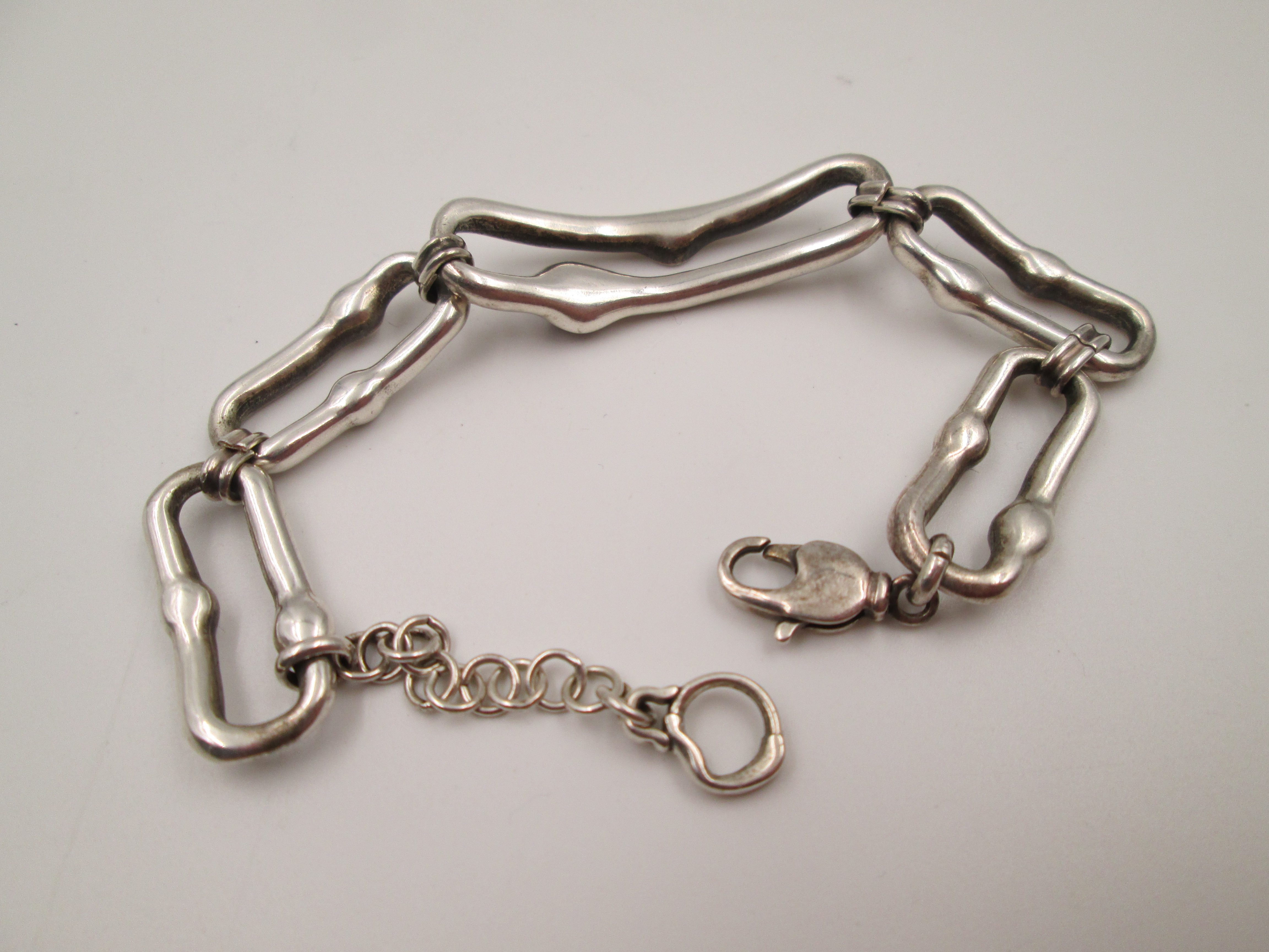 La unidad viene acabada en plata de ley y se compone de eslabones rectangulares calados.