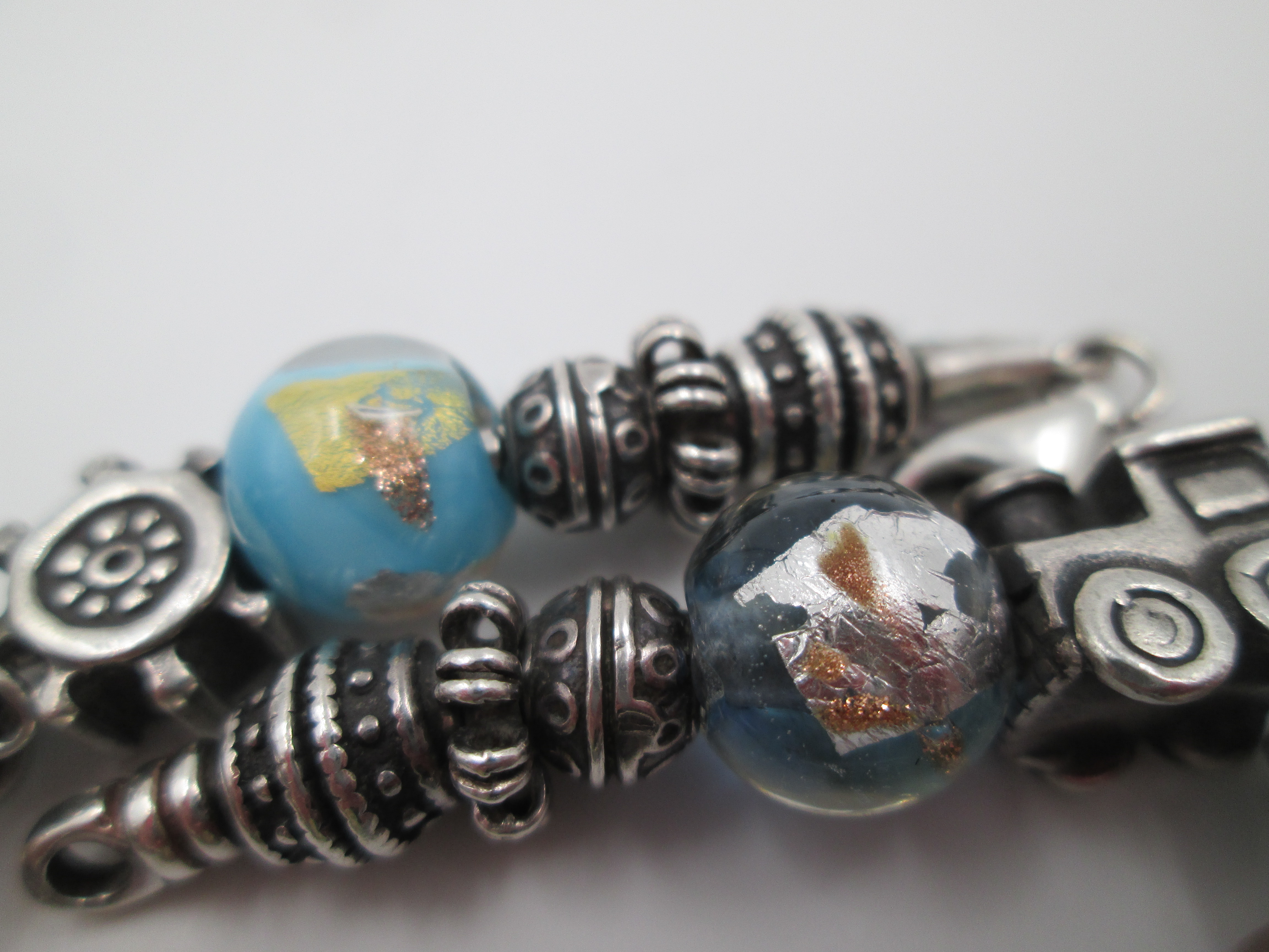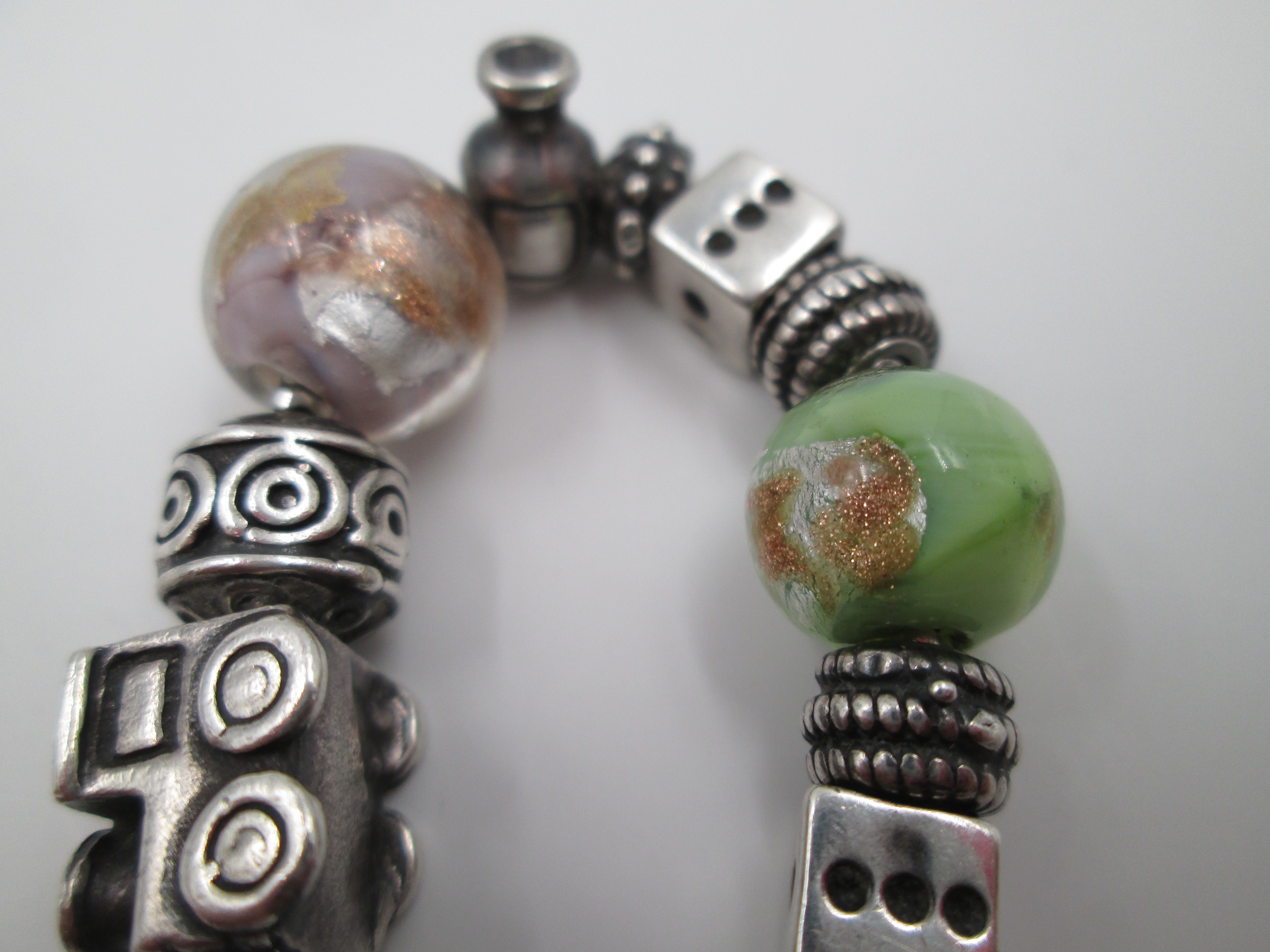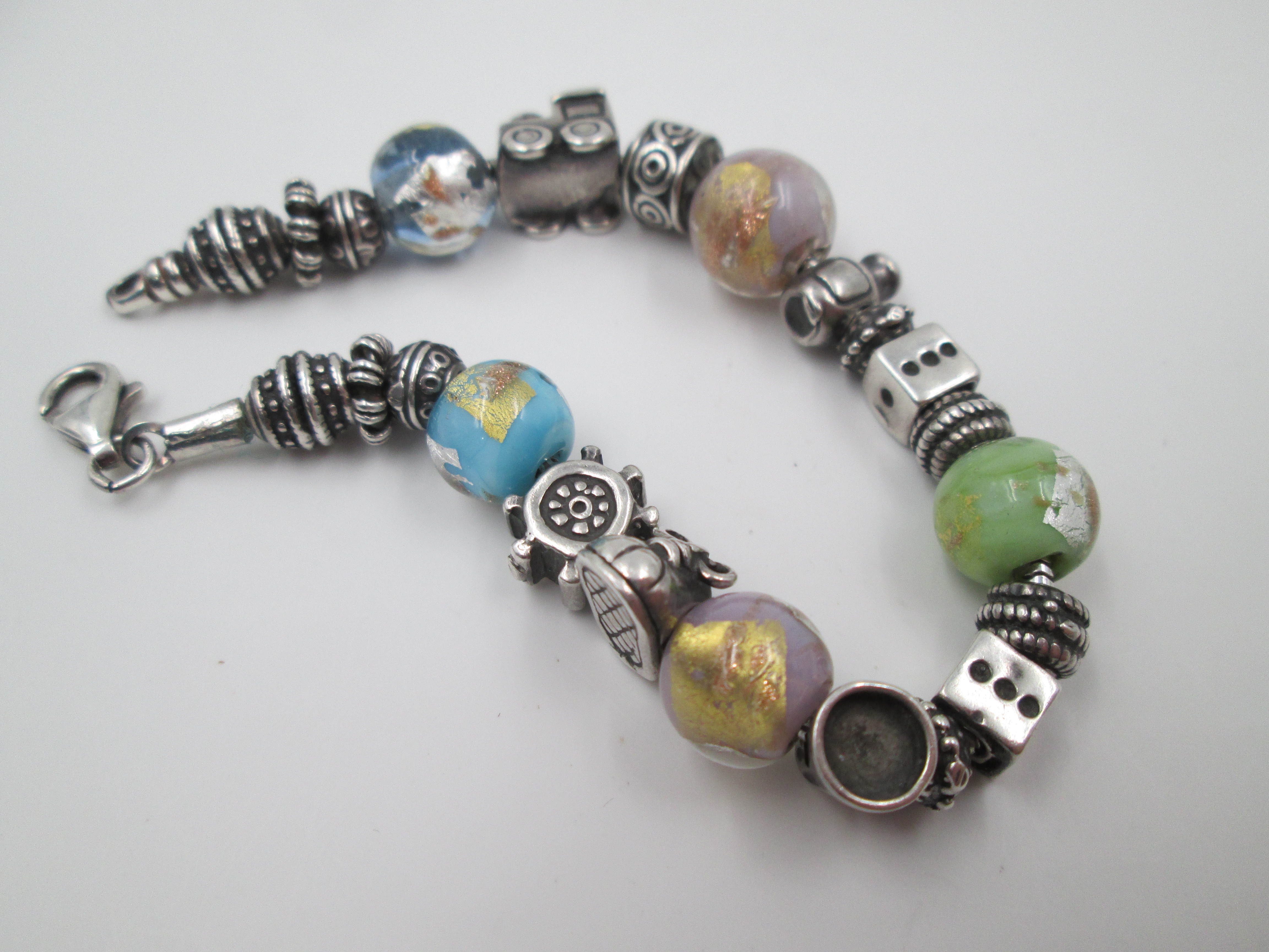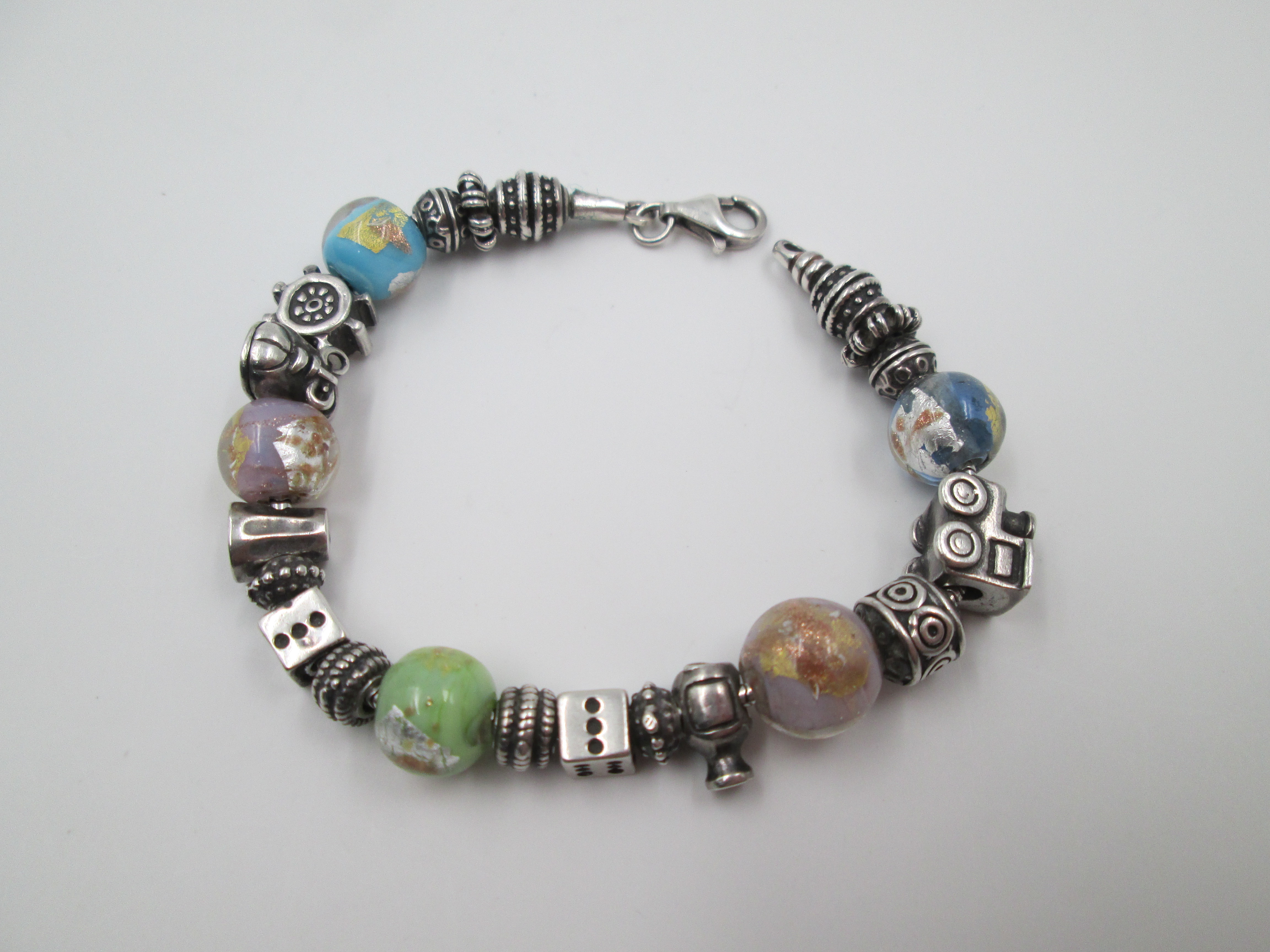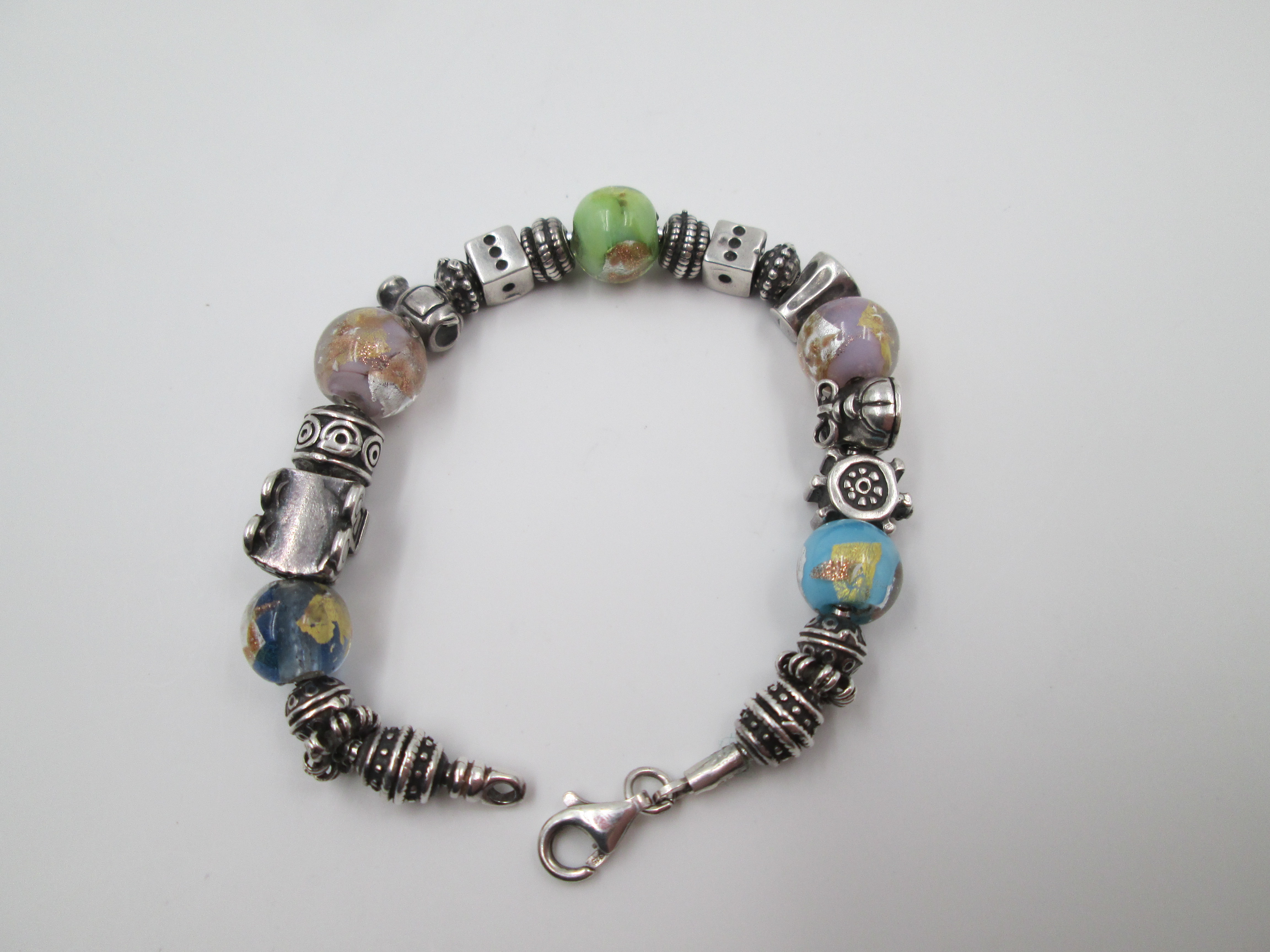 Pulsera plata de ley. Colgantes y esferas cristal de colores. Italia. 2010