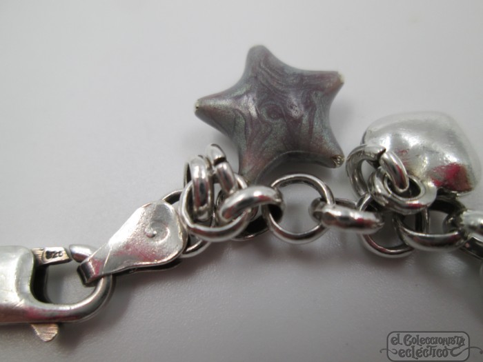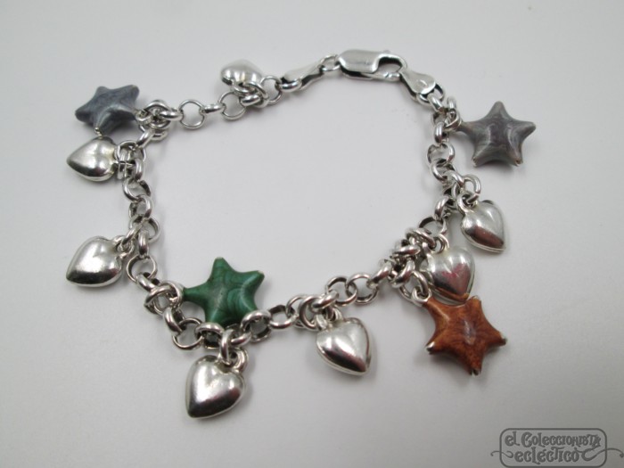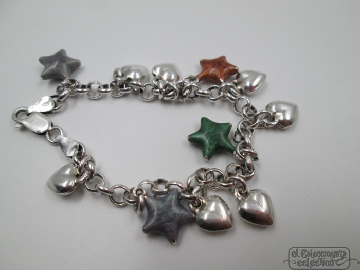 Pulsera plata de ley 925. Años 90. Corazones y estrellas. Esmalte