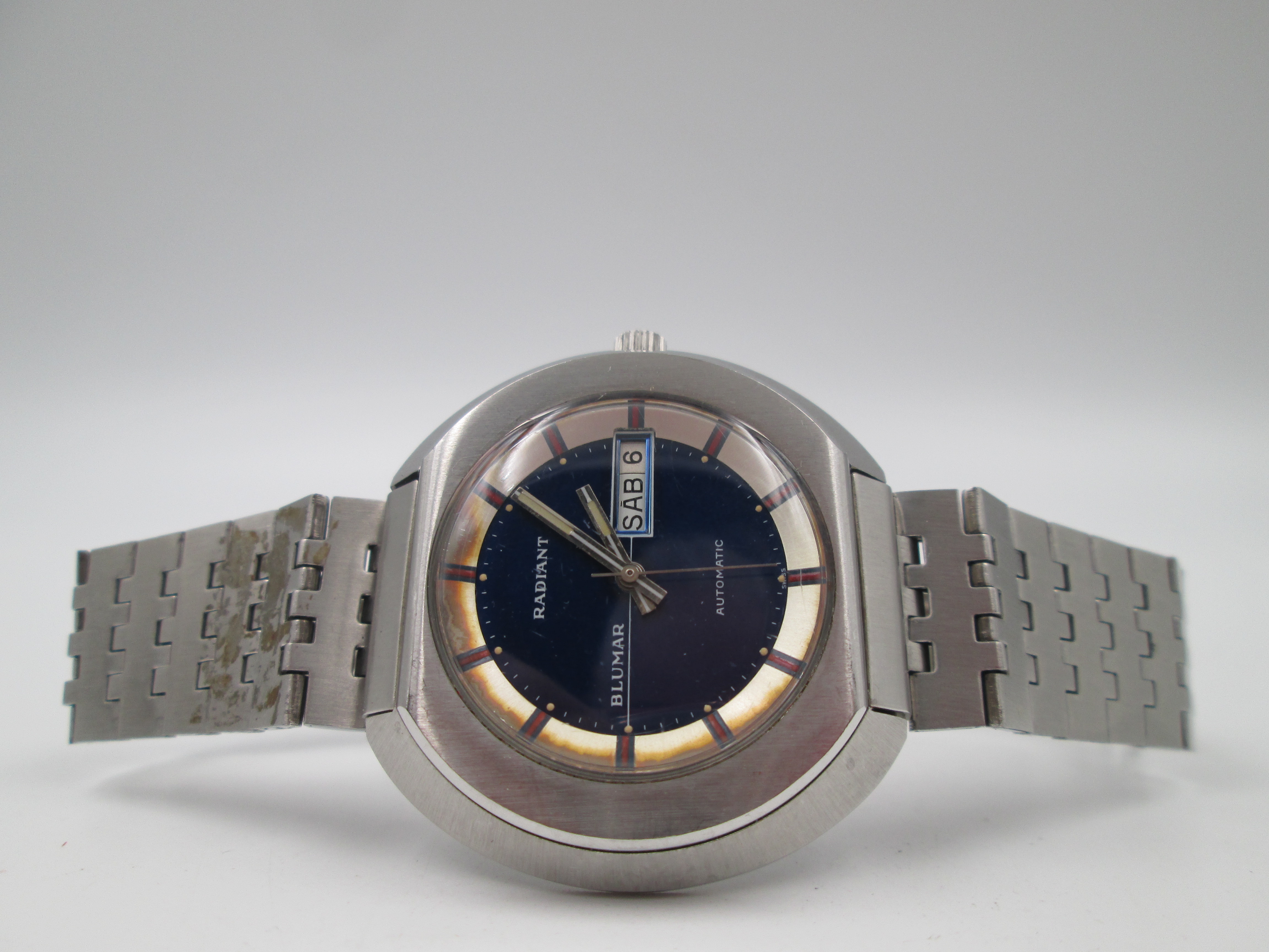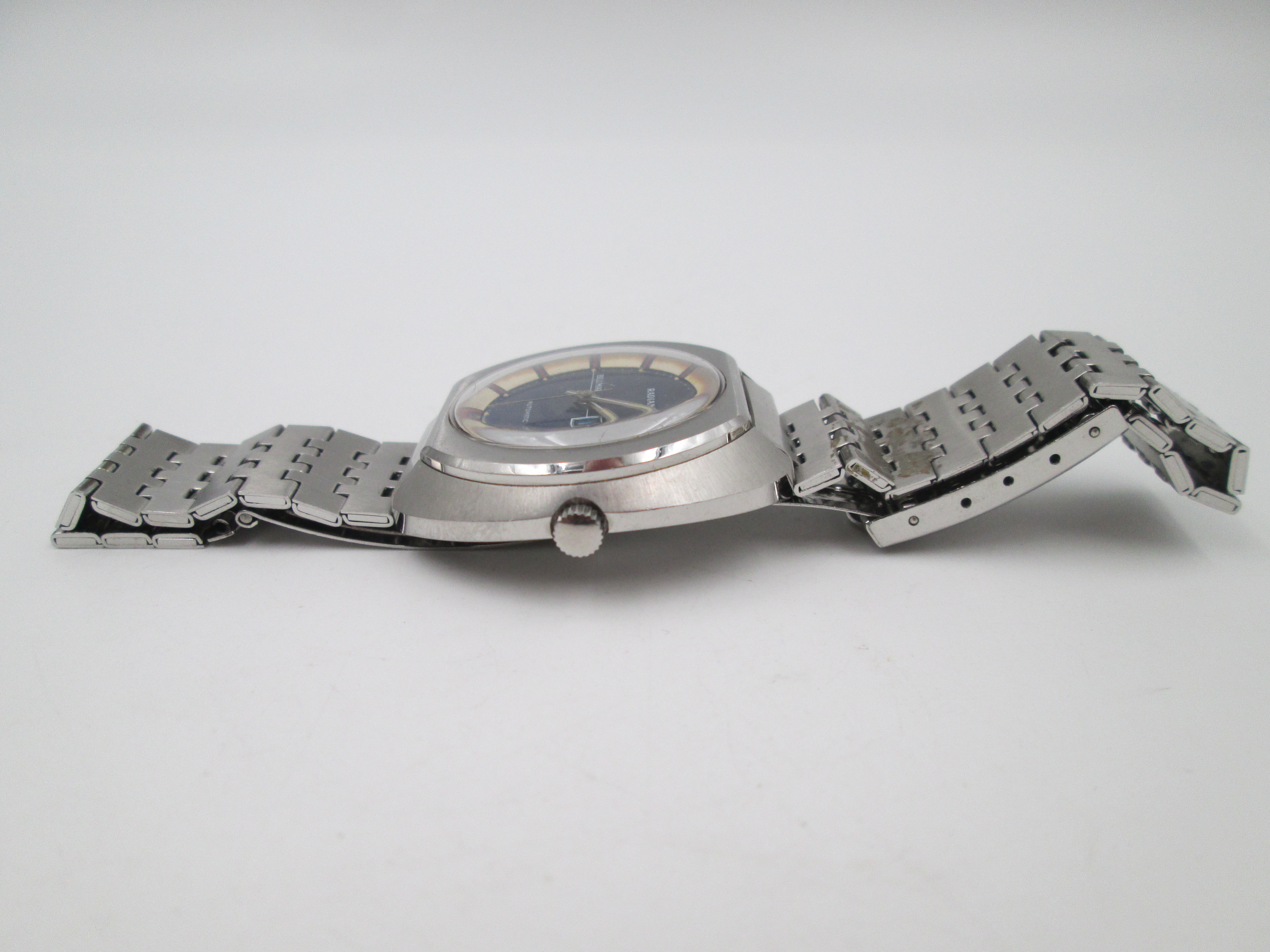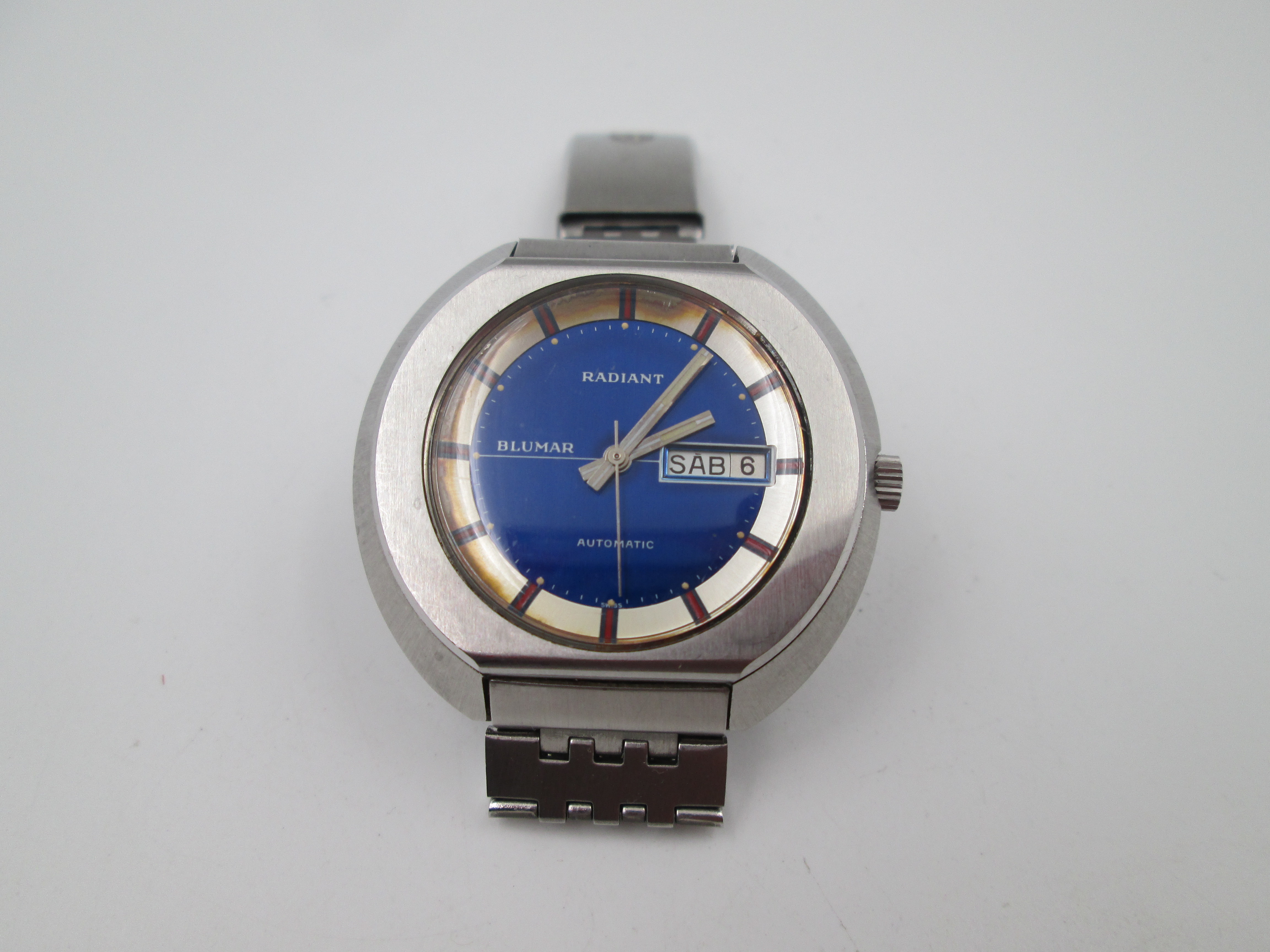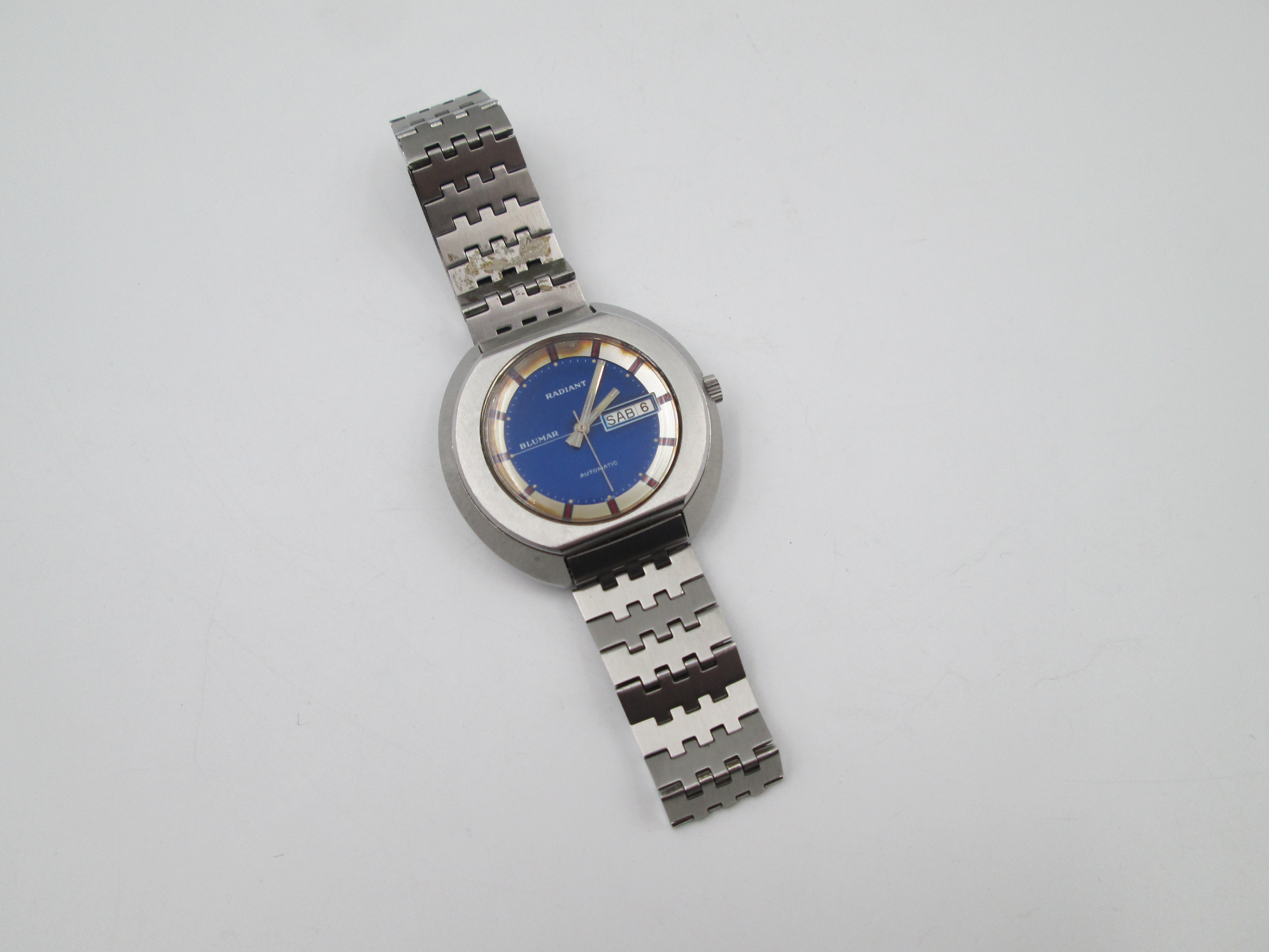 Radiant Blumar. Acero. Caja elíptica. Automático. Calendario. Brazalete. 1970