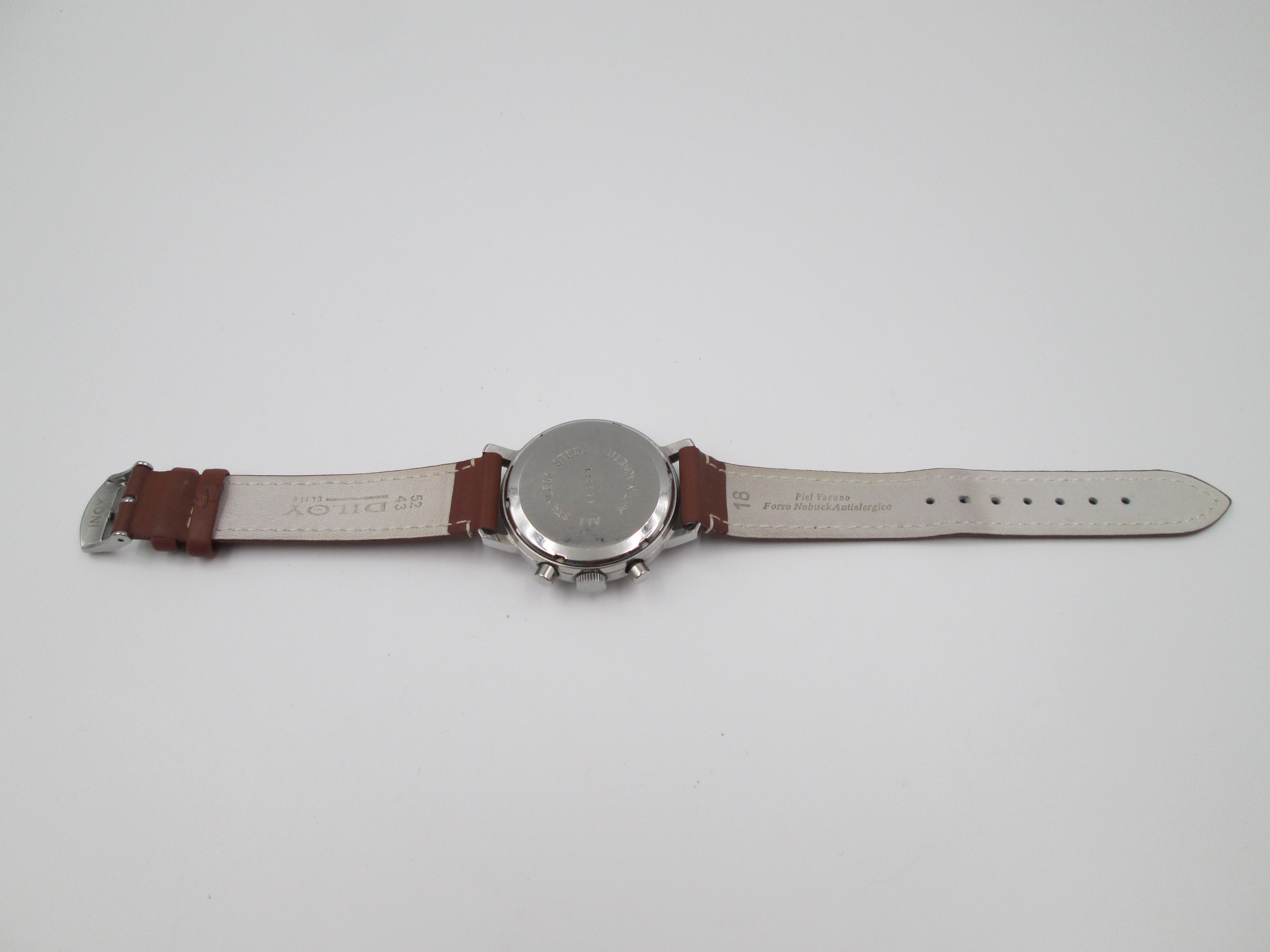 Se suministra con una correa de piel marrón y hebilla plateada y mide 4,1 centímetros de largo por 3,5 de diámetro, sin contar la corona y los pulsadores, y 0,9 de grosor y pesa 50 gramos.