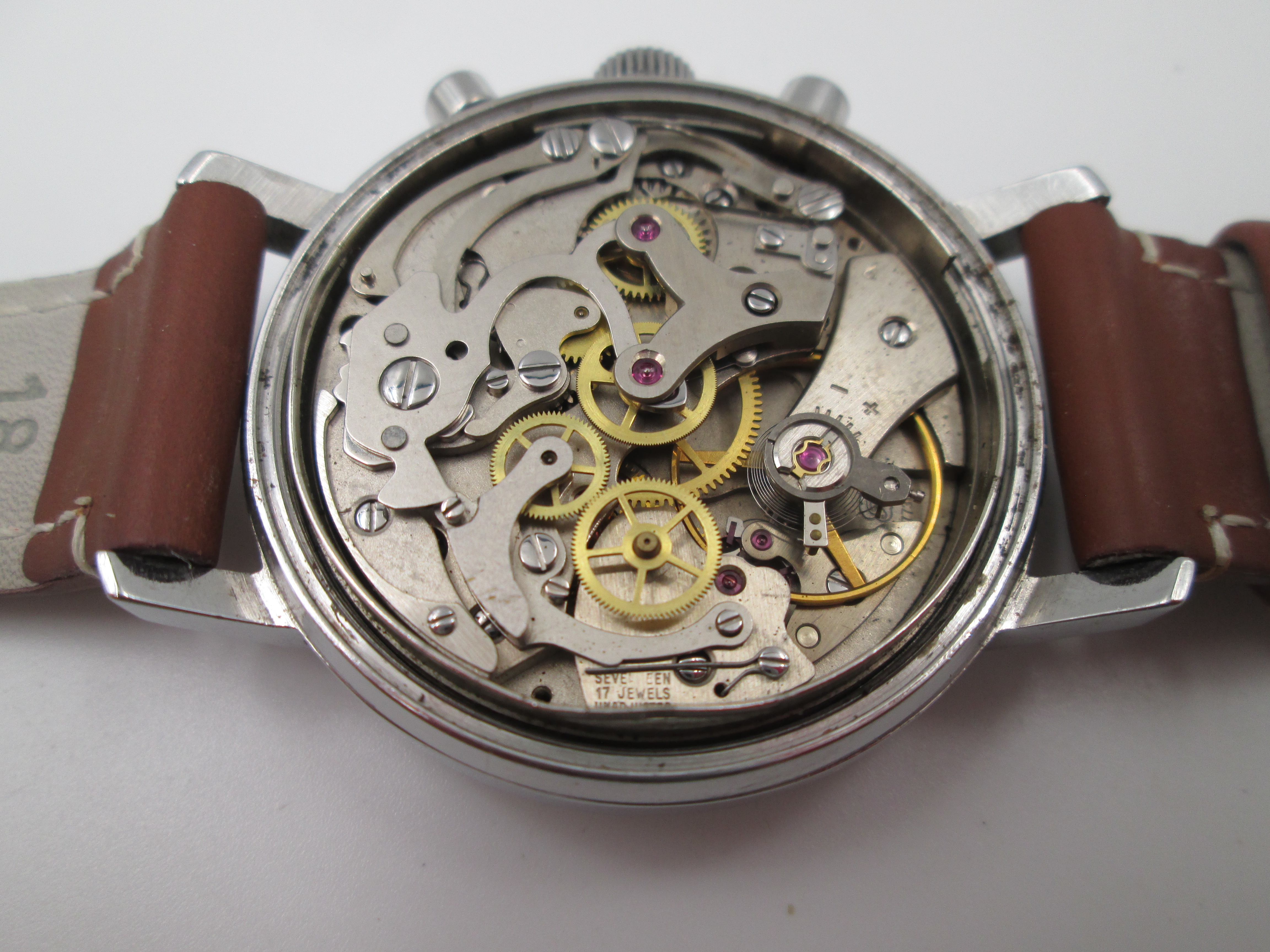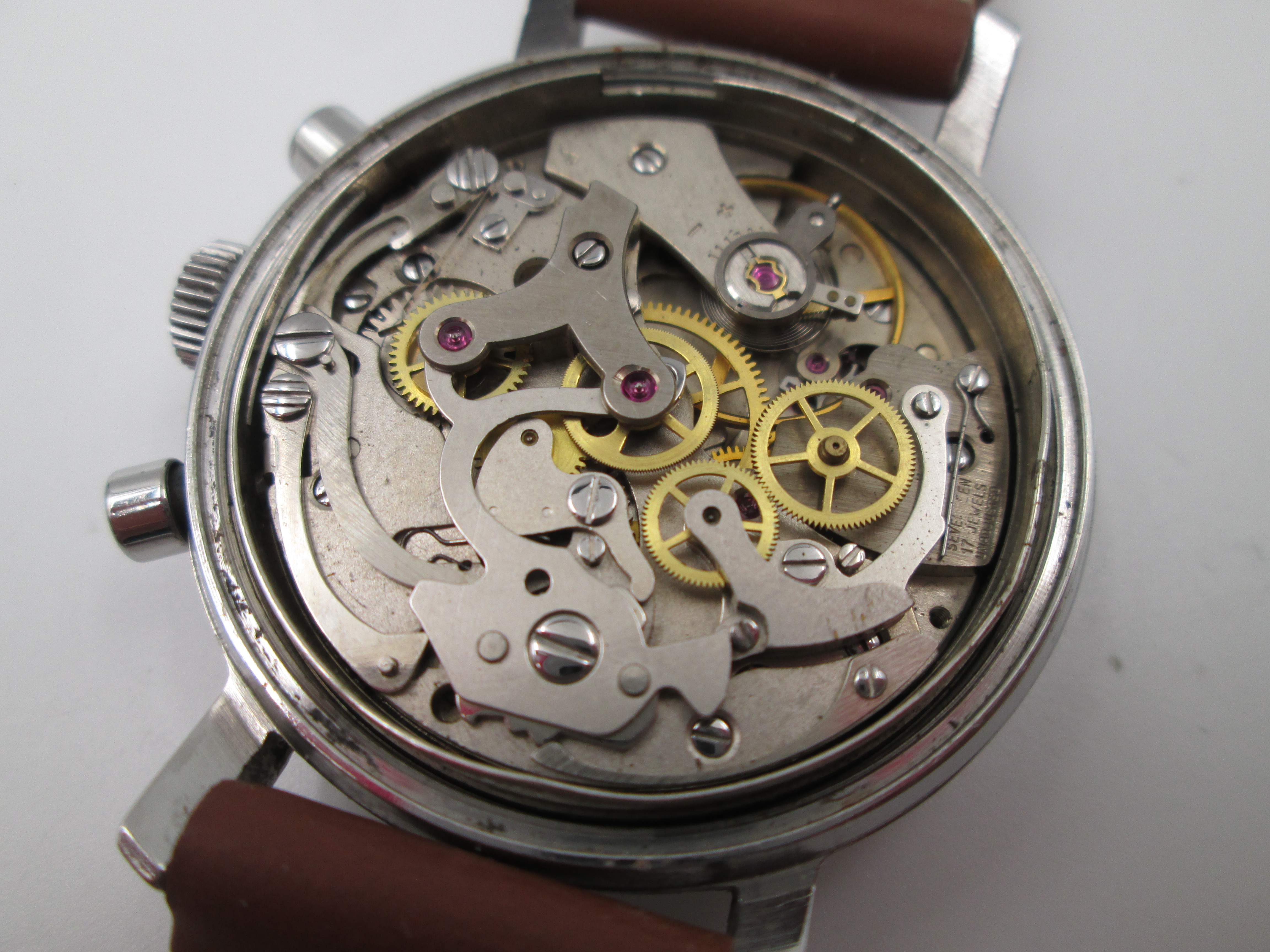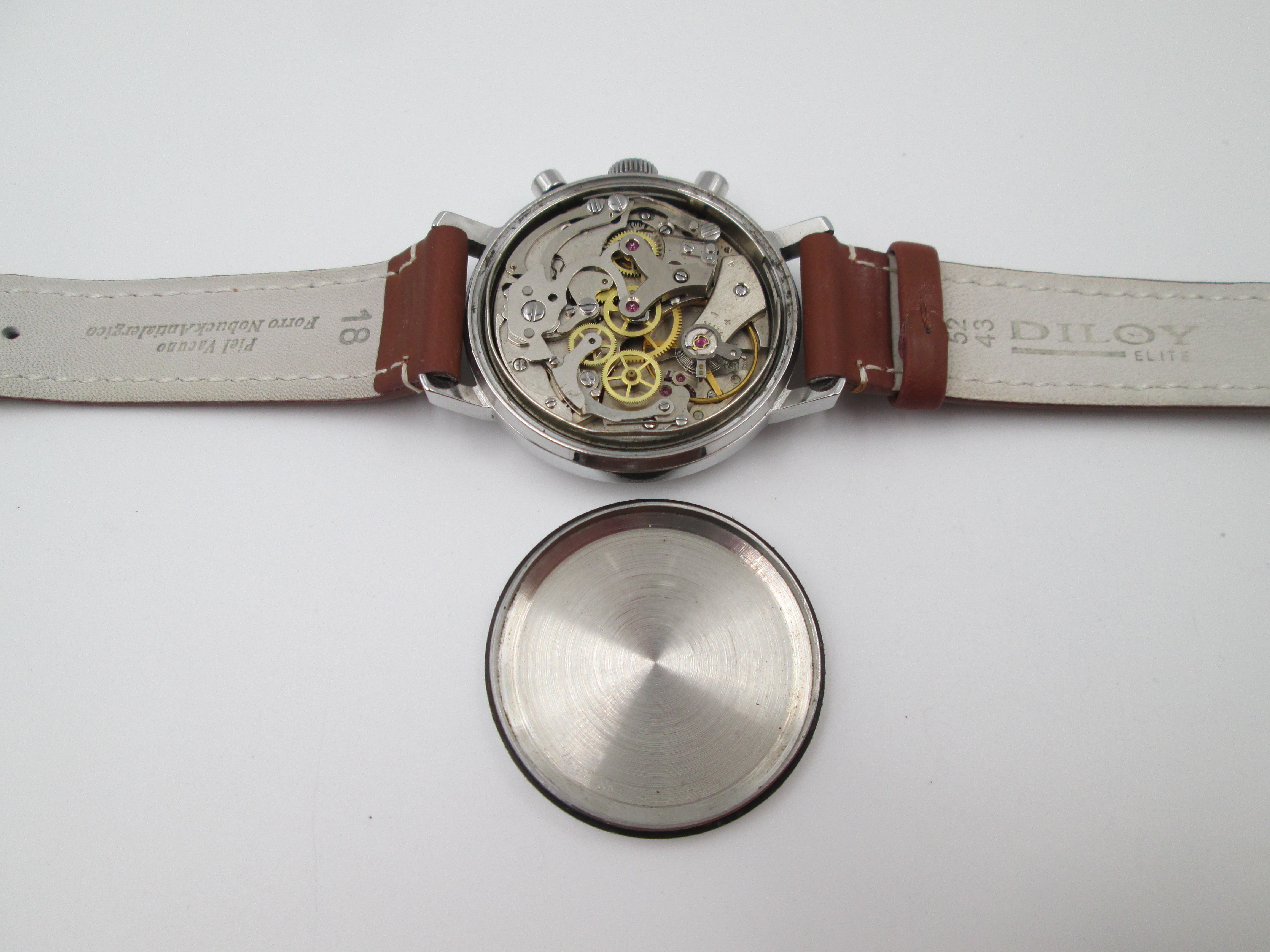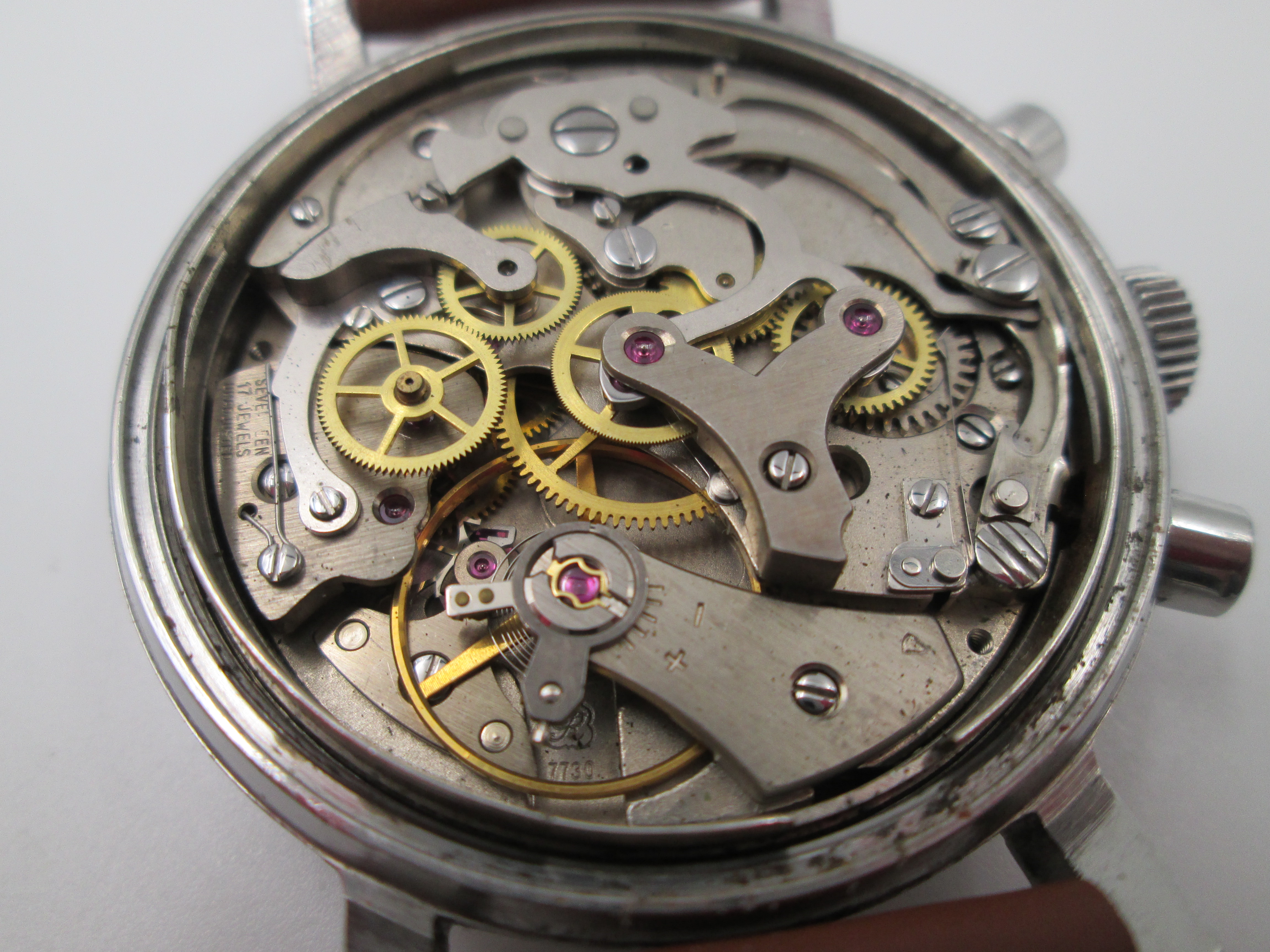 Equipa un mecanismo suizo antimagnético de cuerda manual sobre 17 gemas (Valjoux 7730), con 45 horas de reserva de marcha y sistema Incabloc.