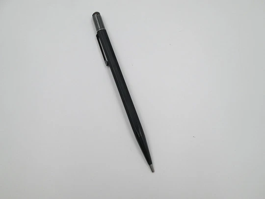 El lapicero mecánico viene acabado en plástico negro facetado y lleva los detalles rematados en metal niquelado.