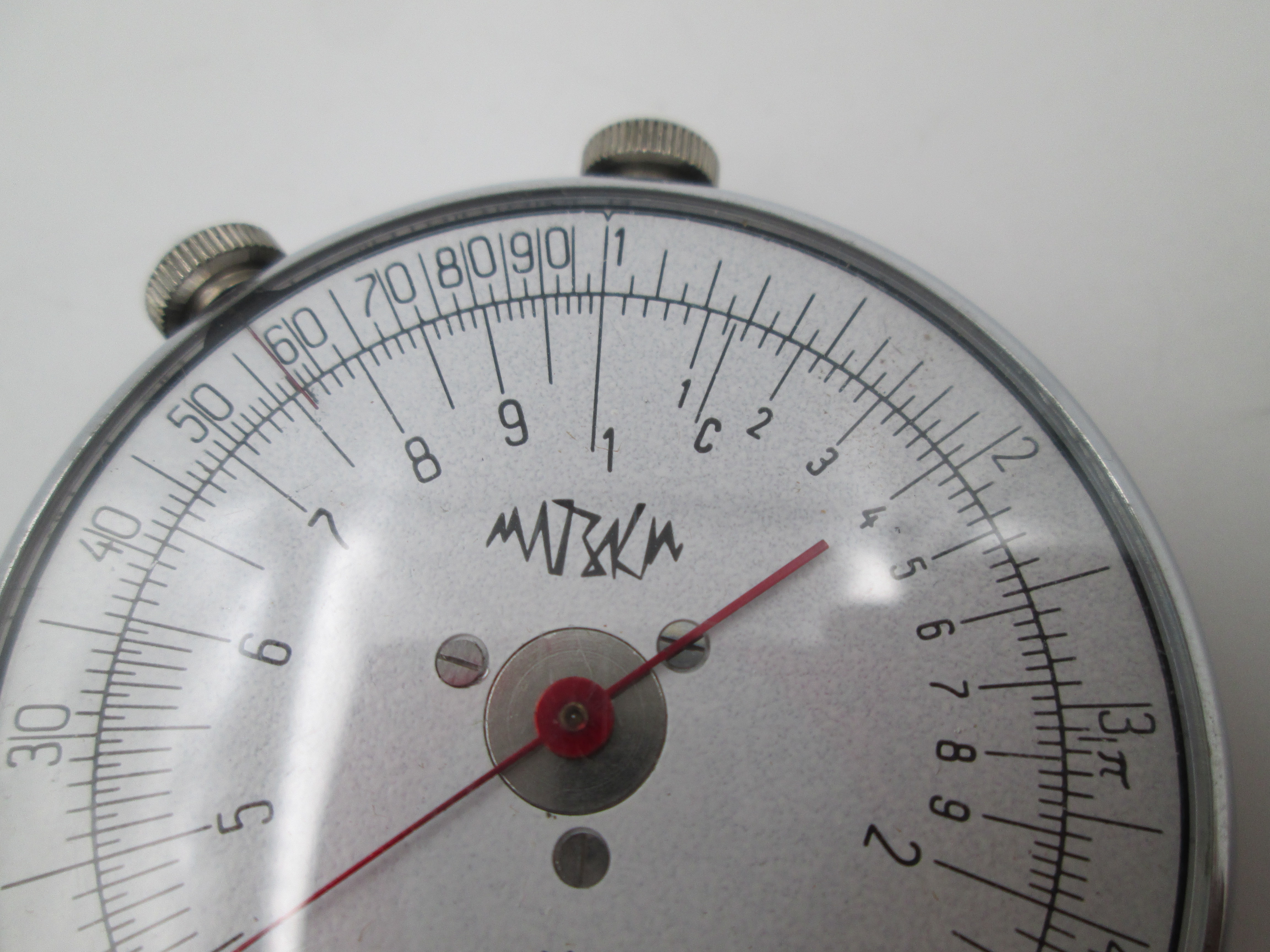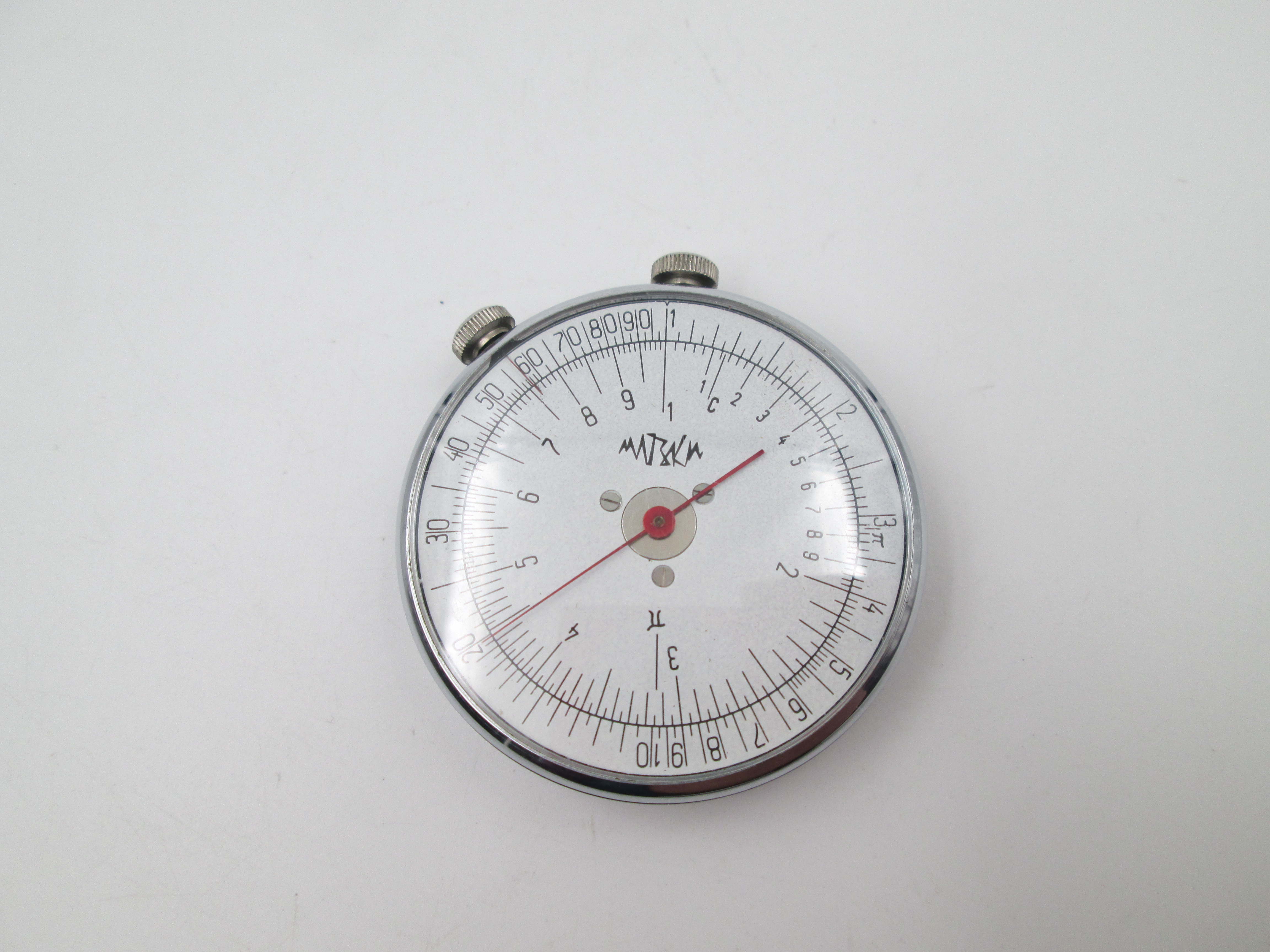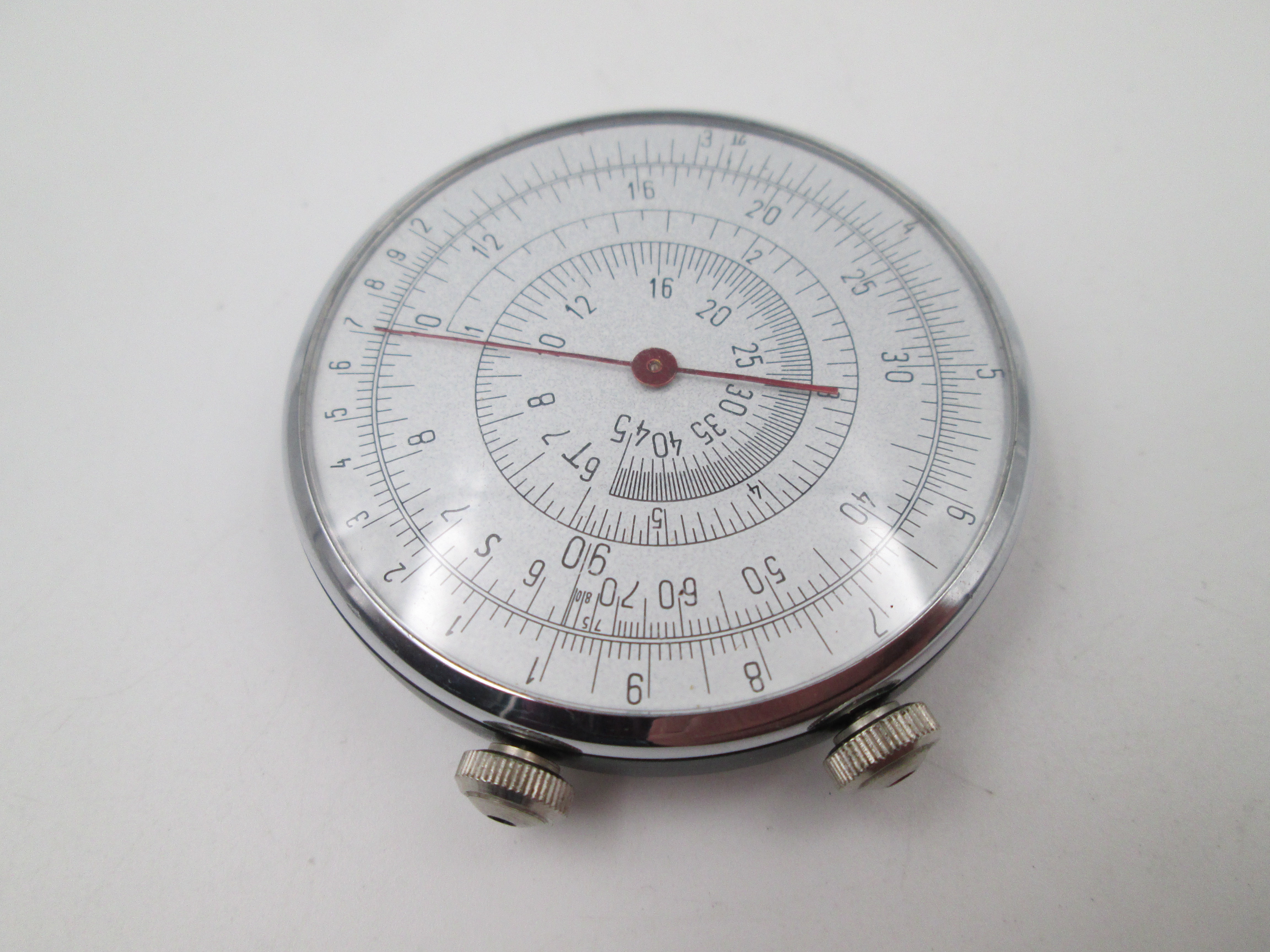 Regla de cálculo circular. Metal plateado y pavonado. Doble esfera blanca. URSS. 1960