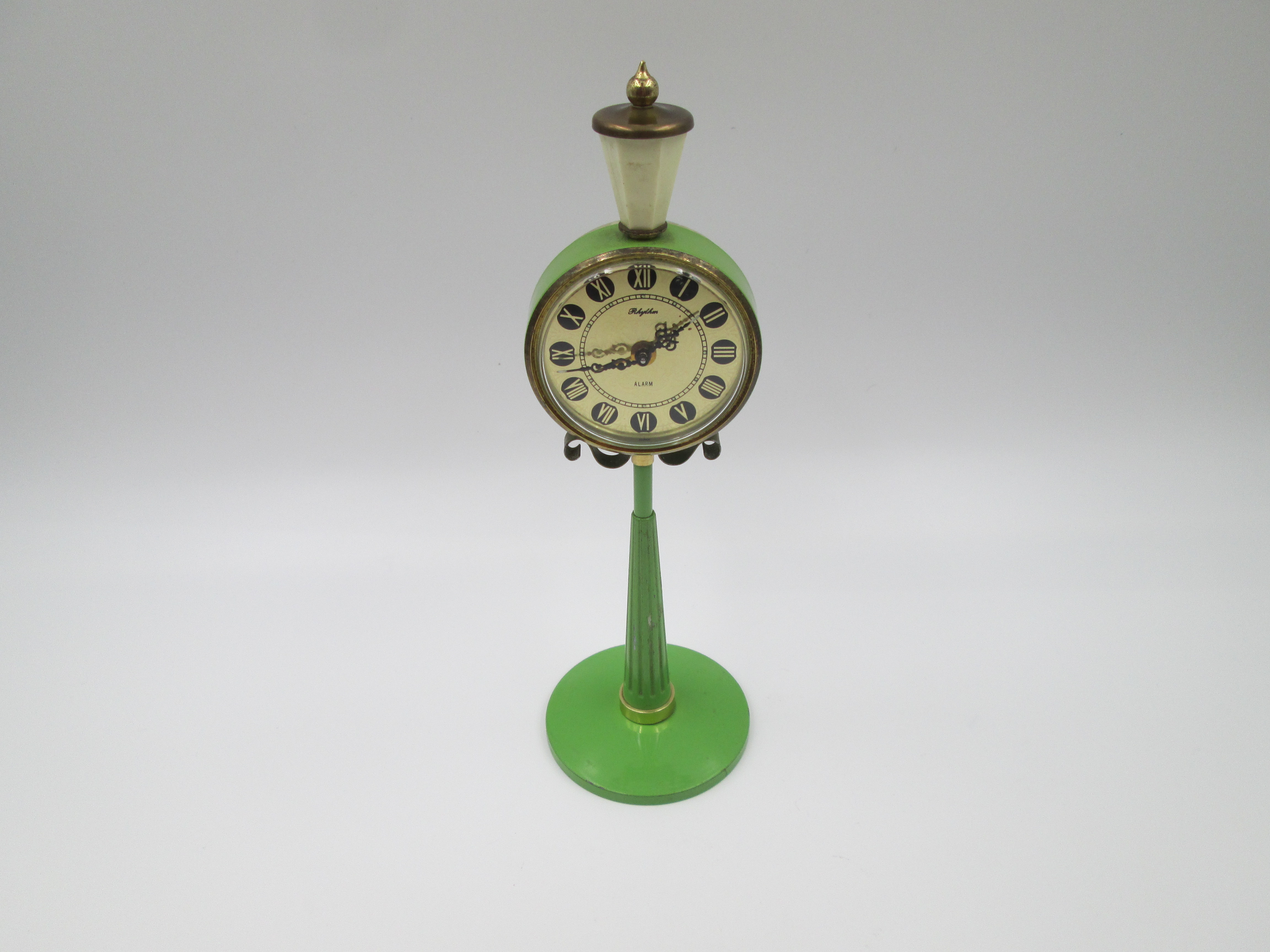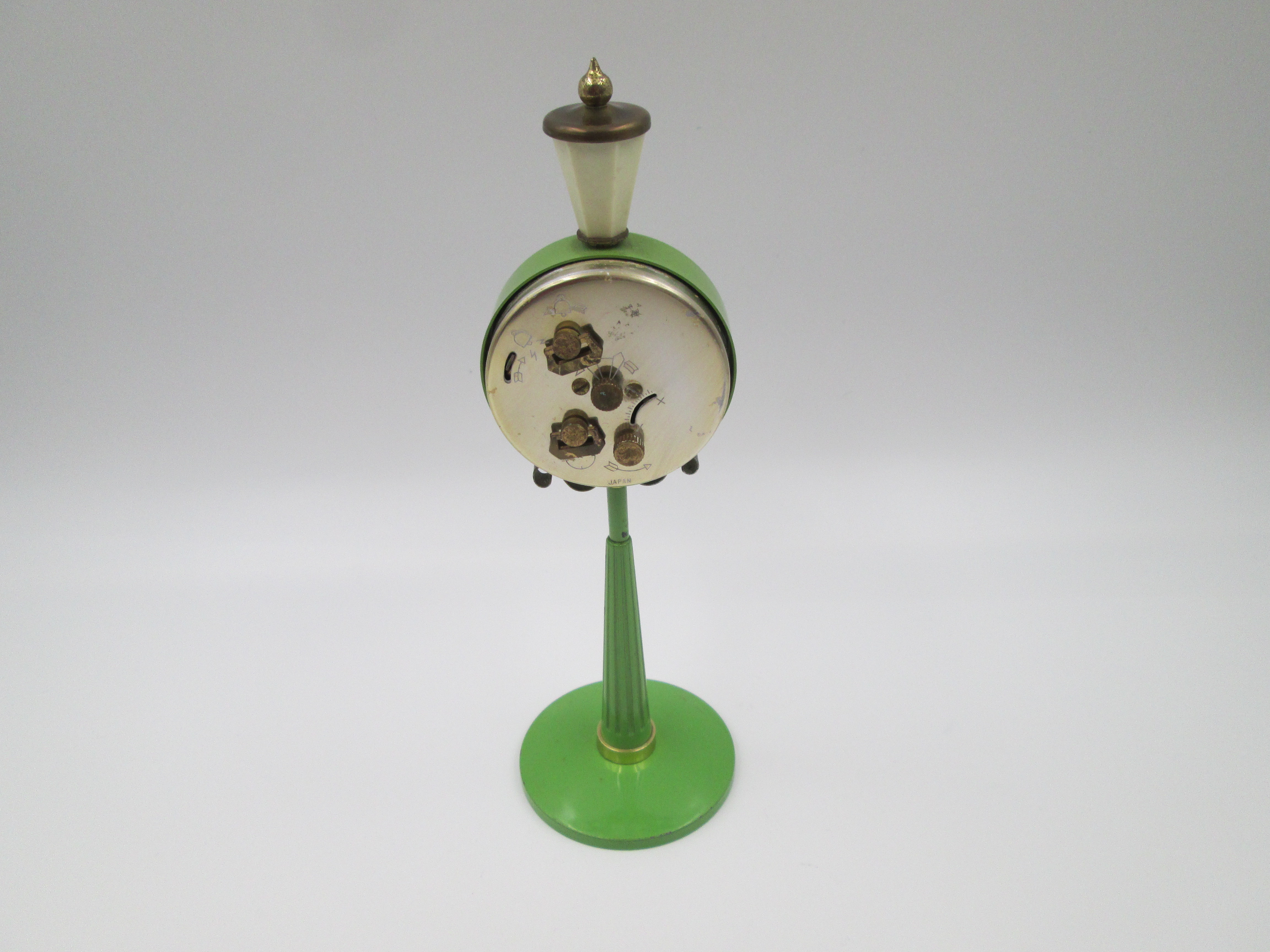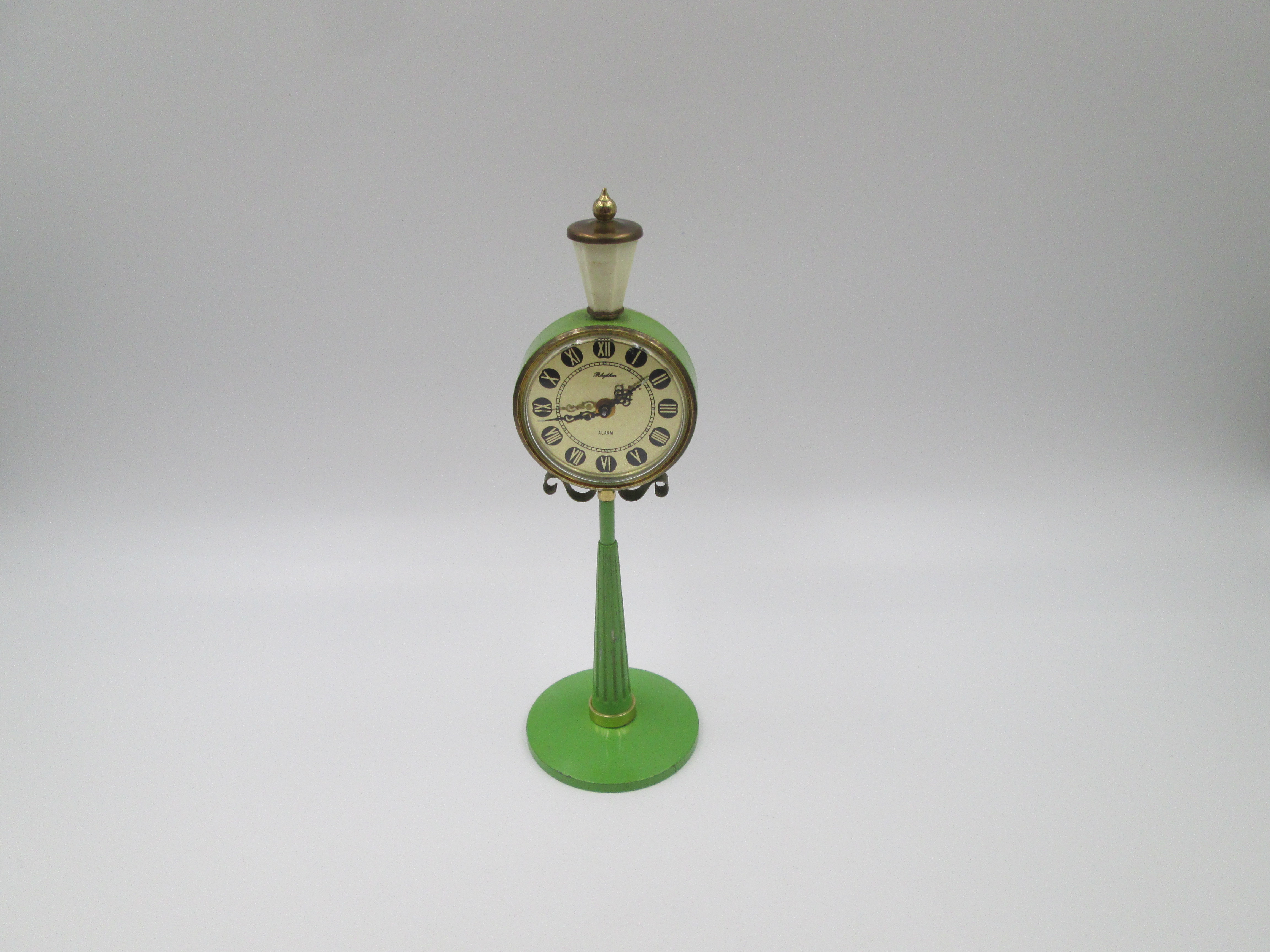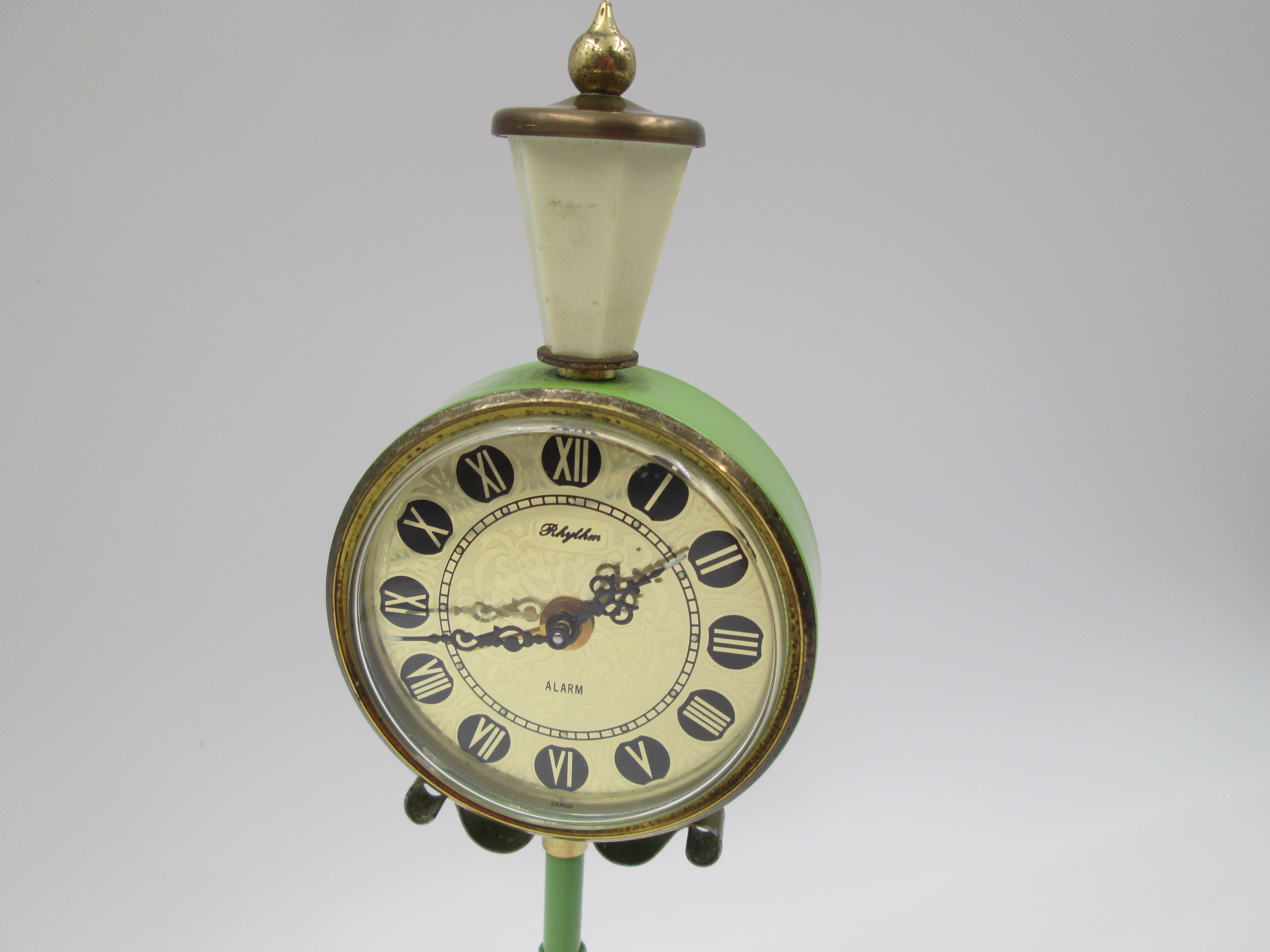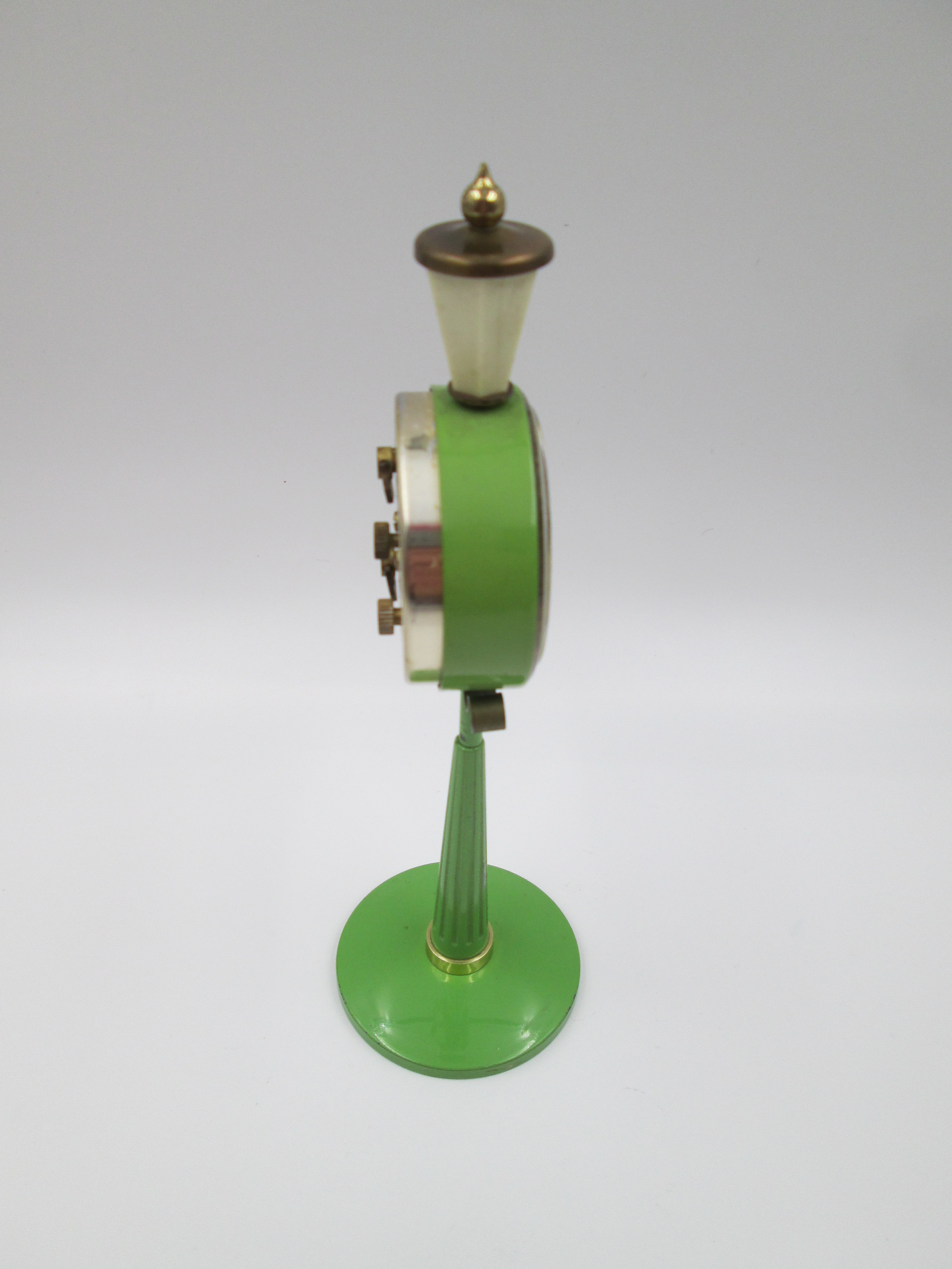 Reloj de sobremesa con alarma Rhythm. Forma de farola. Latón y metal lacado verde