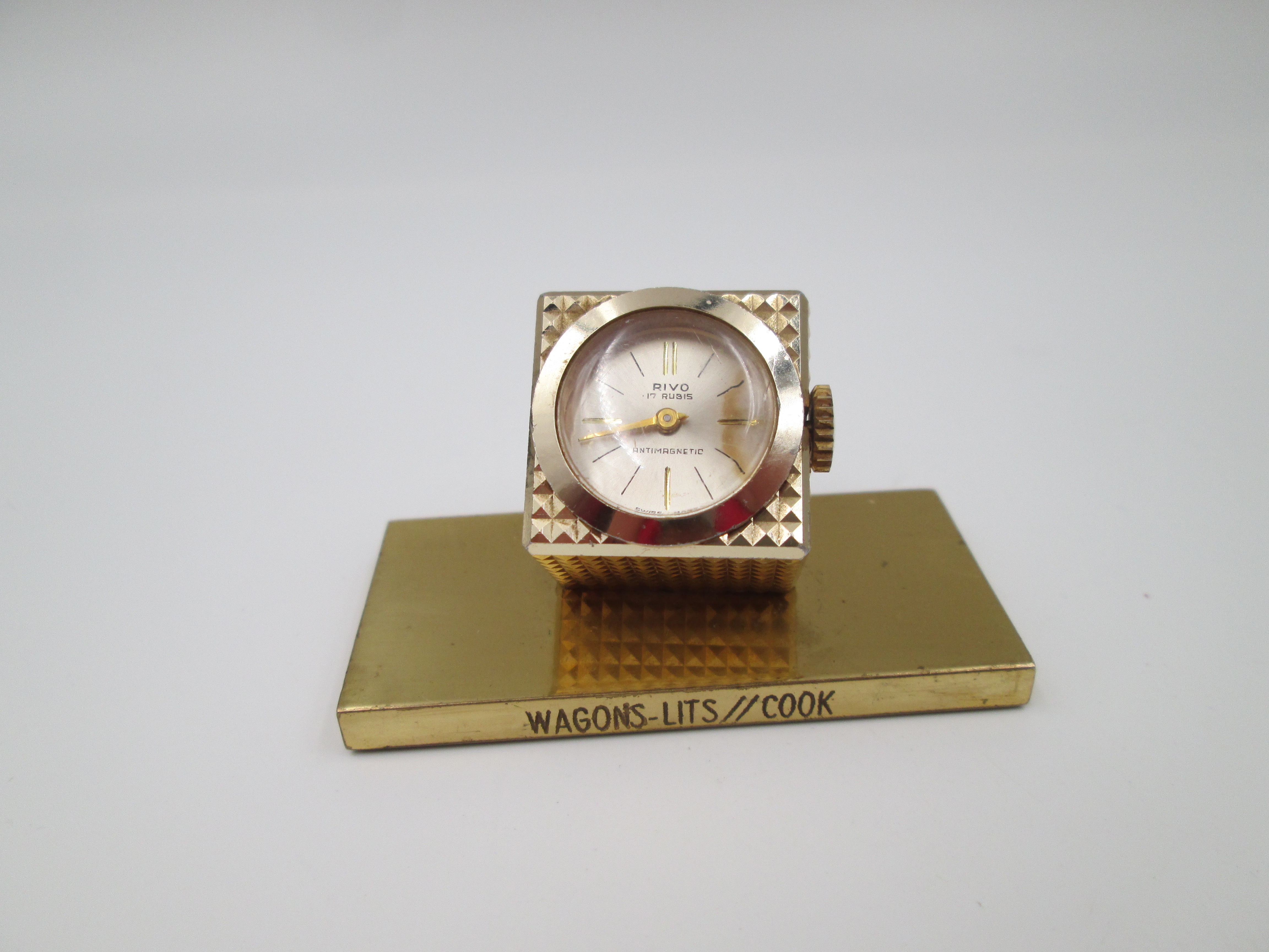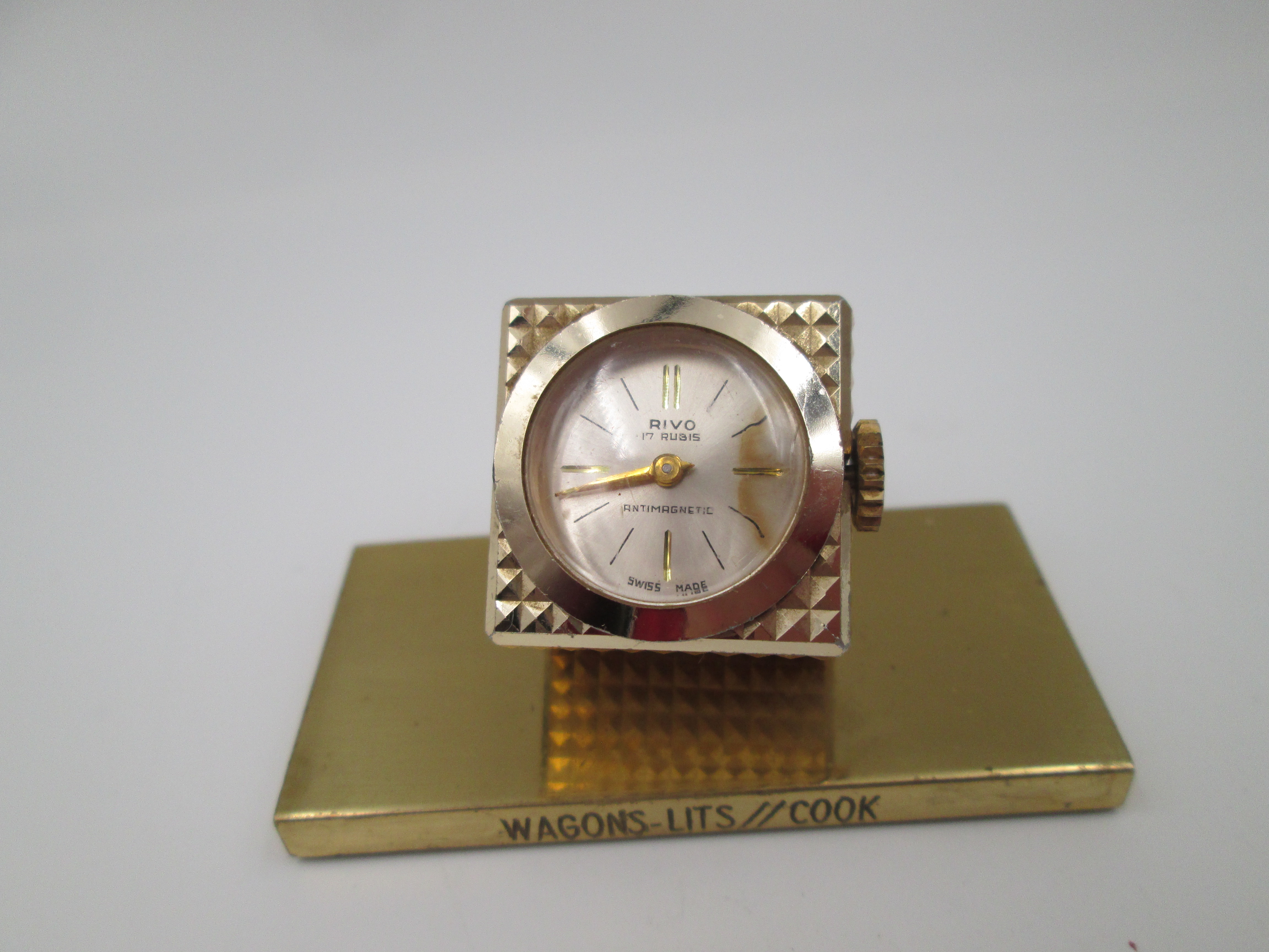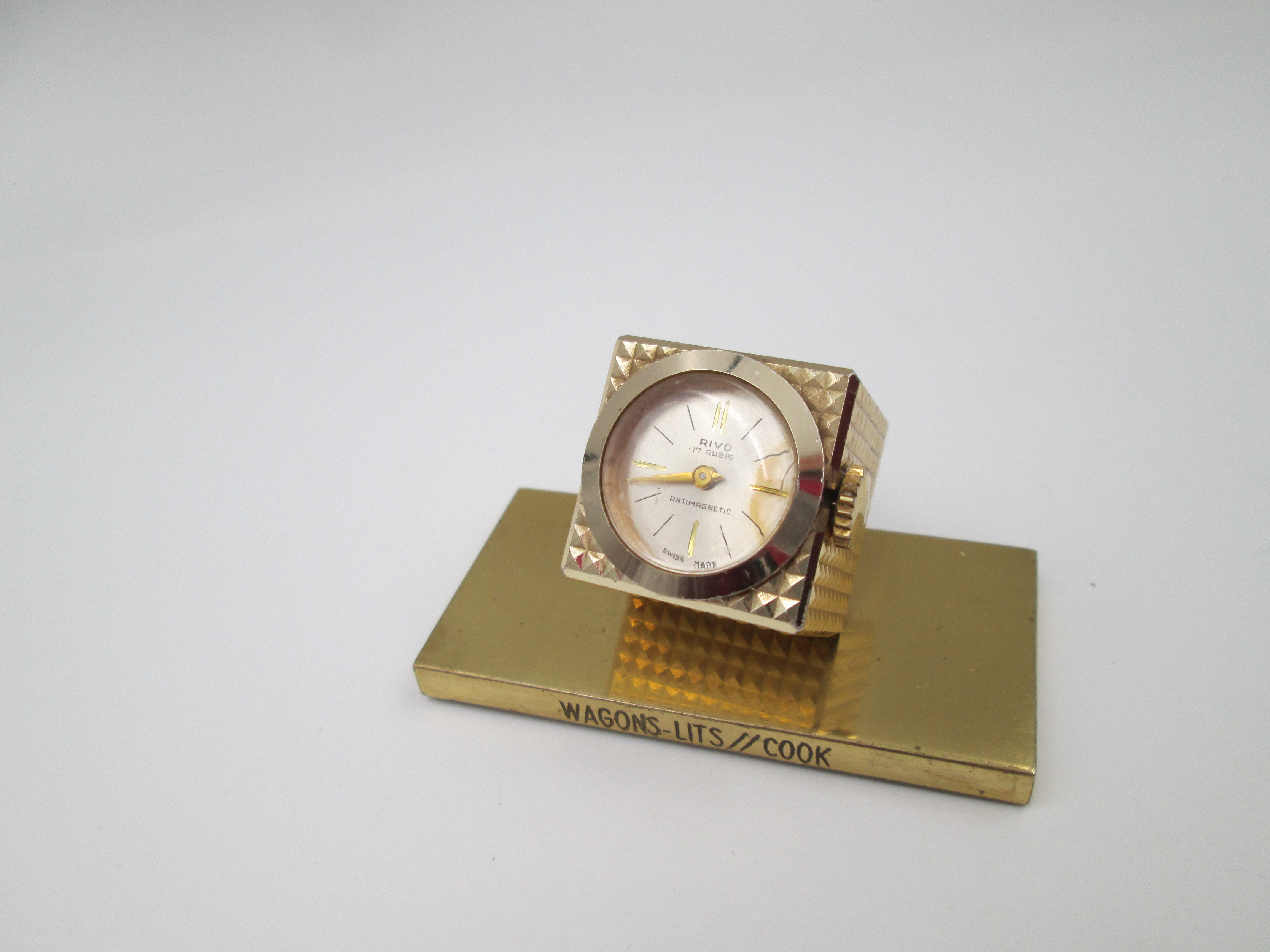 Reloj de sobremesa y viaje Rivo. Chapado en oro. Cuerda manual. Patrón diamante. Suiza