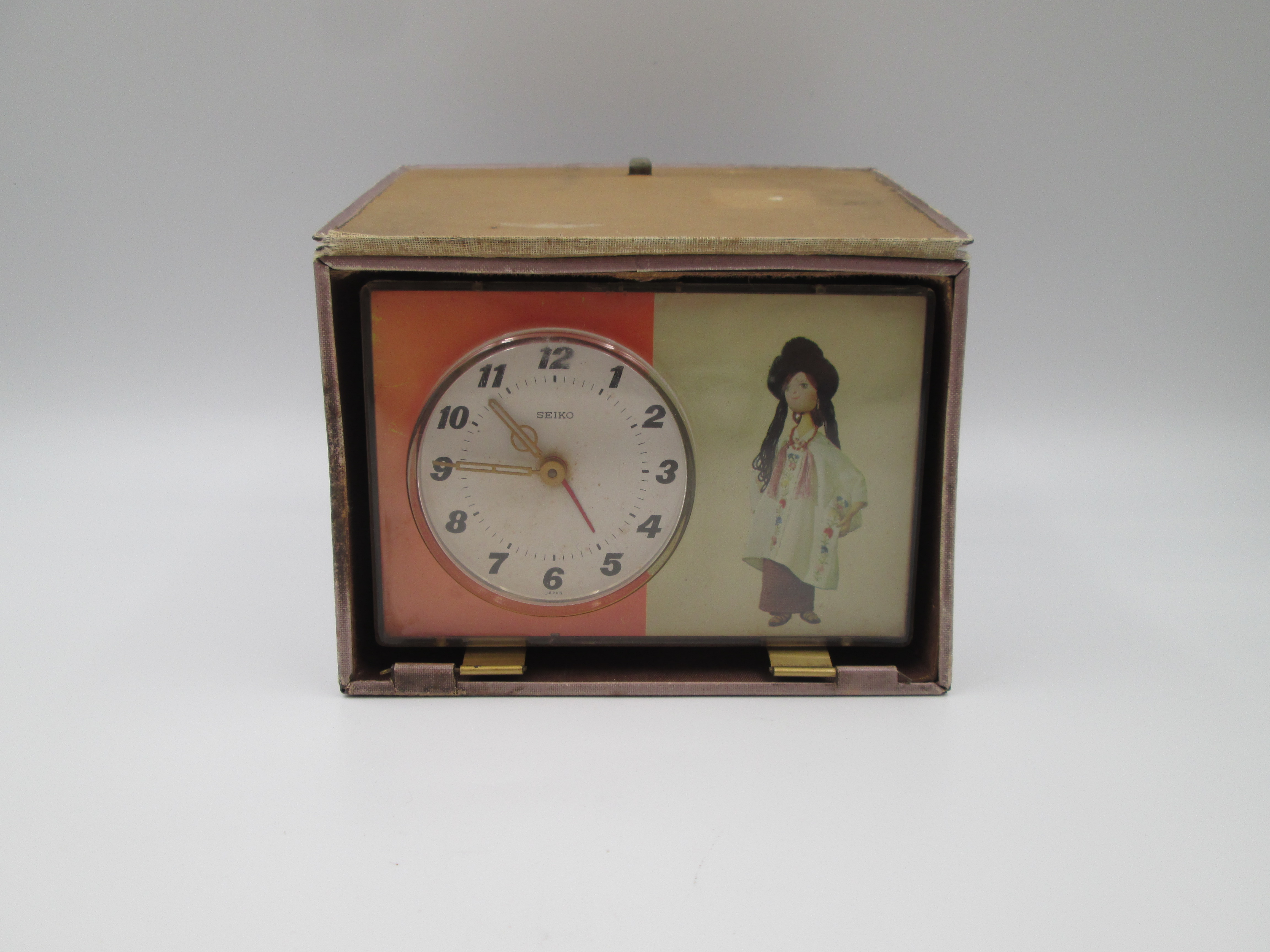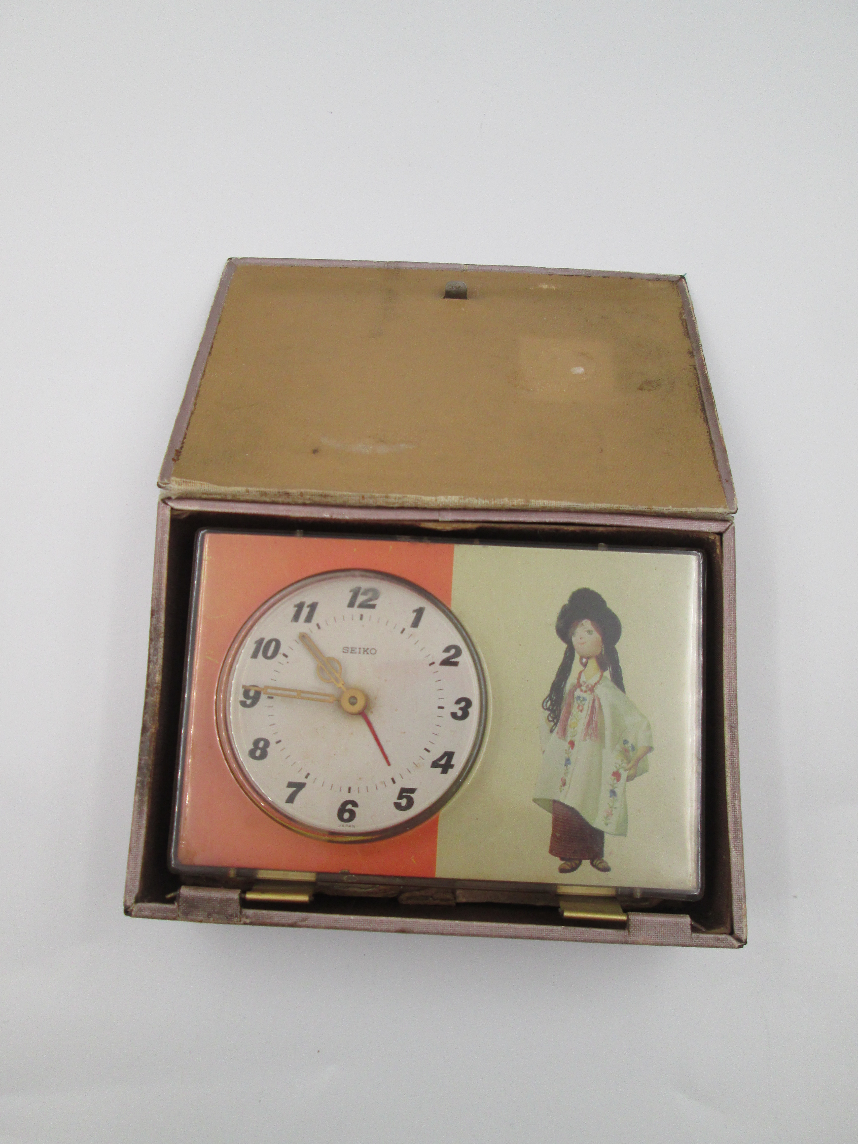 Reloj despertador de sobremesa Seiko Puppet. Forma de libro. Cuerda manual. Japón. 1970