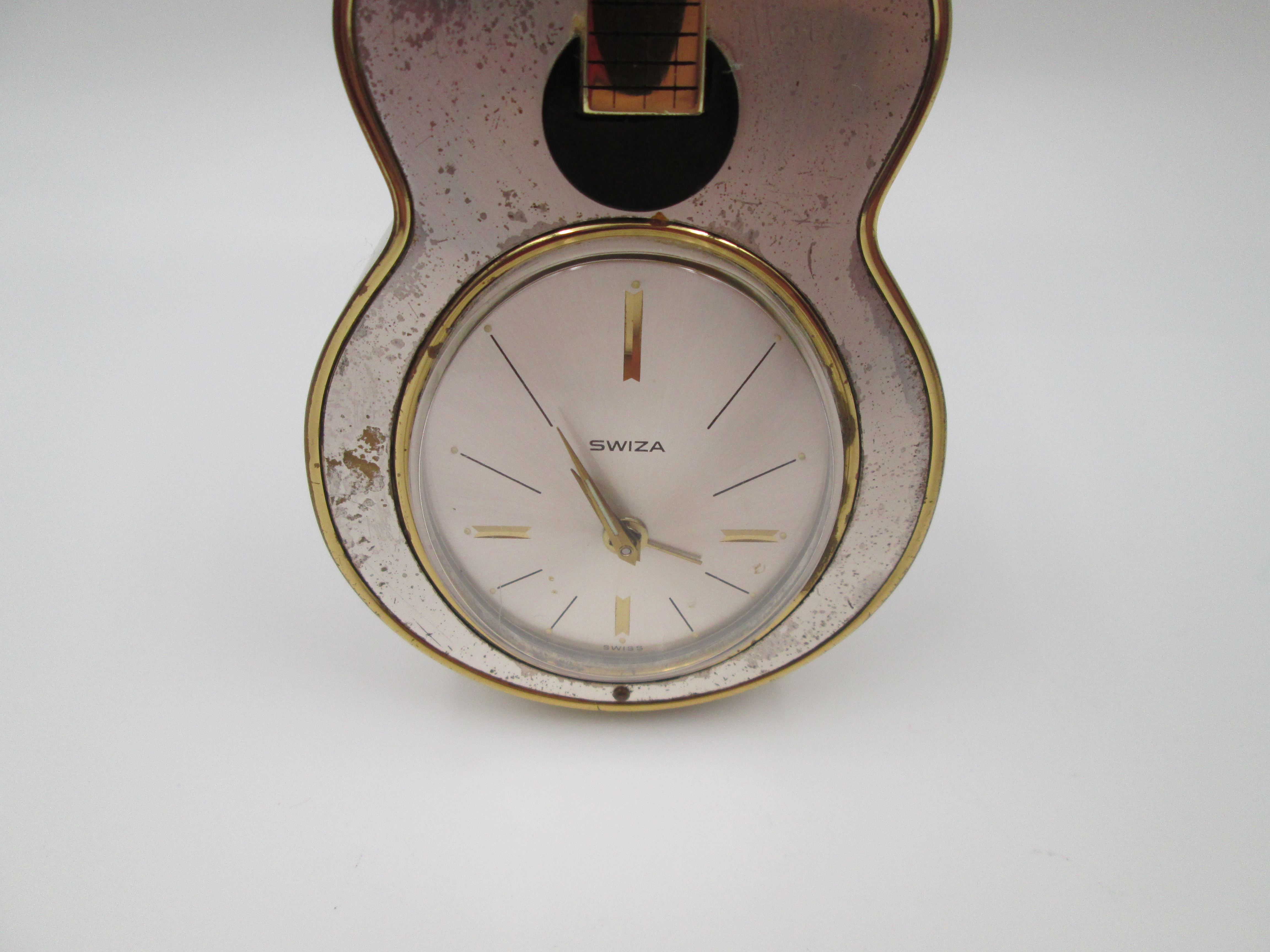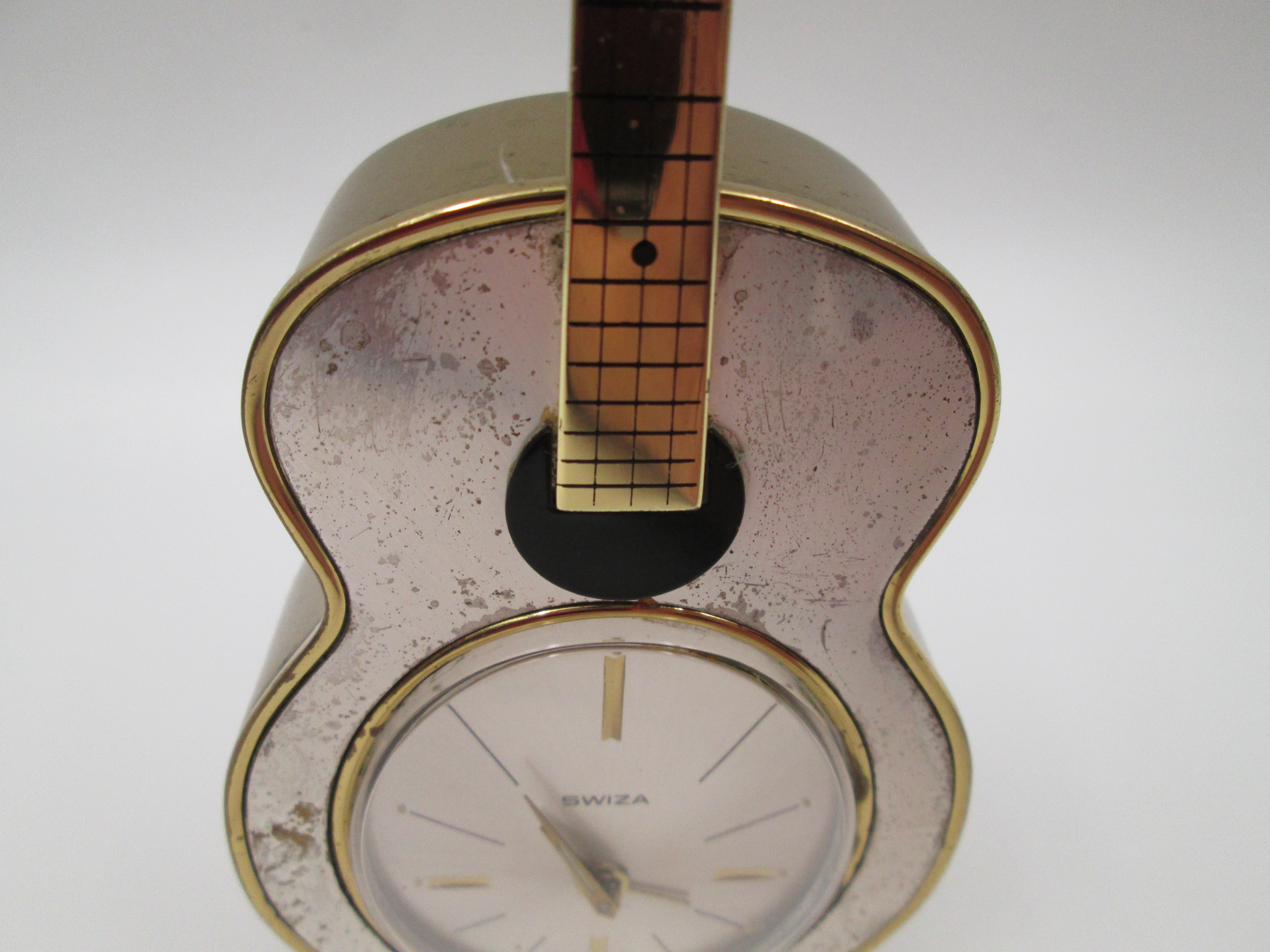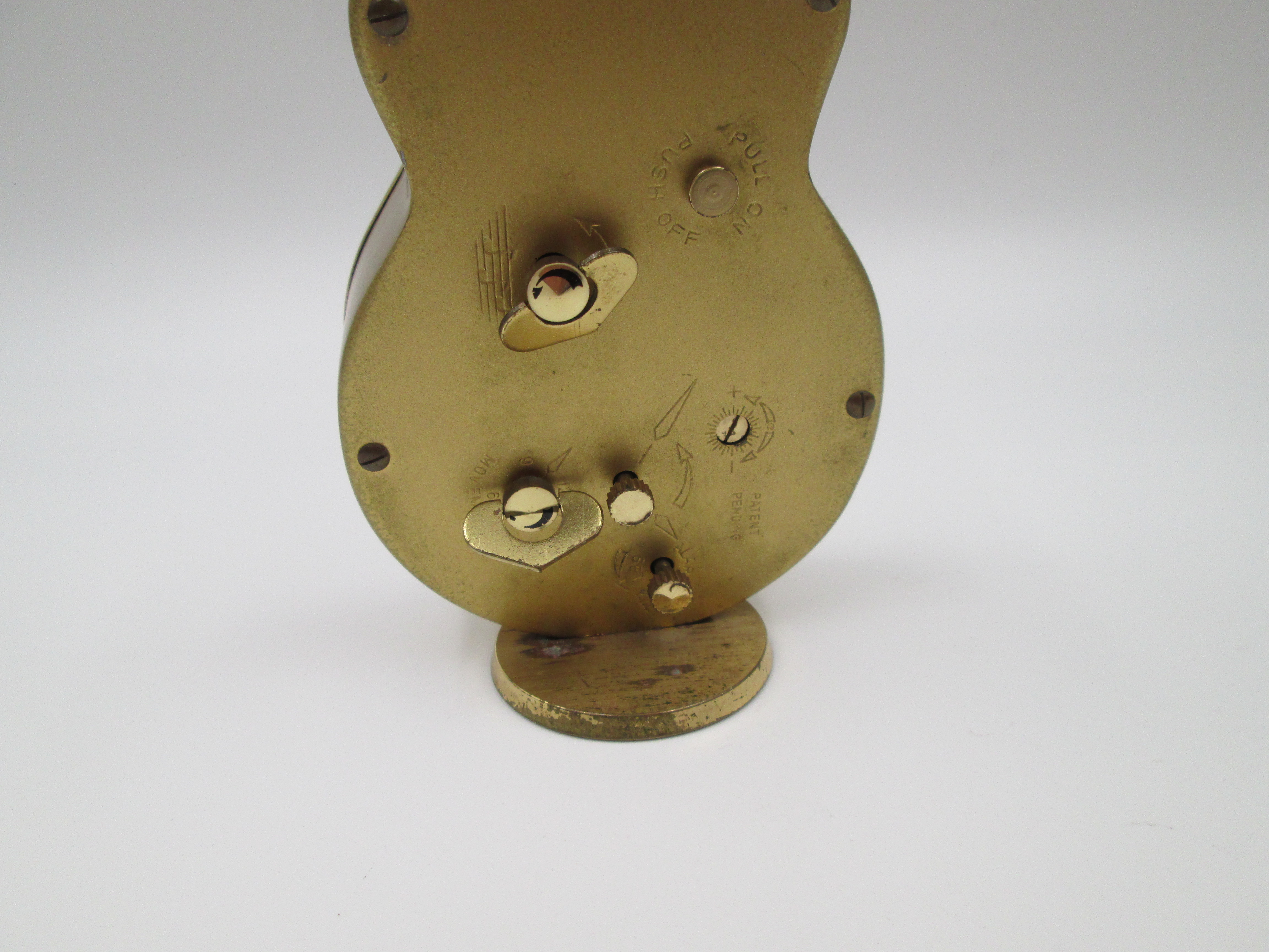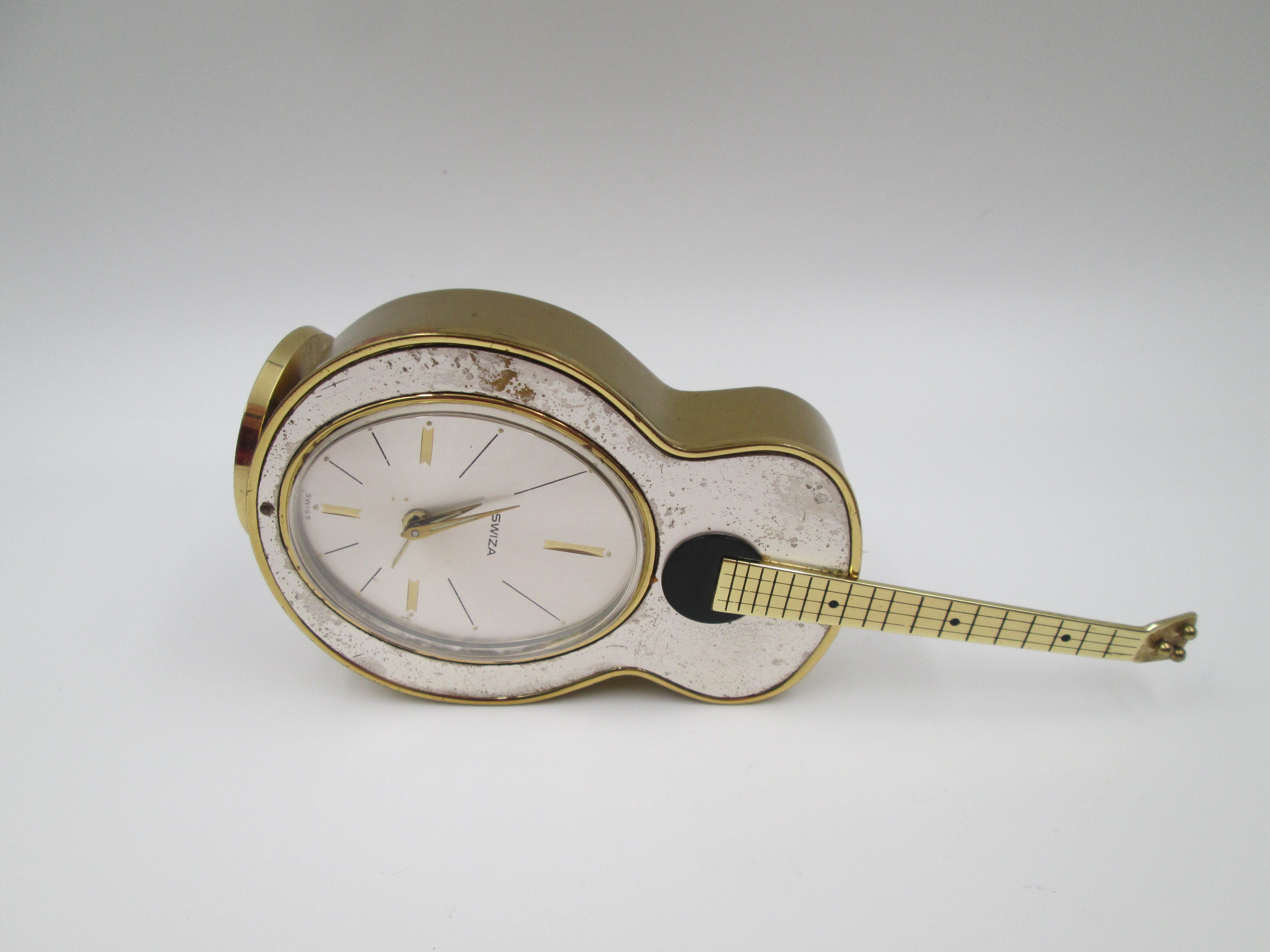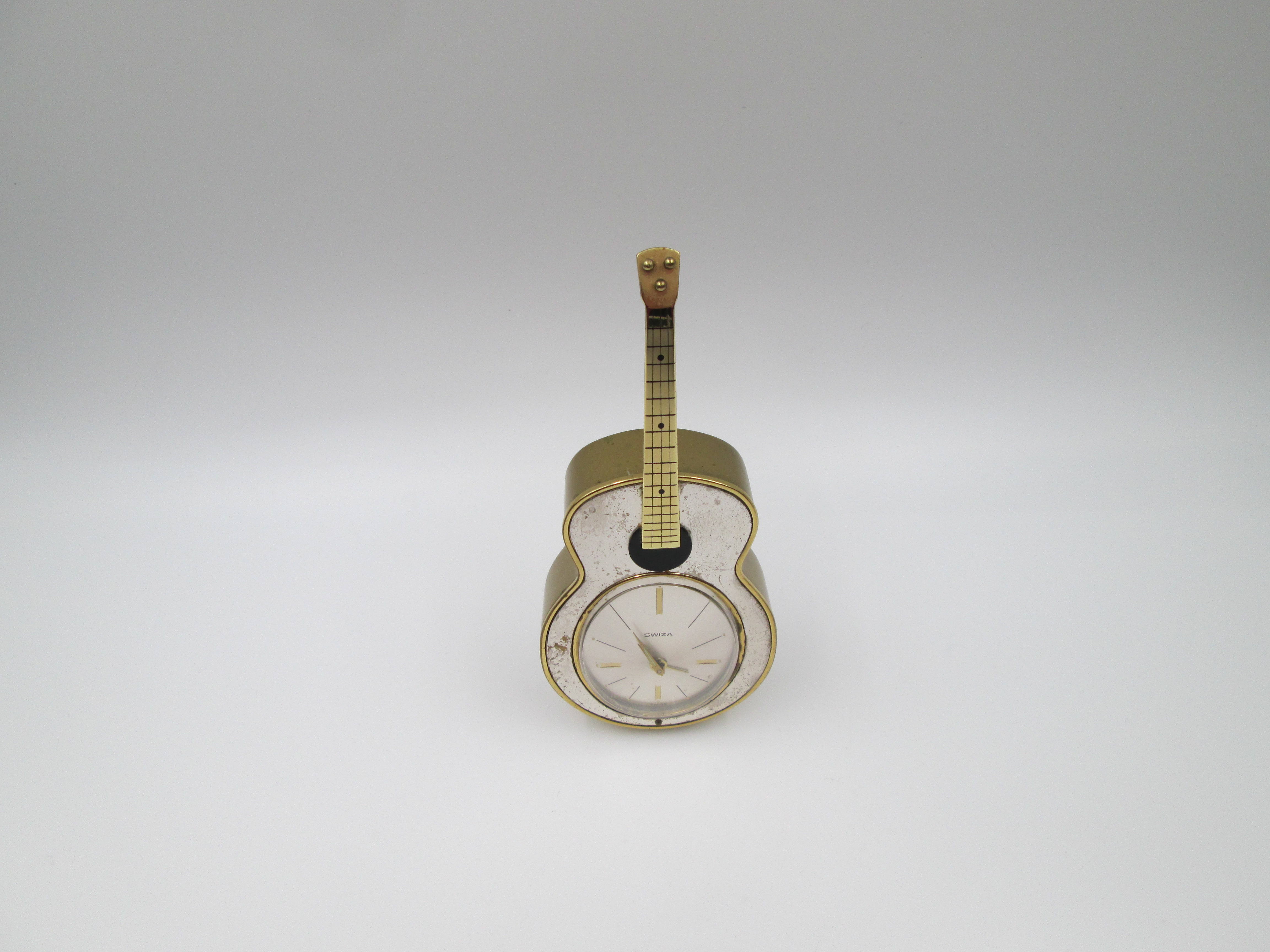 Reloj musical de sobremesa Swiza. Cuerda manual. Bronce. Forma de guitarra. 1970