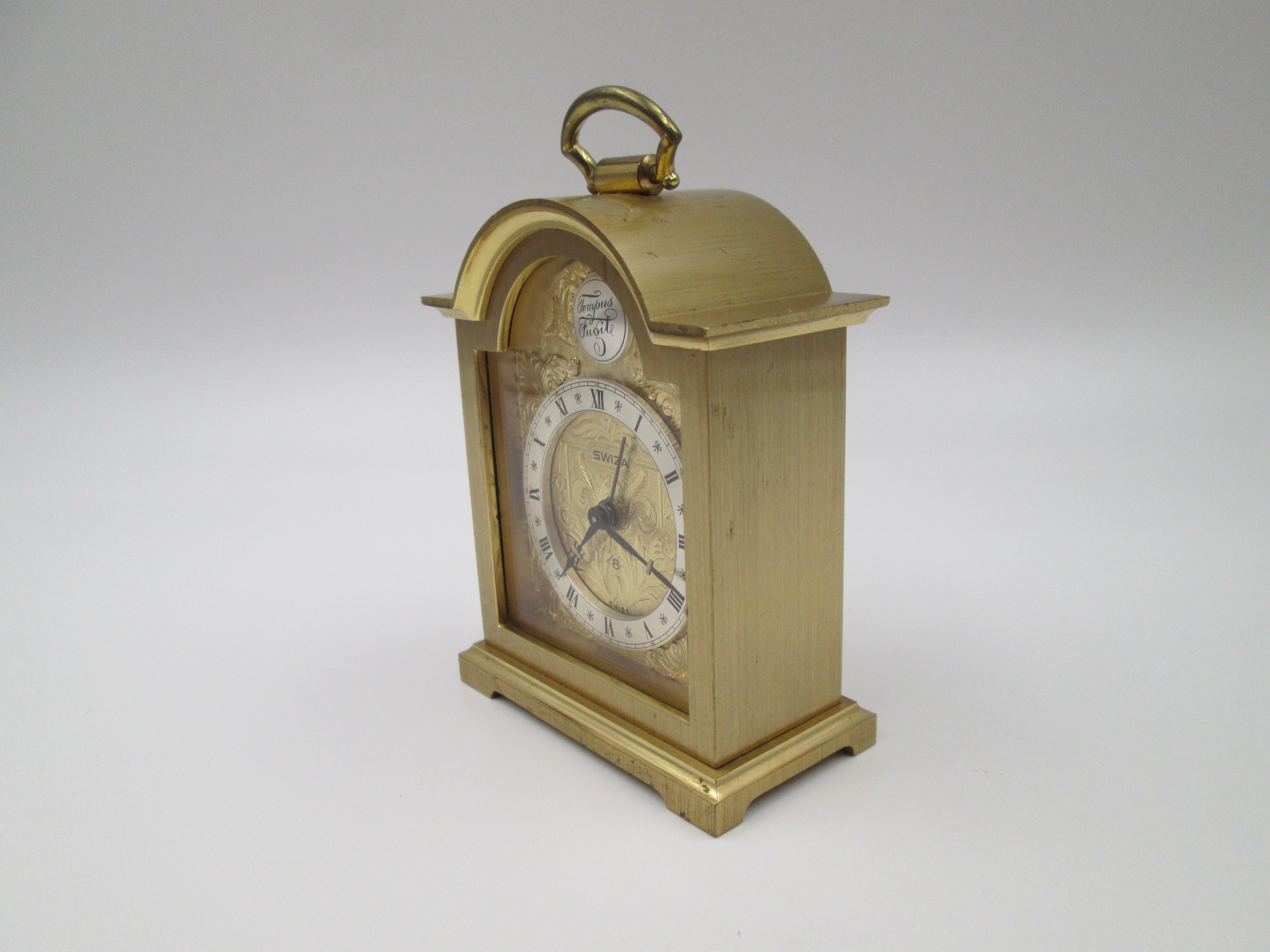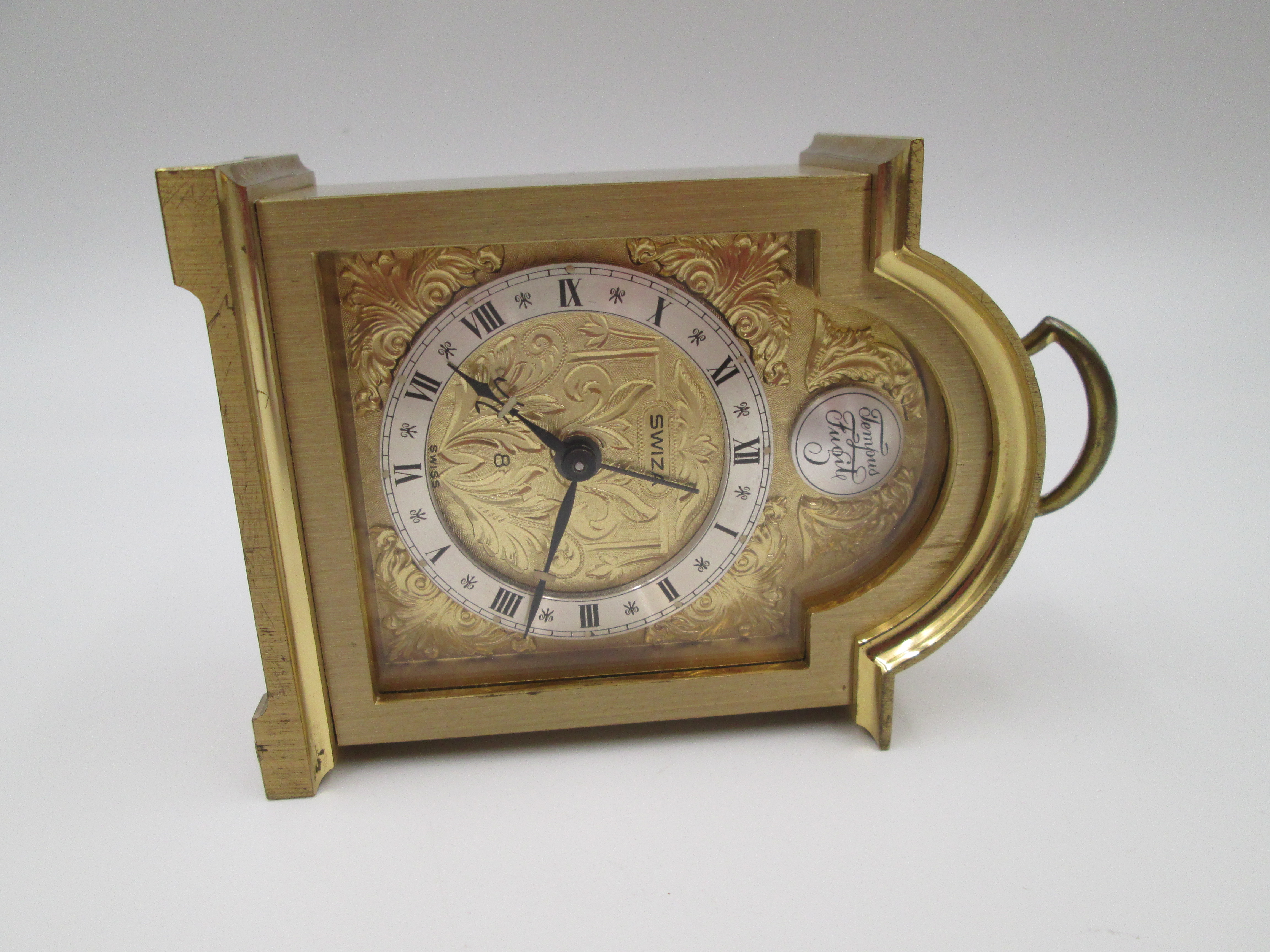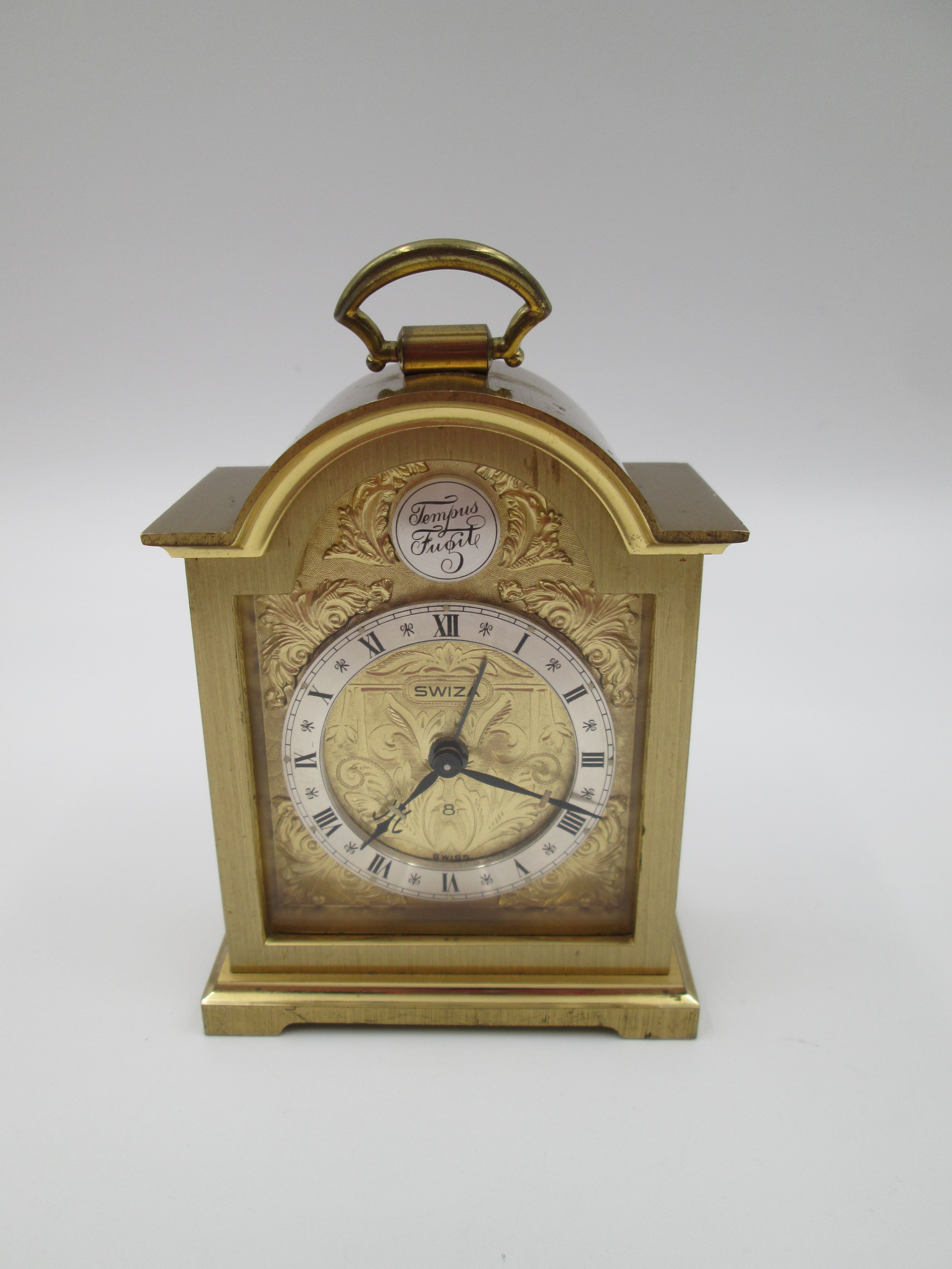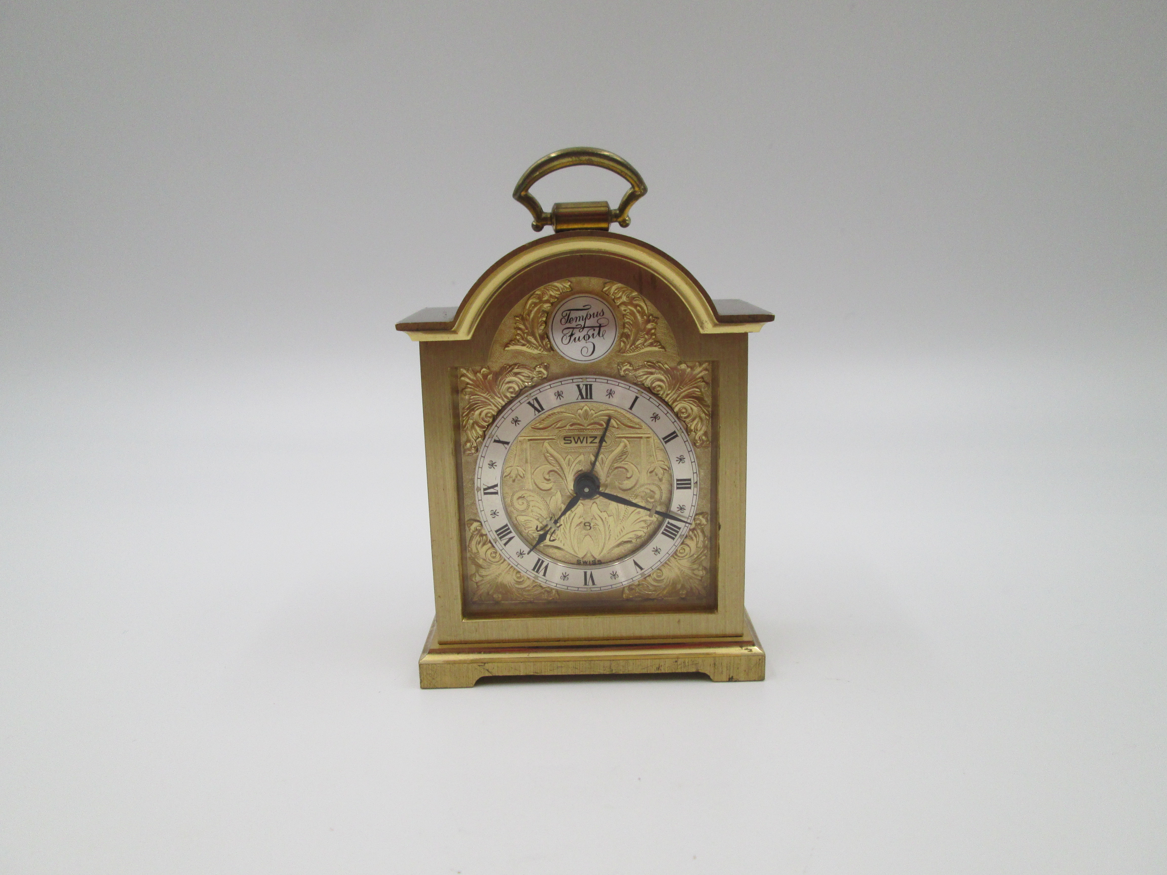 Reloj despertador Swiza Tempus Fugit 8 días cuerda. Bronce. Motivos vegetales. Suiza. 1970