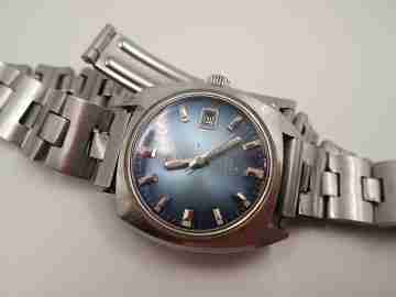 Incluye un brazalete Orient con cierre desplegable de seguridad y luce una esfera azul, con índices y agujas luminiscentes plateadas, segundero central y calendario (fecha) de cambio tradicional a las tres.