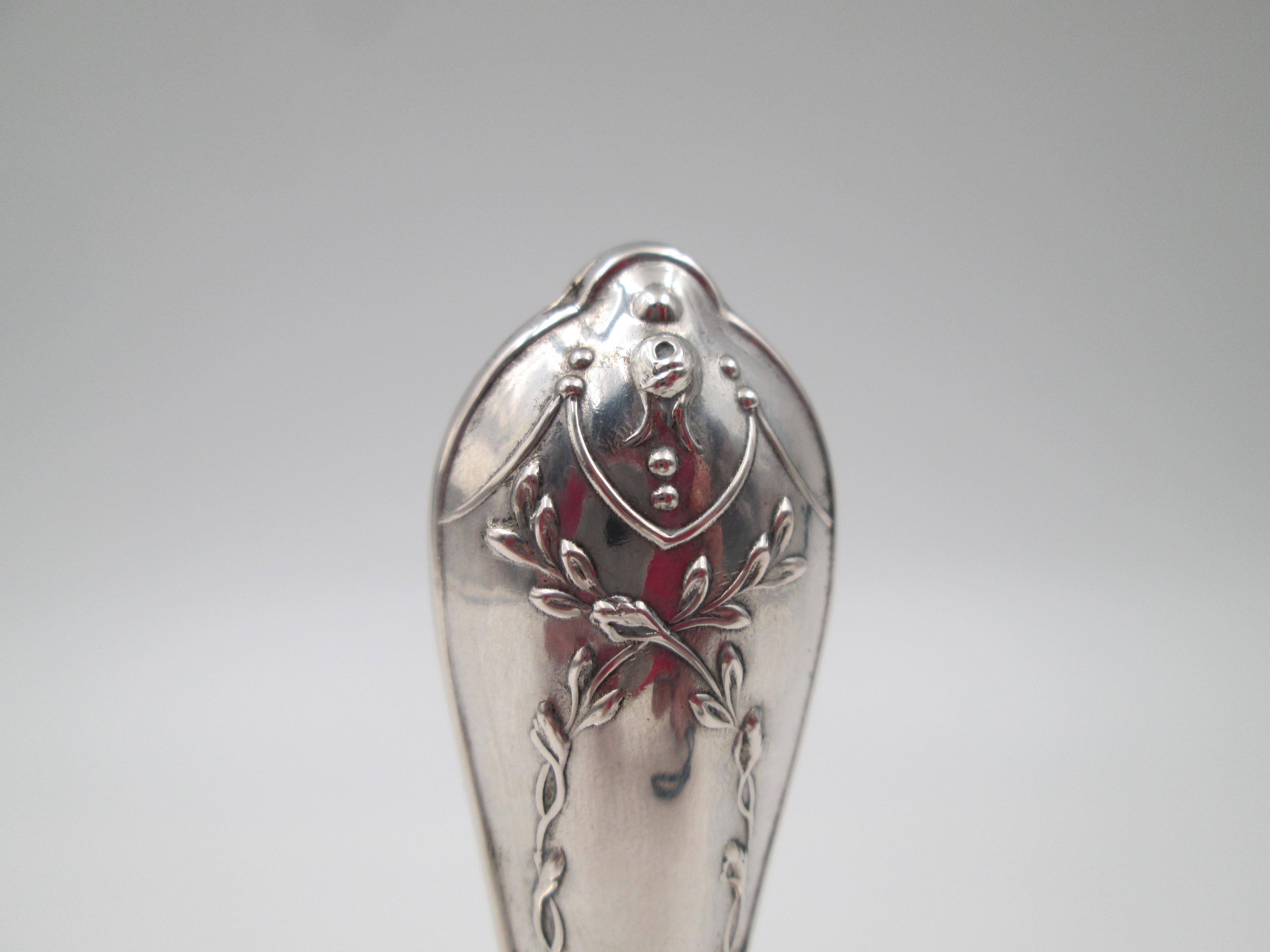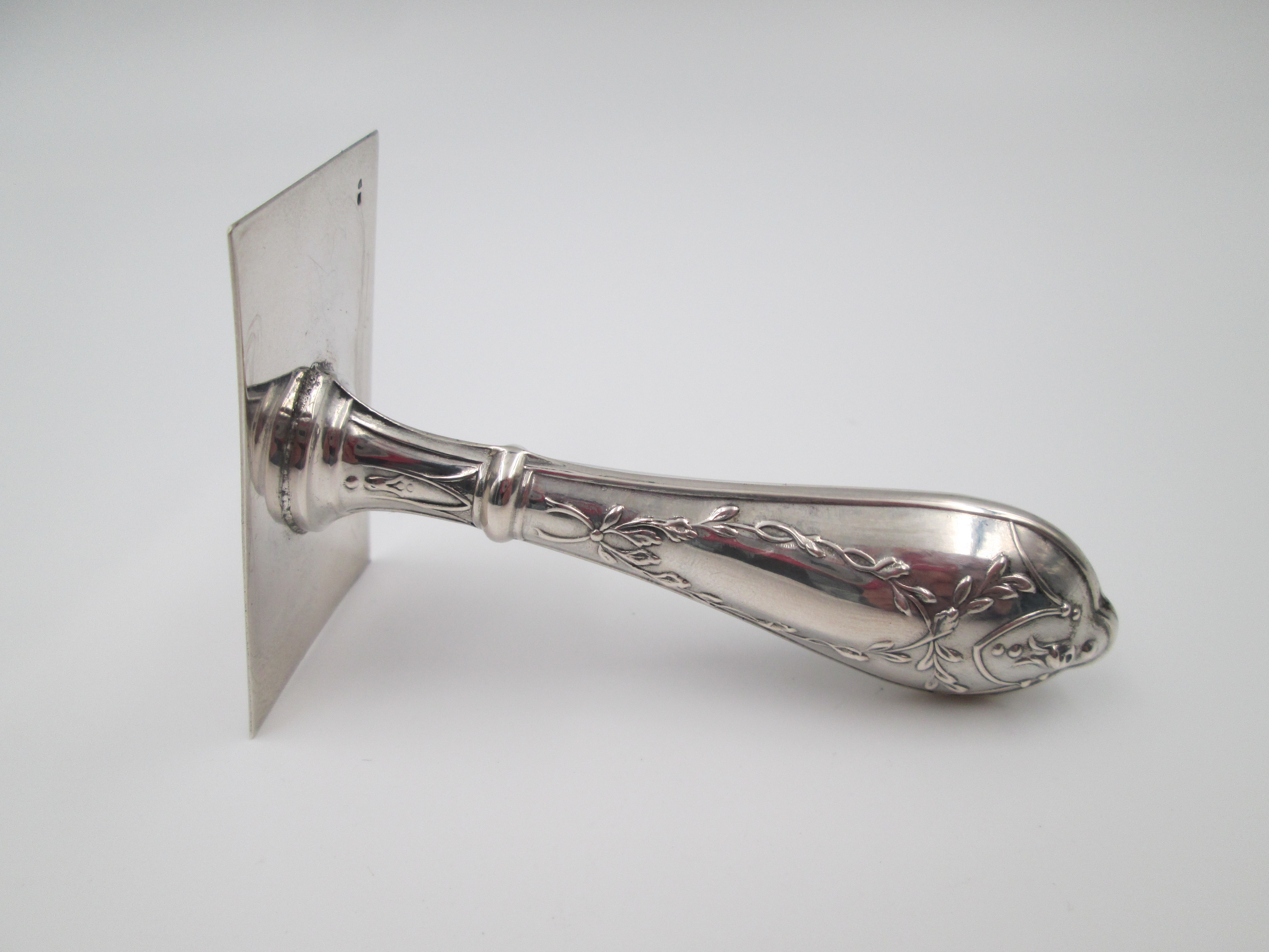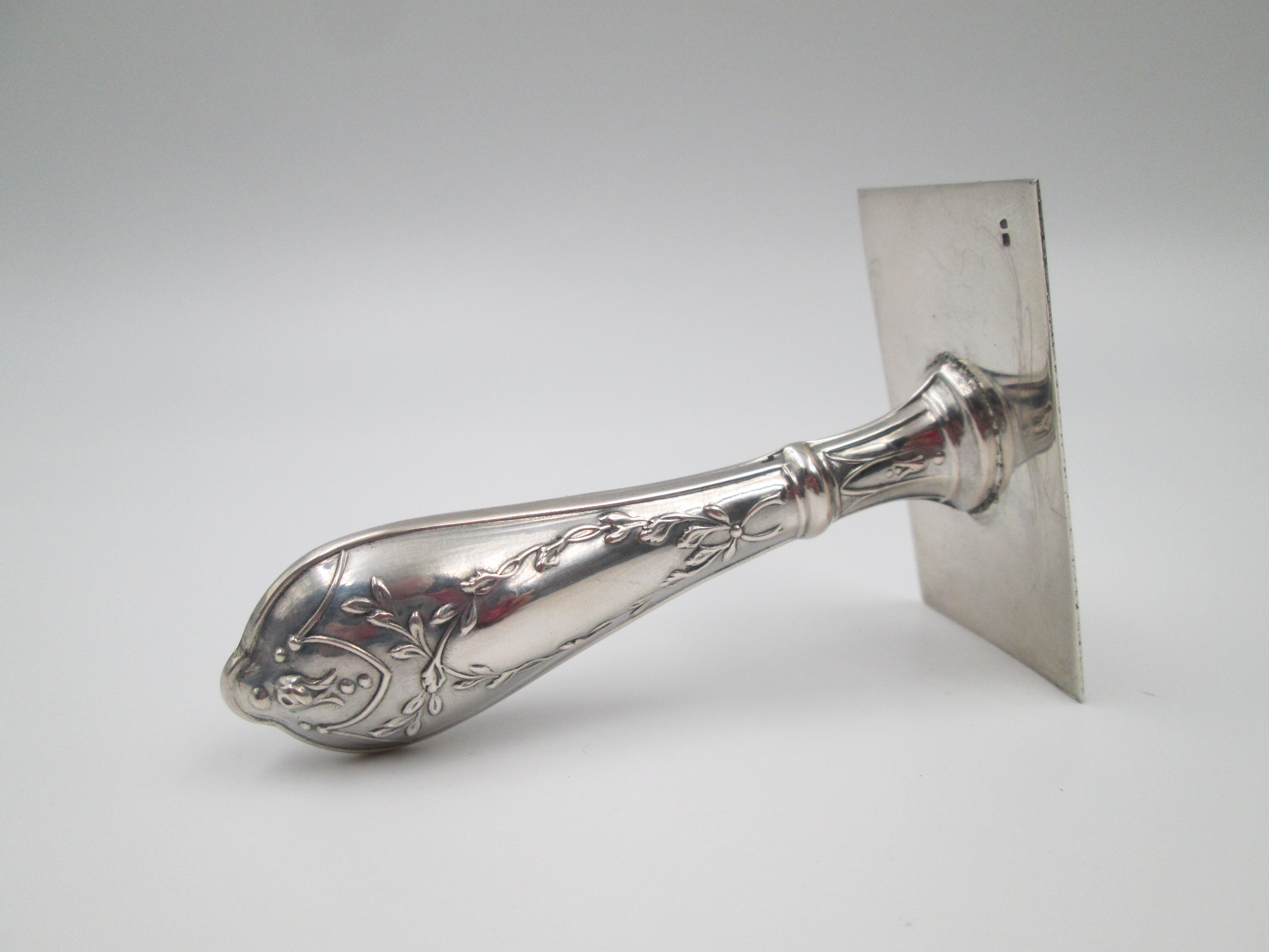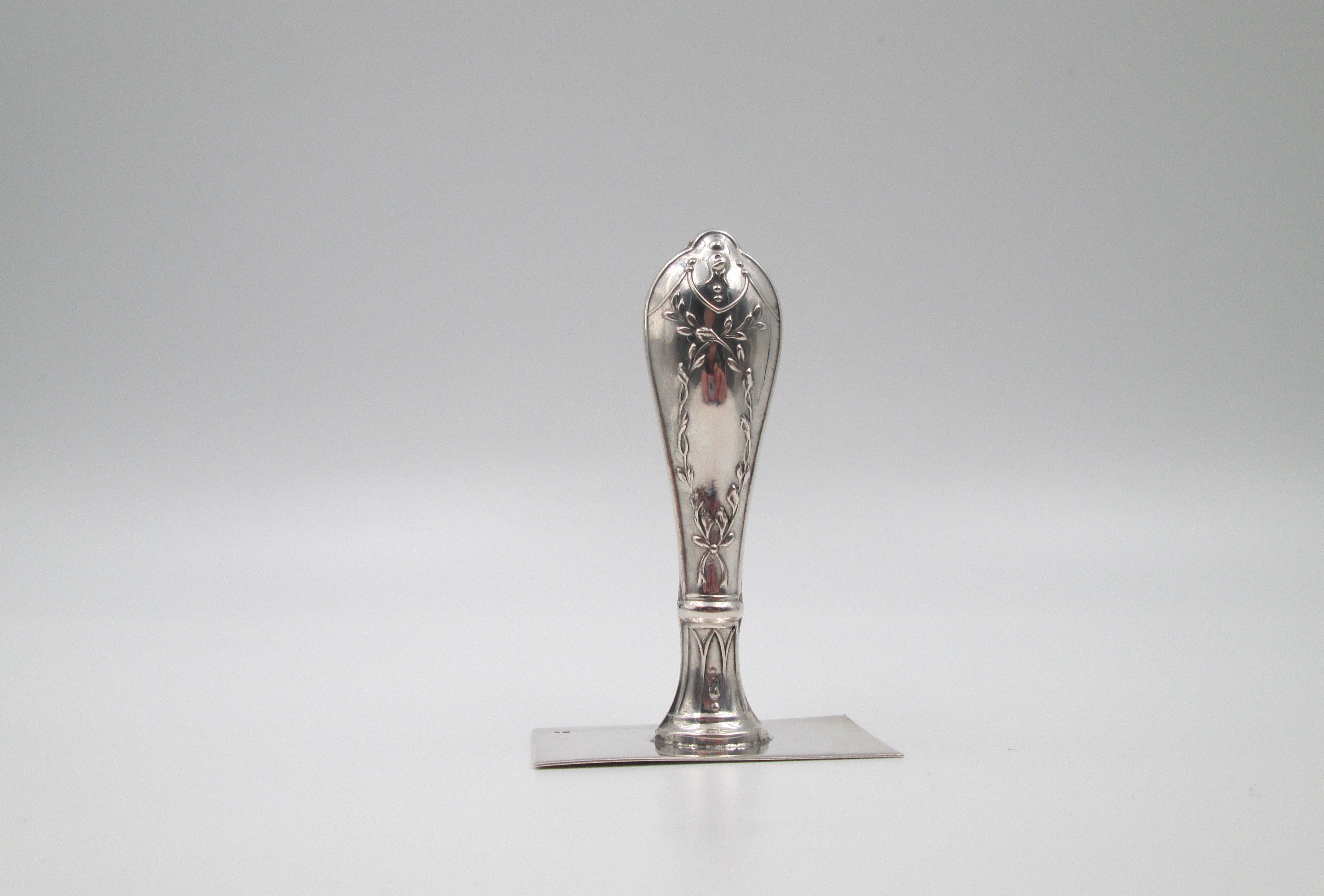 Viene realizado en plata de ley contrastada de 925 milésimas y se adorna con motivos vegetales en relieve en el mango.