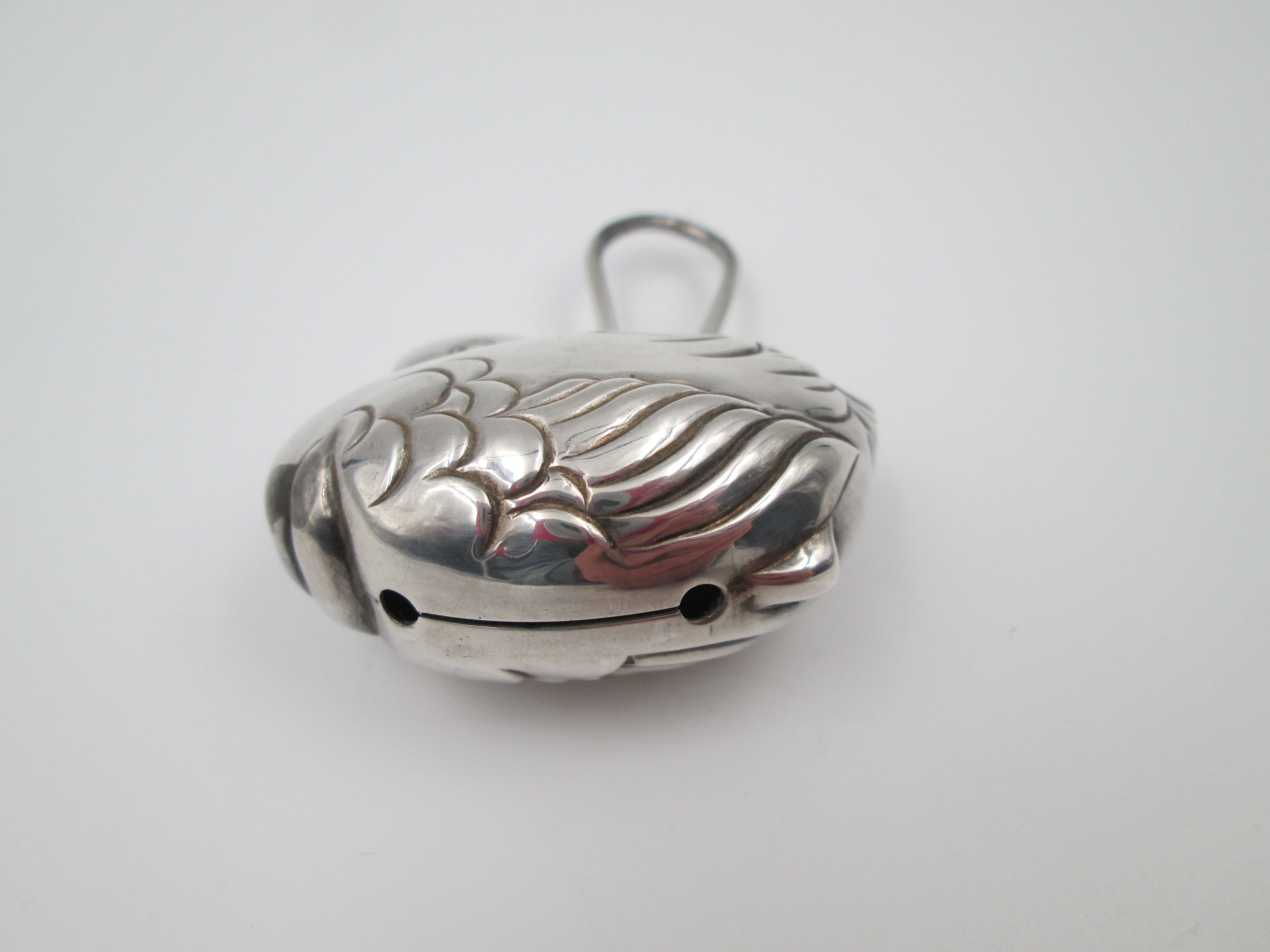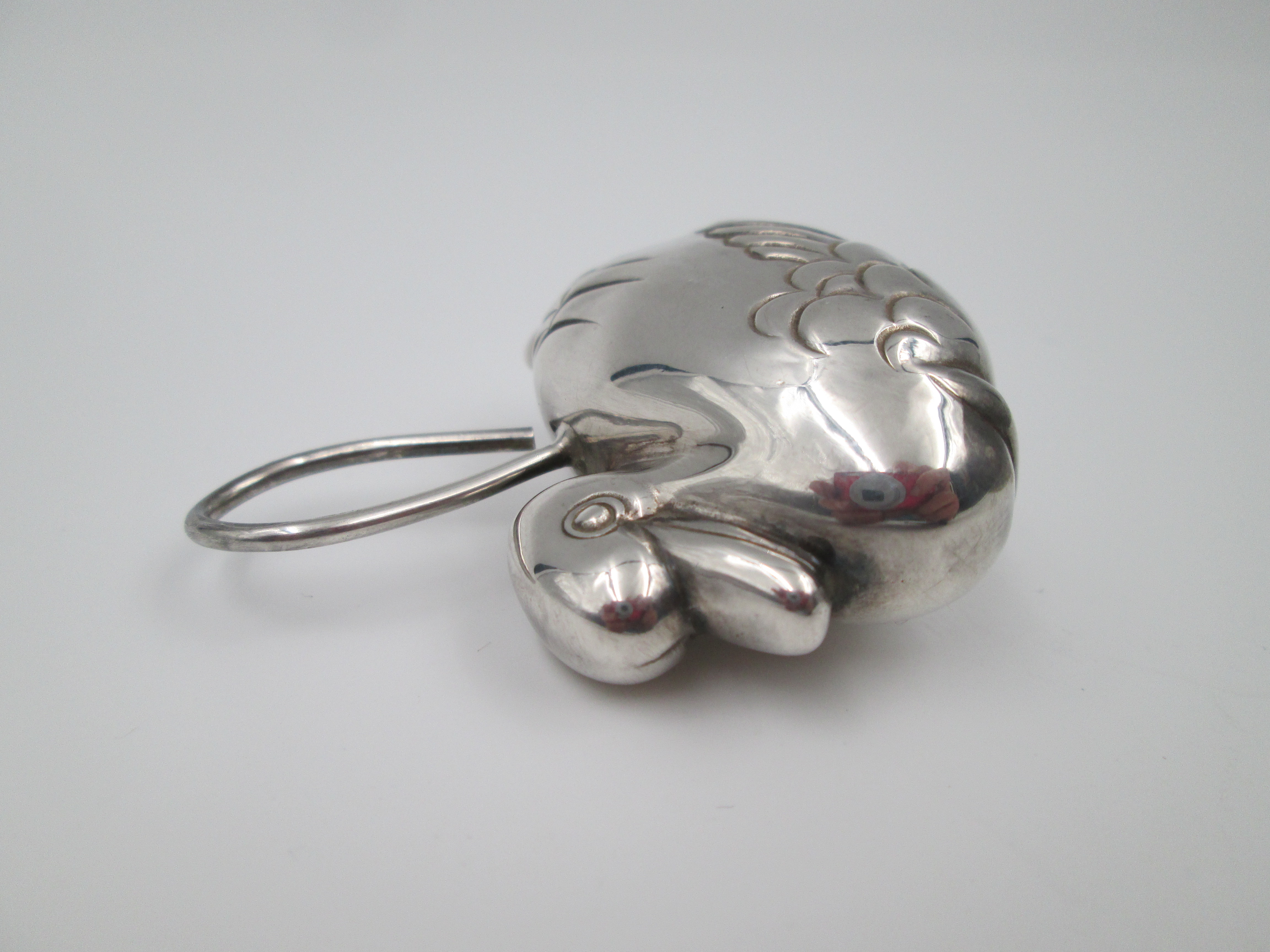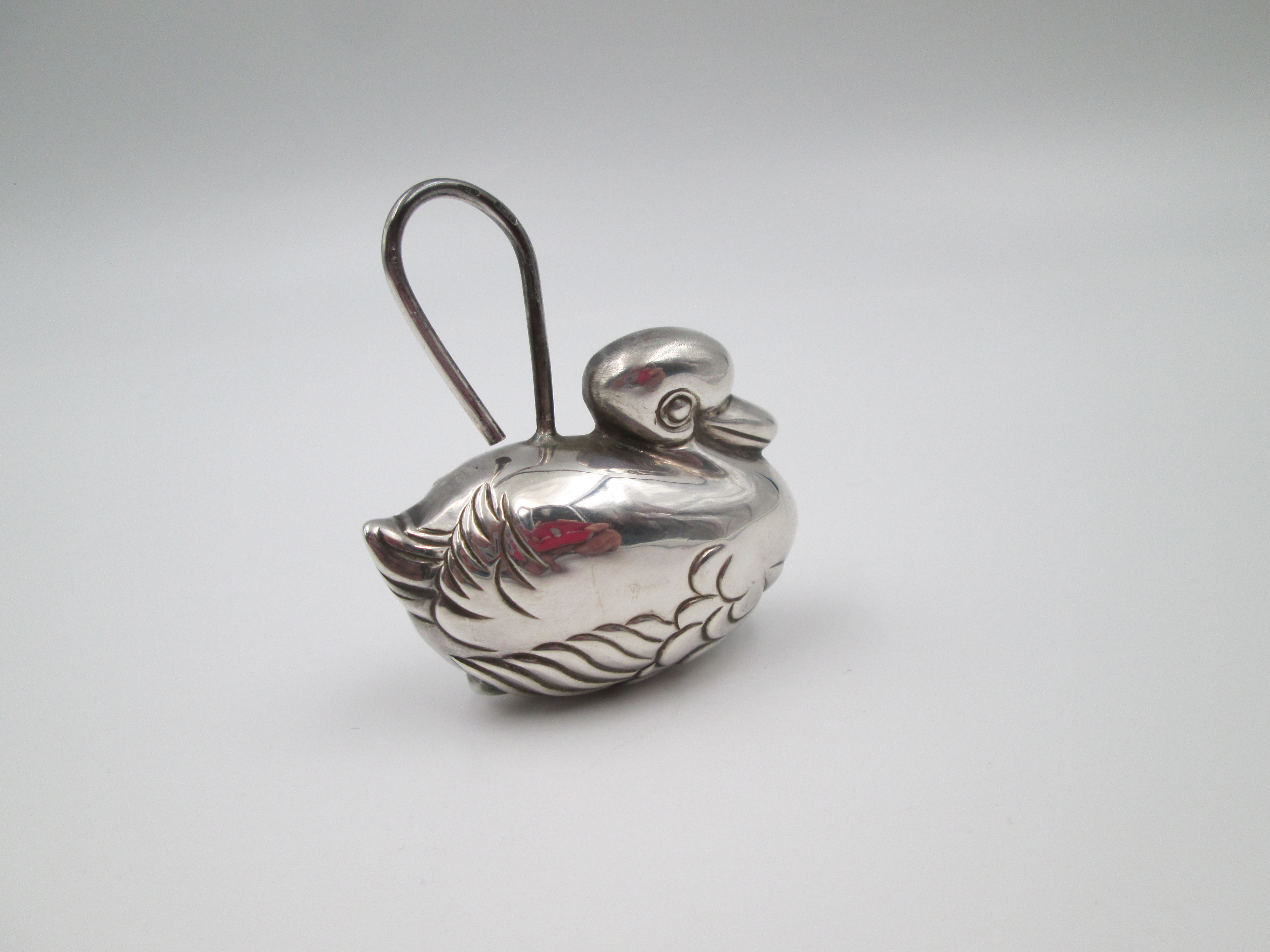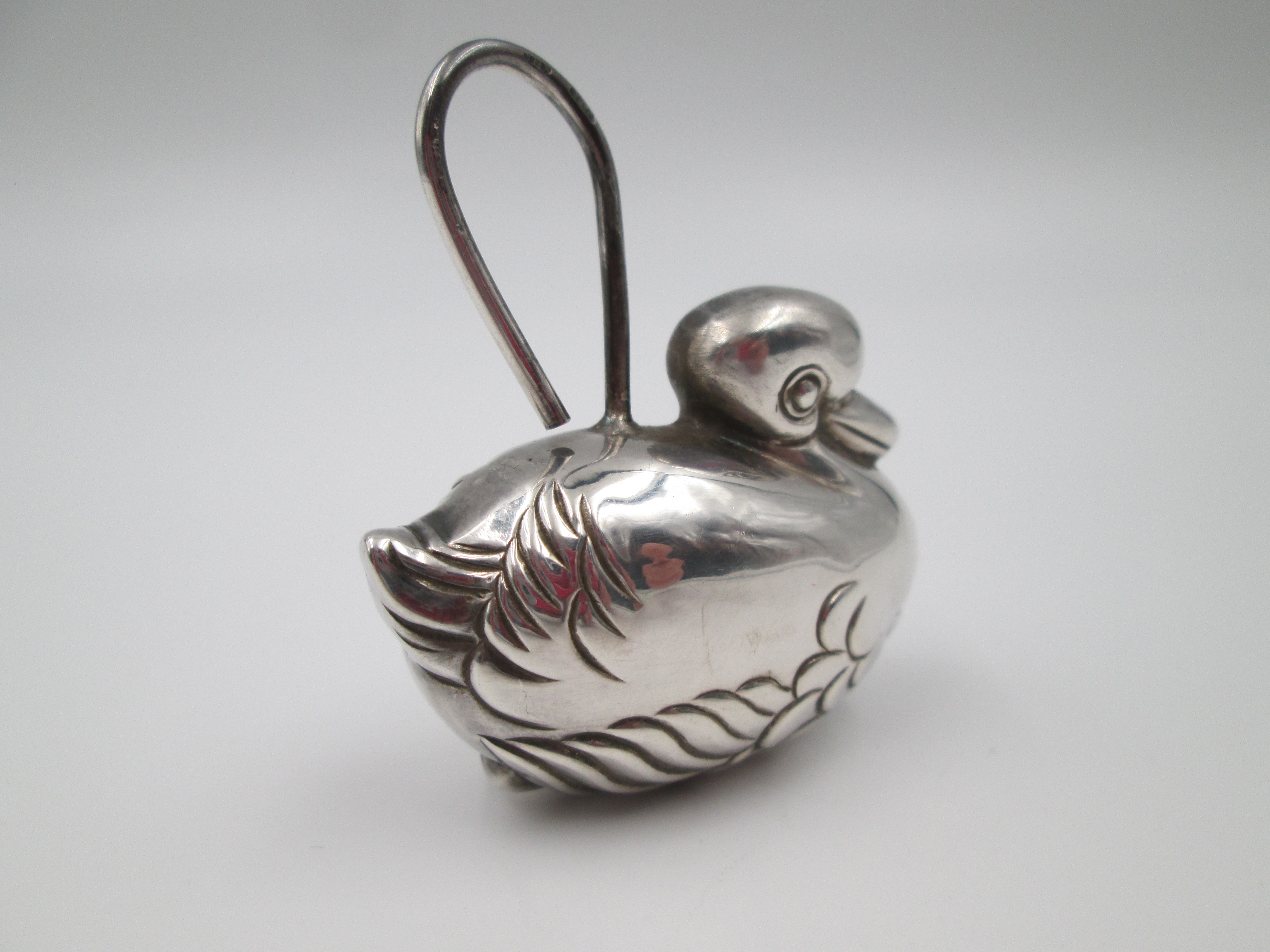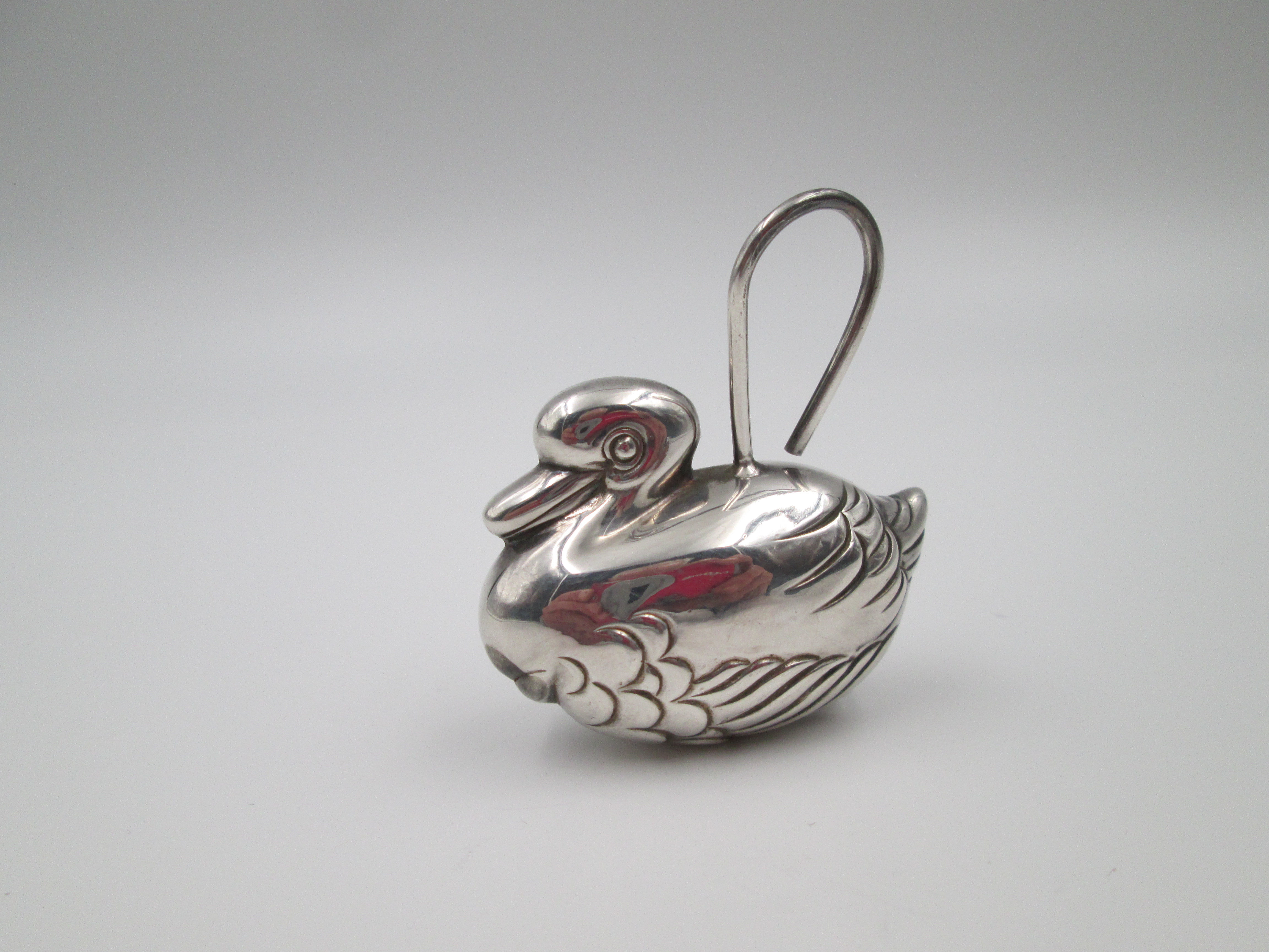 Sonajero infantil con asa. Plata de ley 925. Figura de pato nadando. Europa. 1980