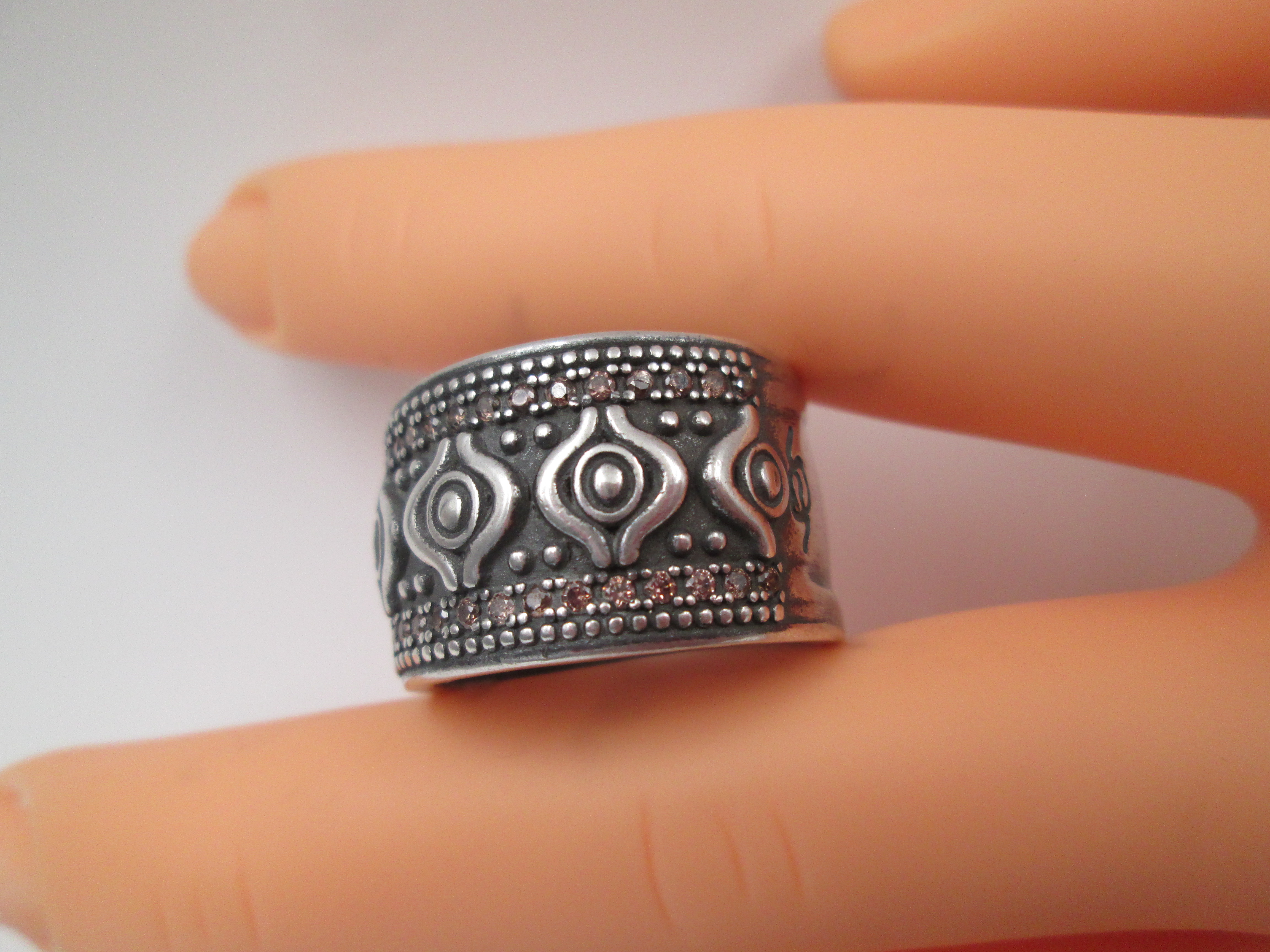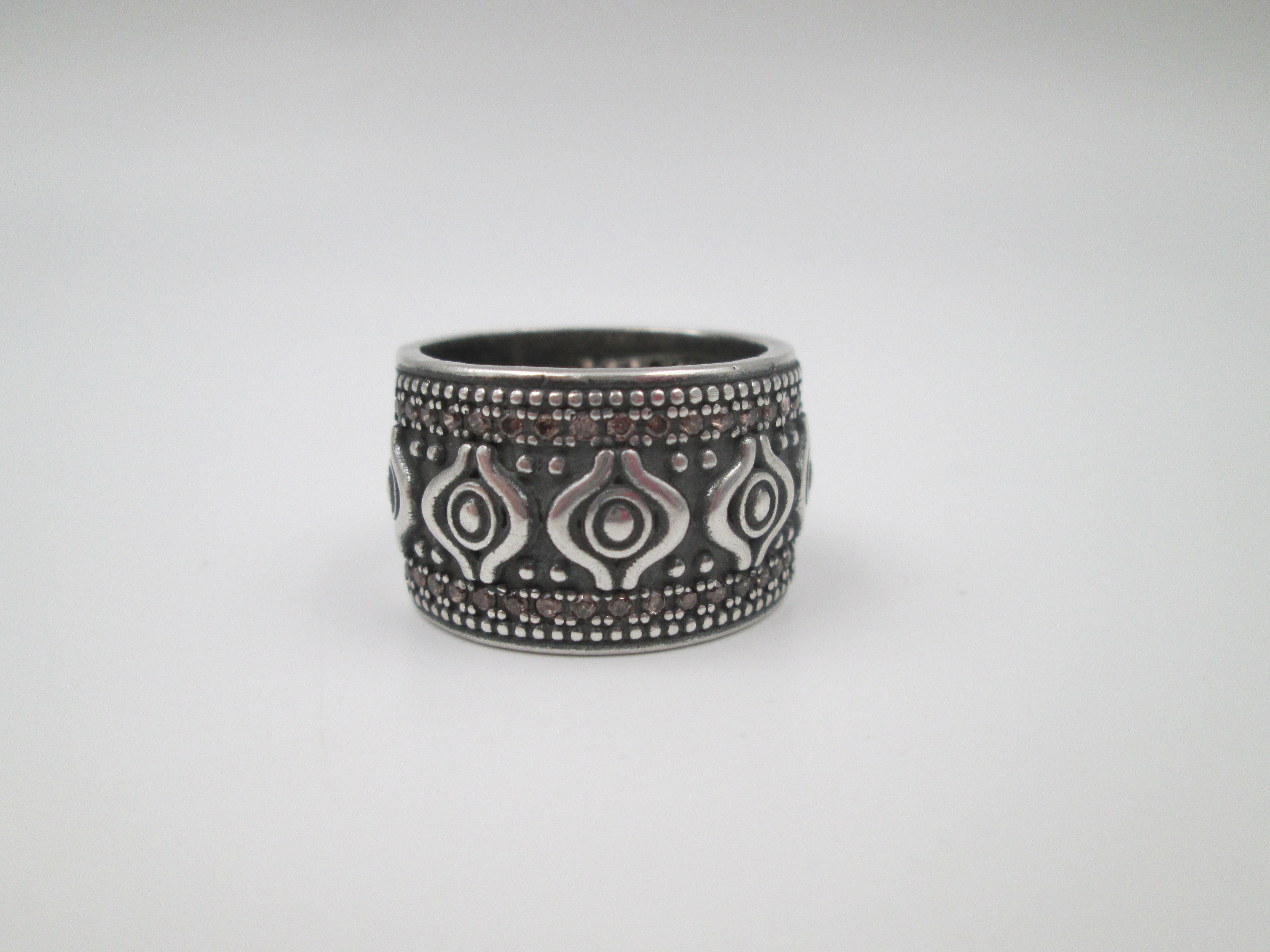 Sortija ancha para mujer. Plata de ley. Gemas rosas y motivos tribales. Europa. 1990