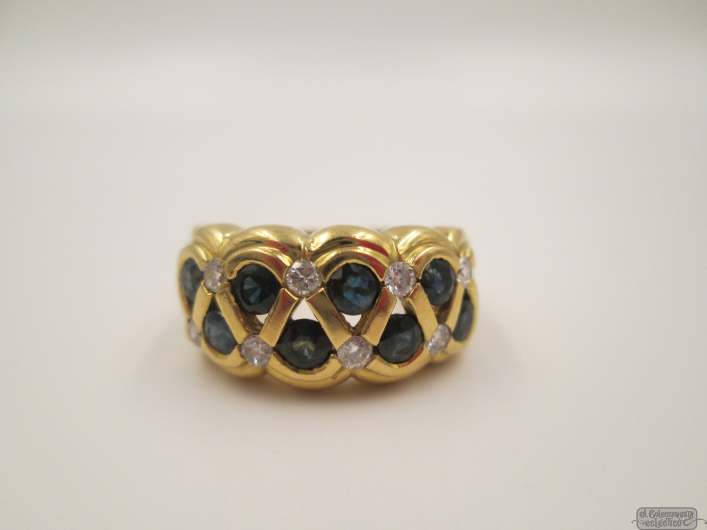 Sortija. Oro amarillo de 18 quilates. Diamantes y zafiros. Años 90