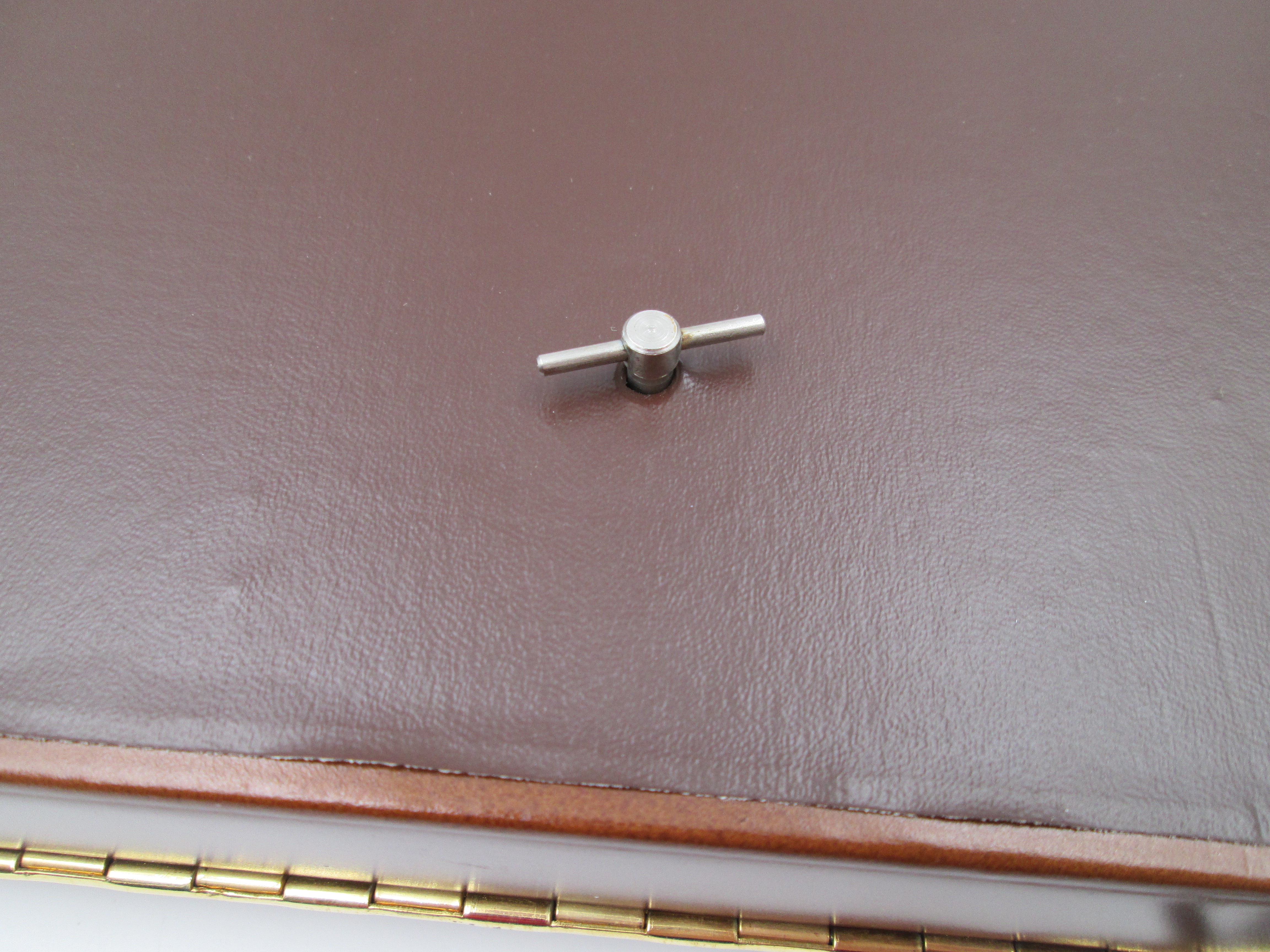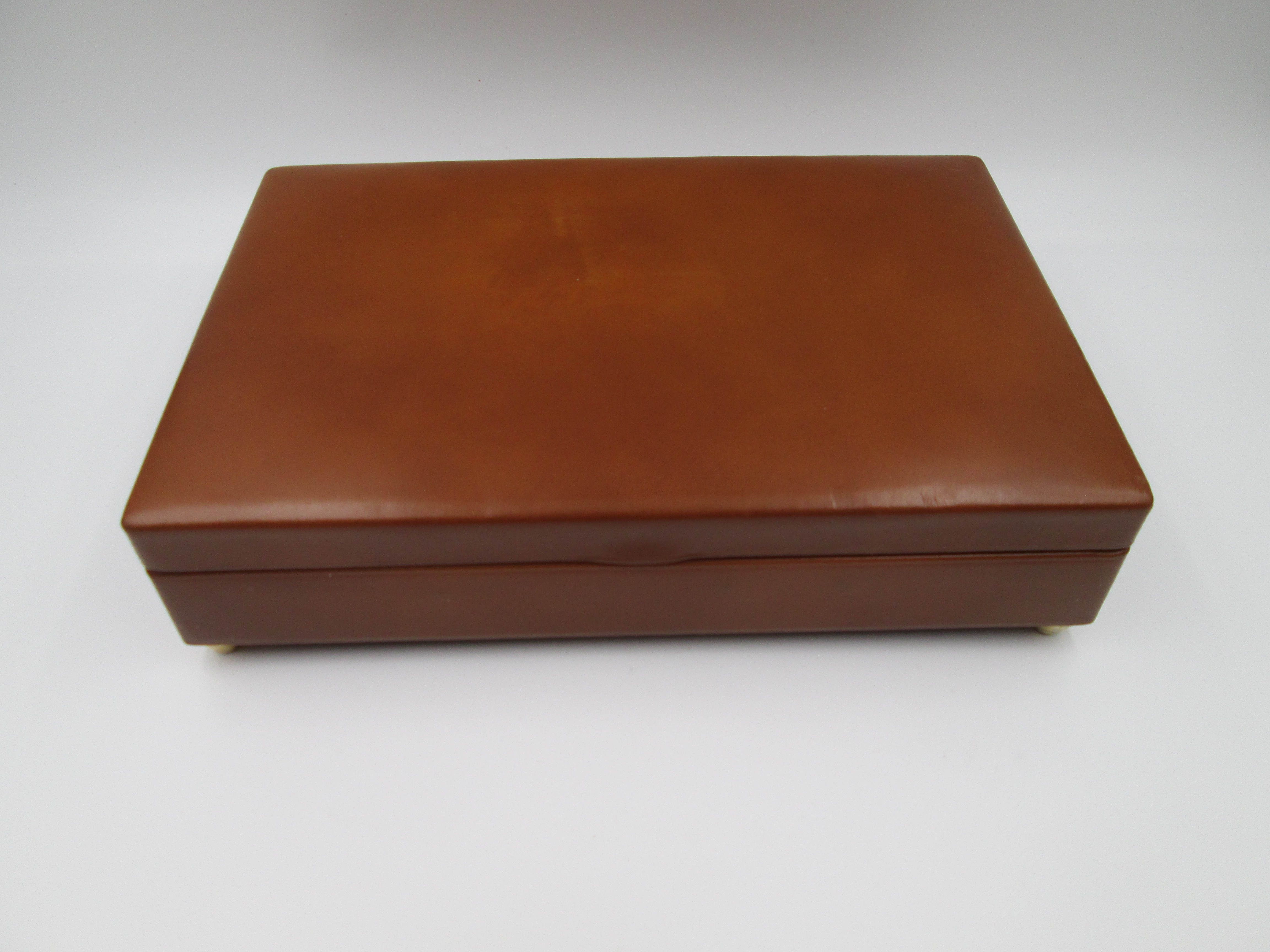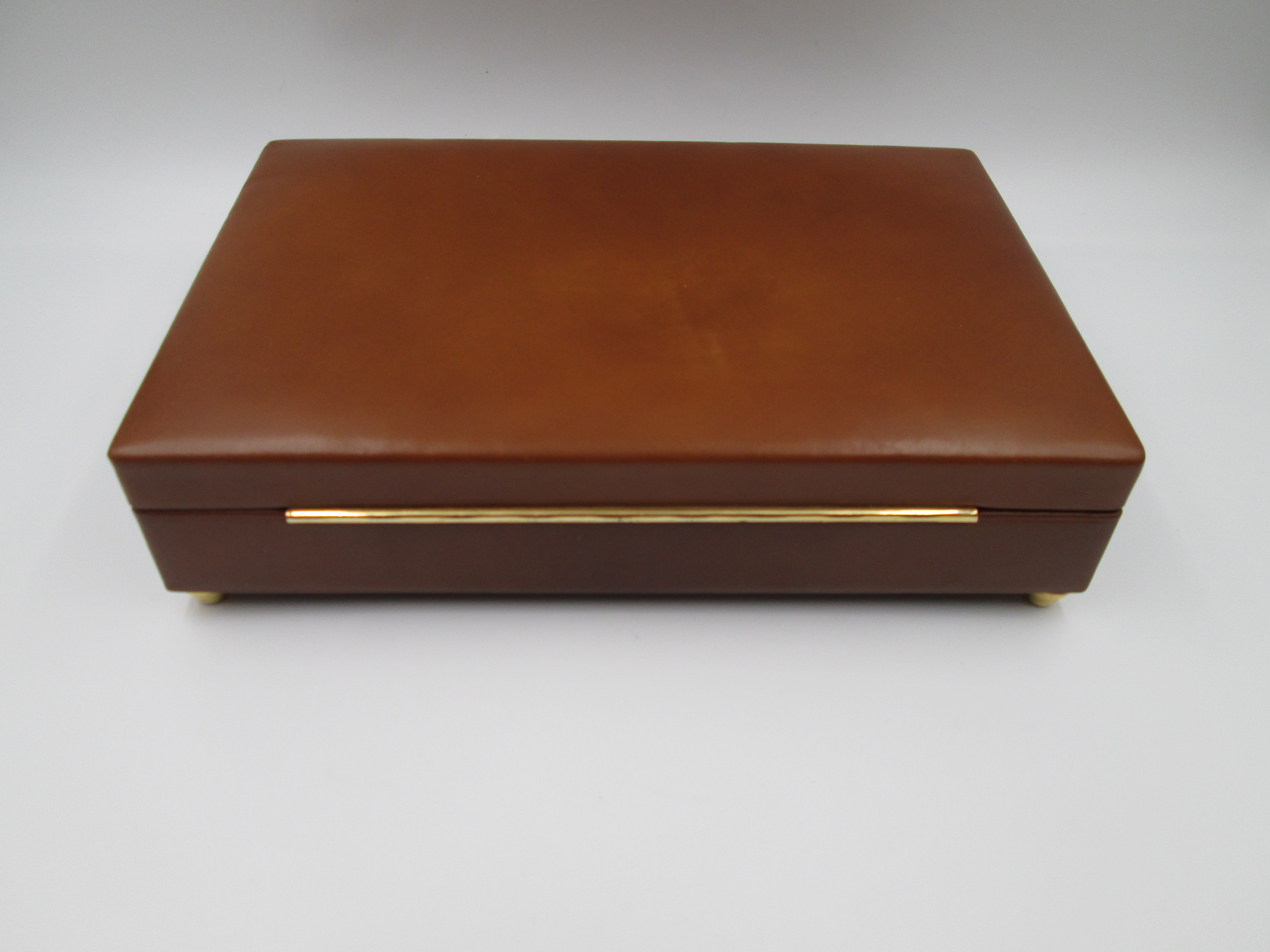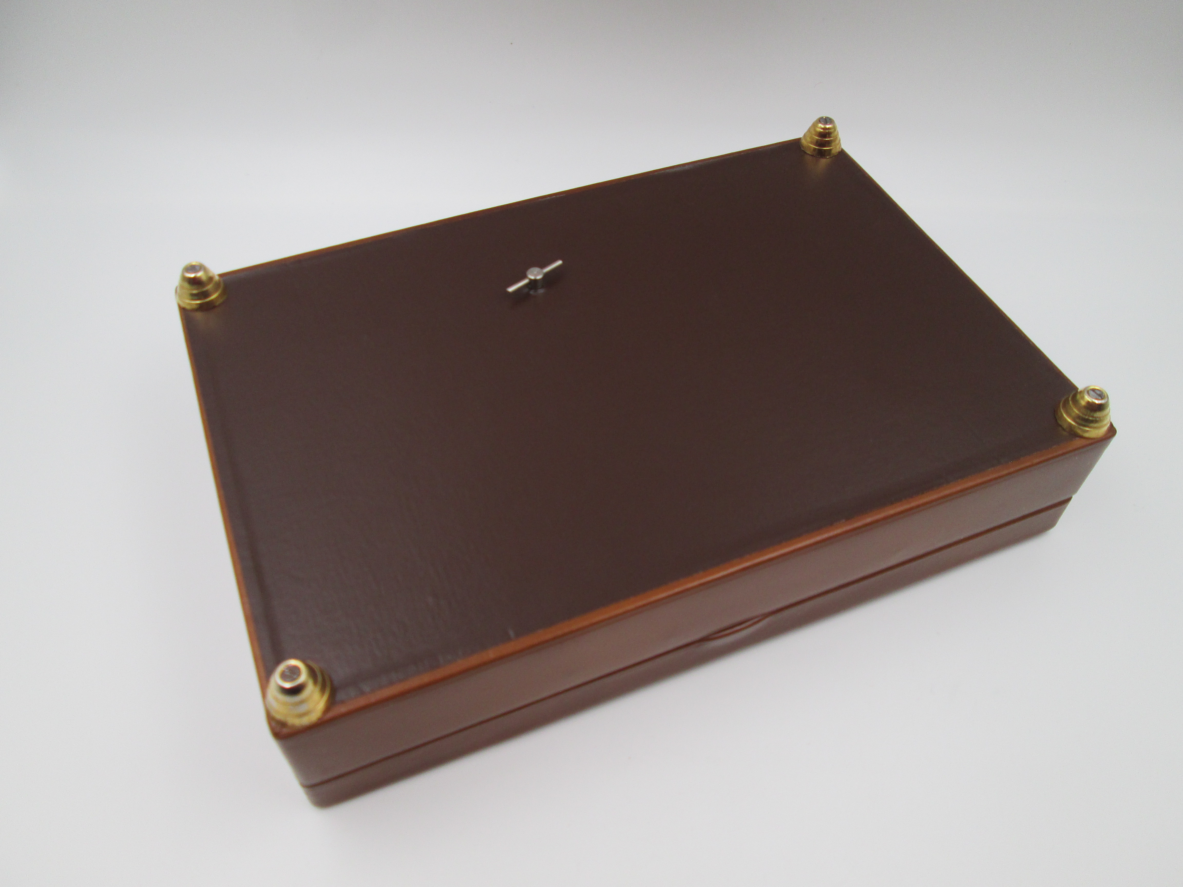 Tabaquera musical de despacho y escritorio. Madera y piel marrón. Cuerda manual. 1970