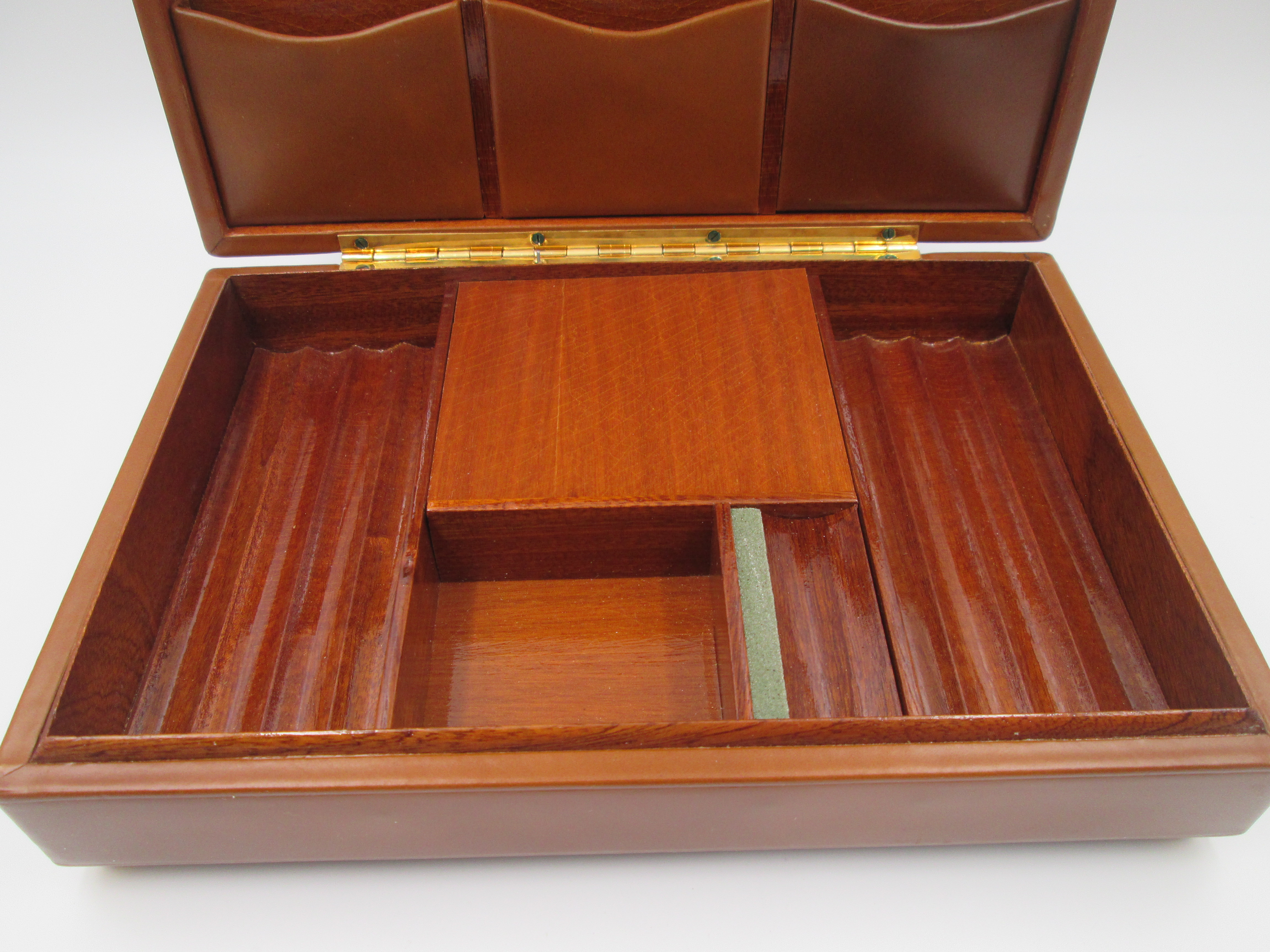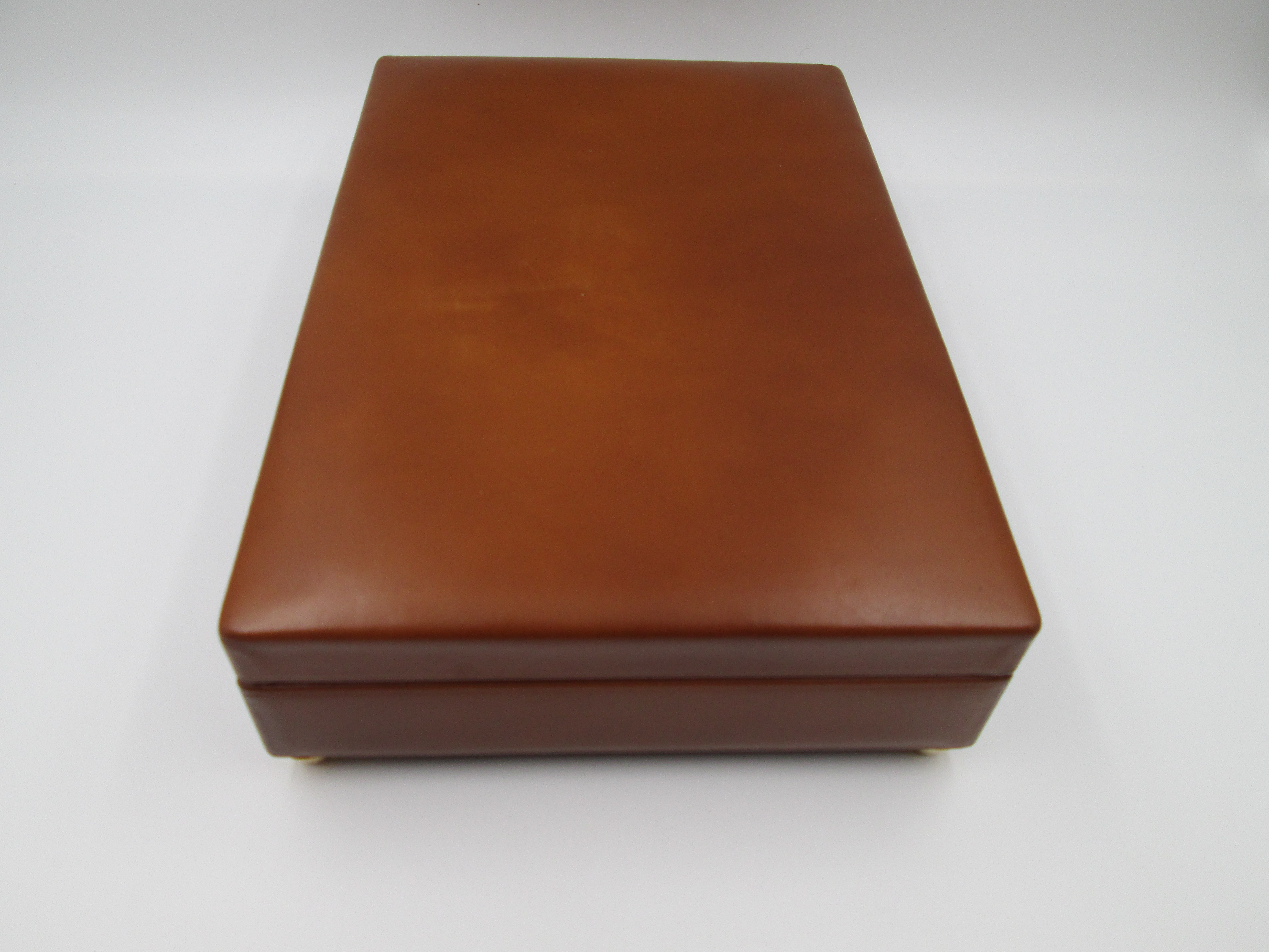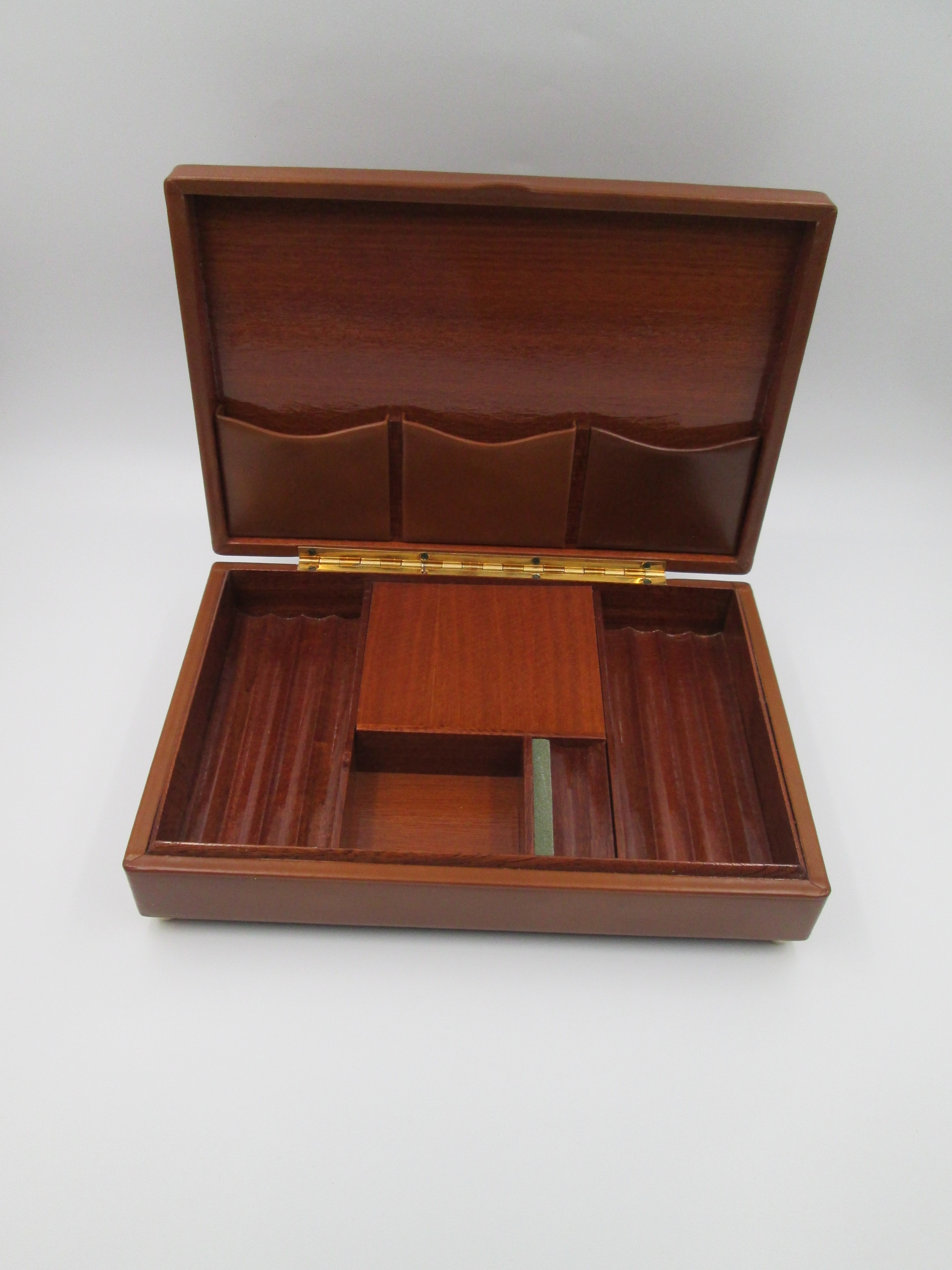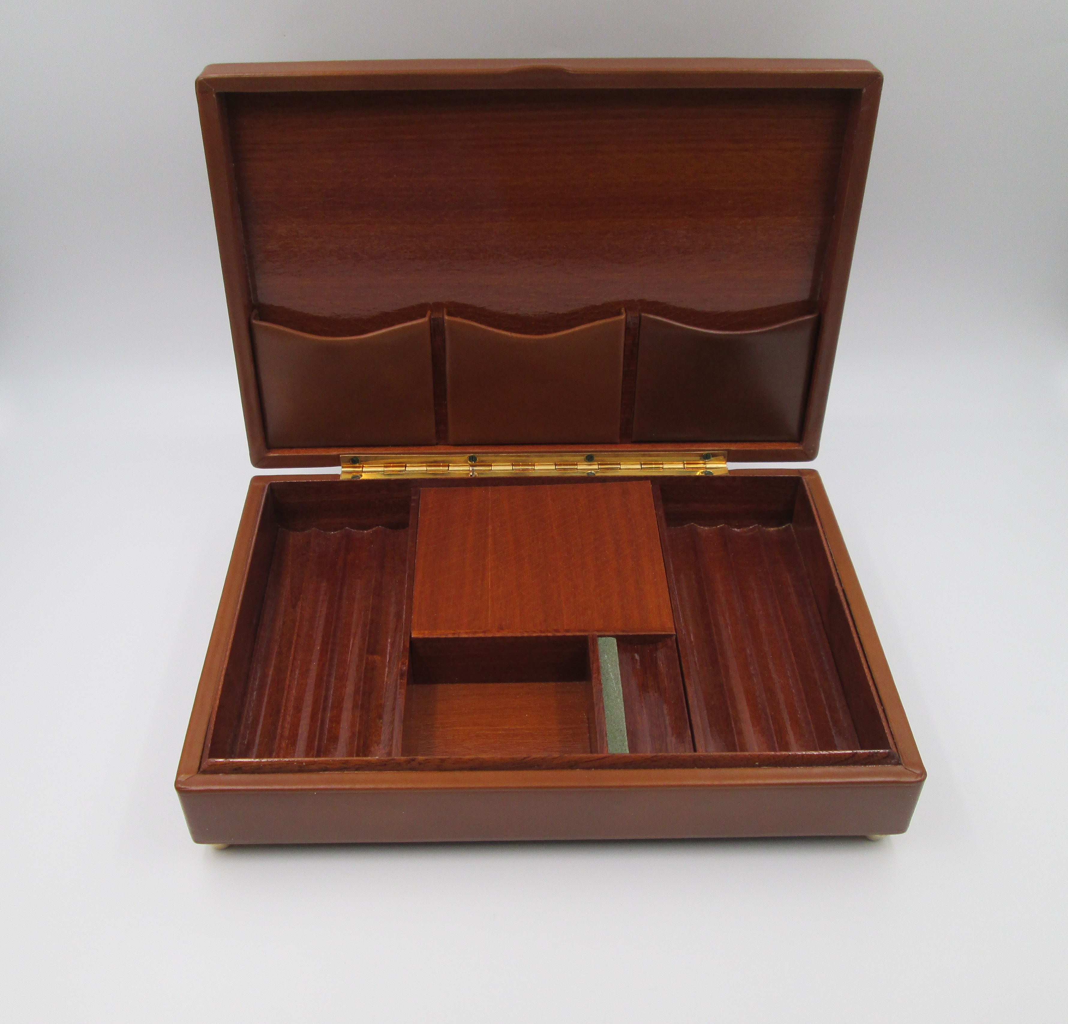 Tabaquera musical de despacho y escritorio. Madera y piel marrón. Cuerda manual. 1970