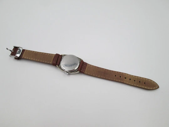 Dotado de cristal de plexiglás, equipa un movimiento automático suizo sobre 17 gemas, resistente al agua y con sistema Incabloc, y se suministra con una correa de piel marrón con hebilla plateada.