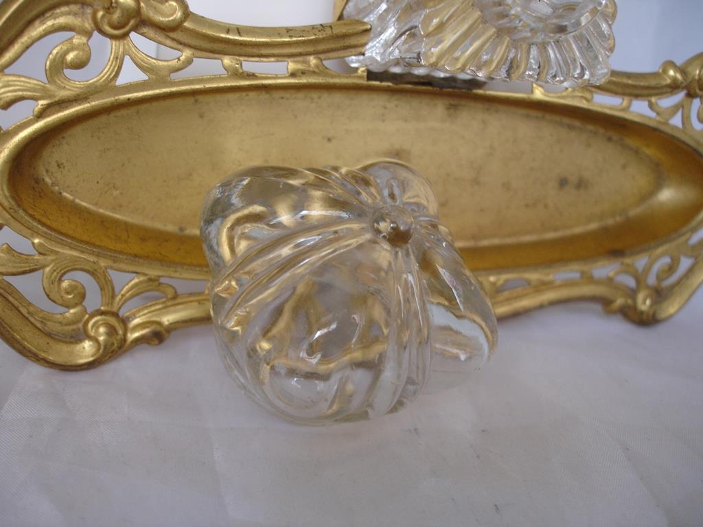 Tintero mesa. Cristal tallado. Bandeja metal dorado. Años 50