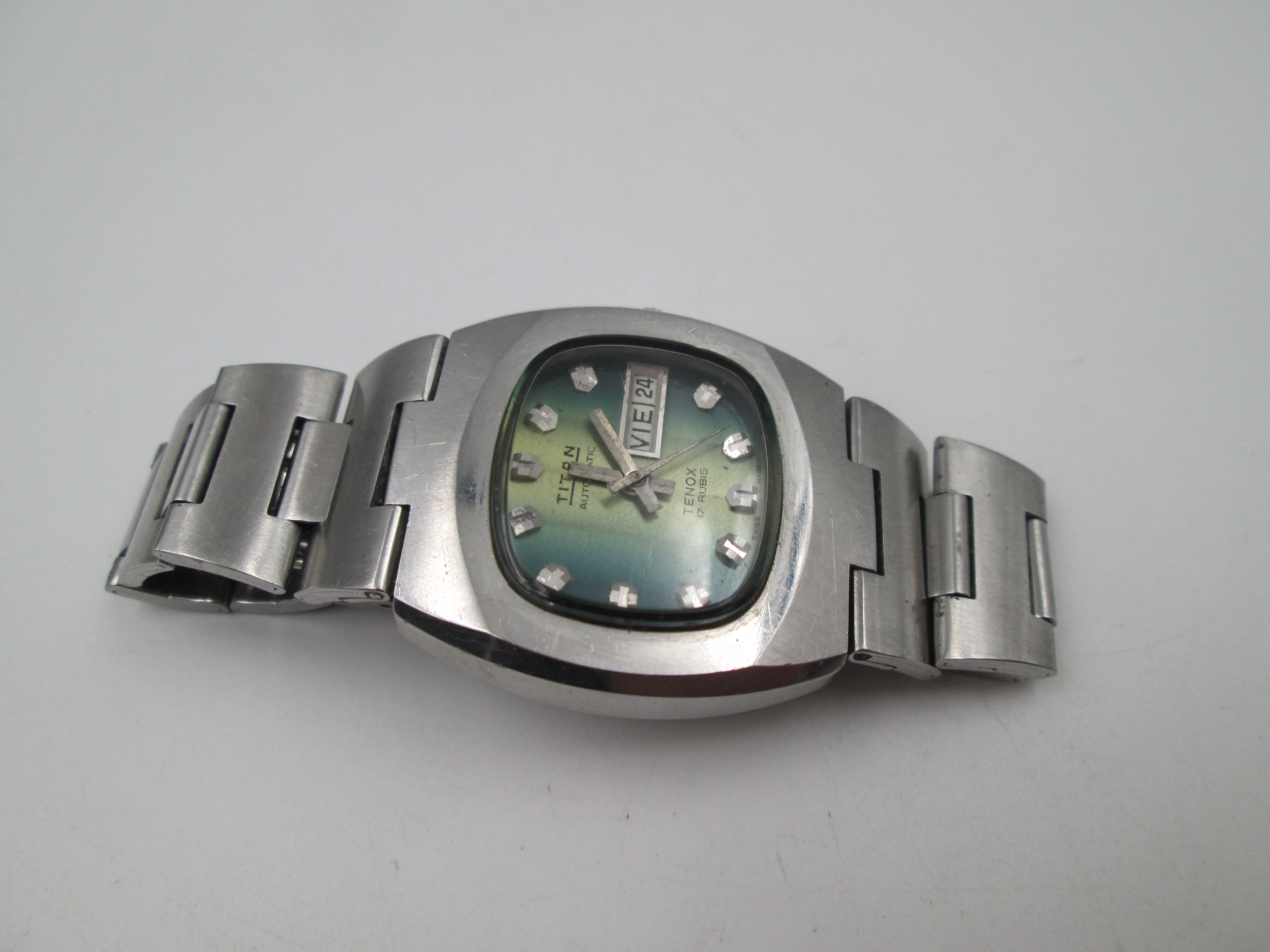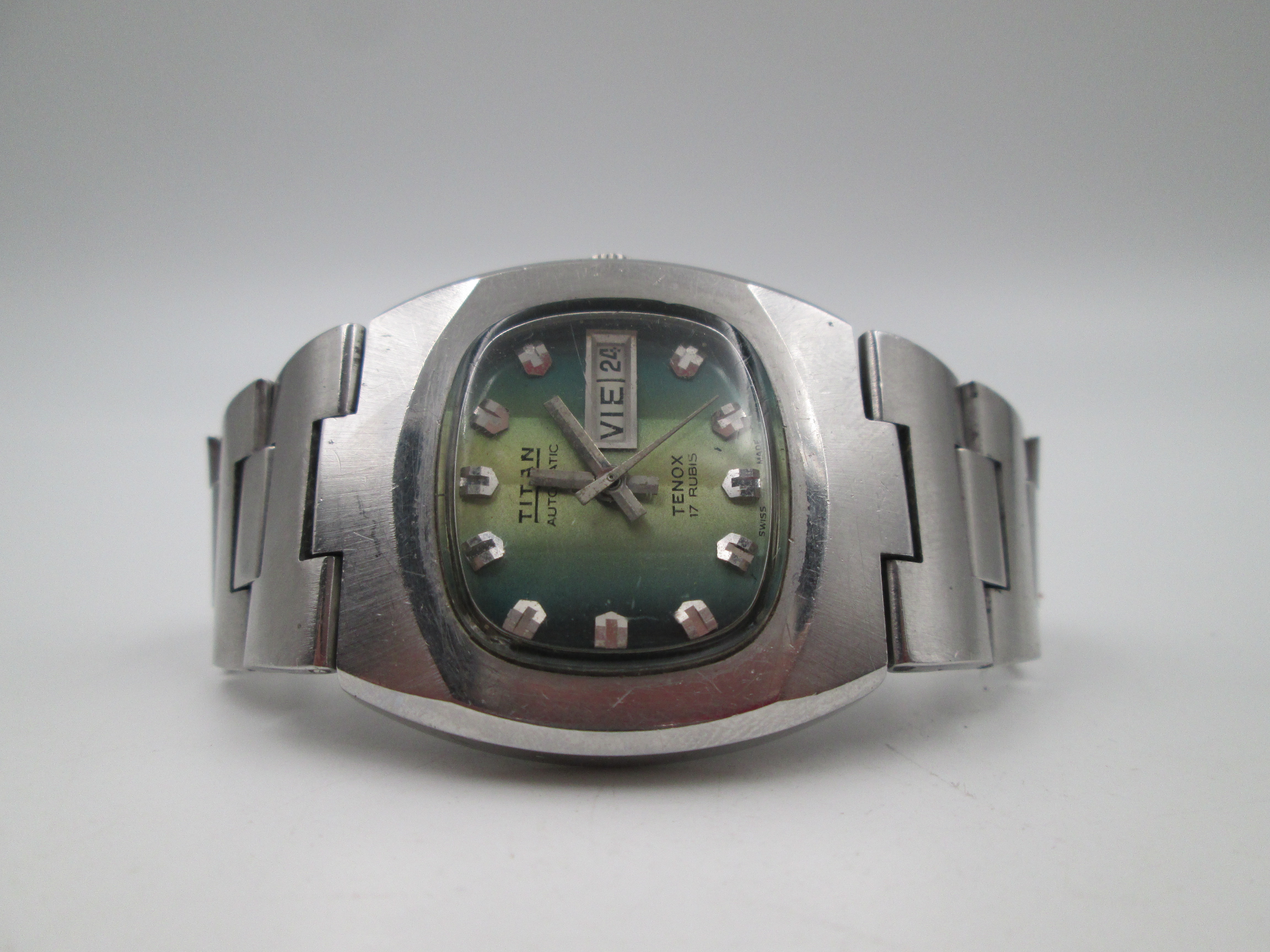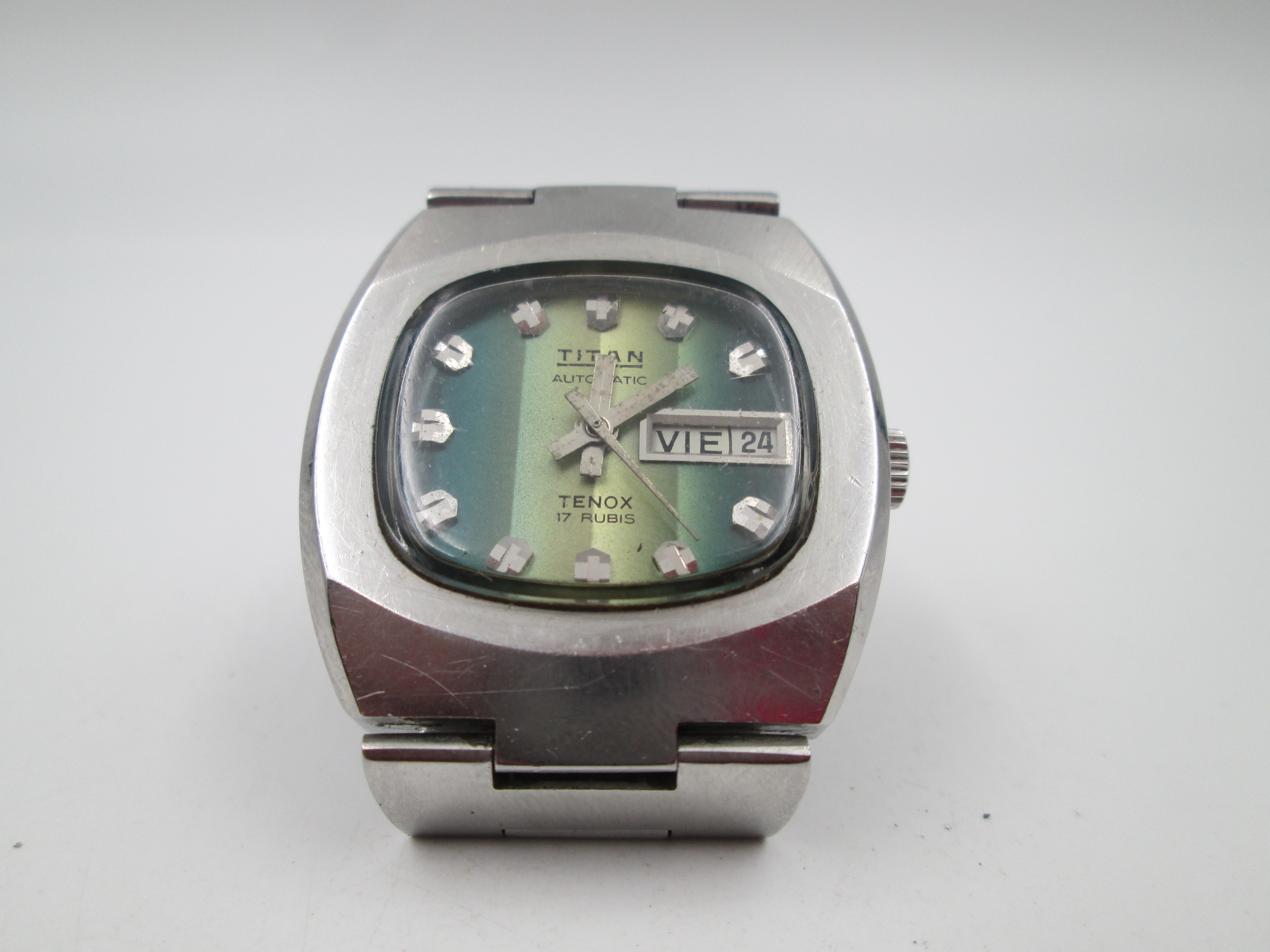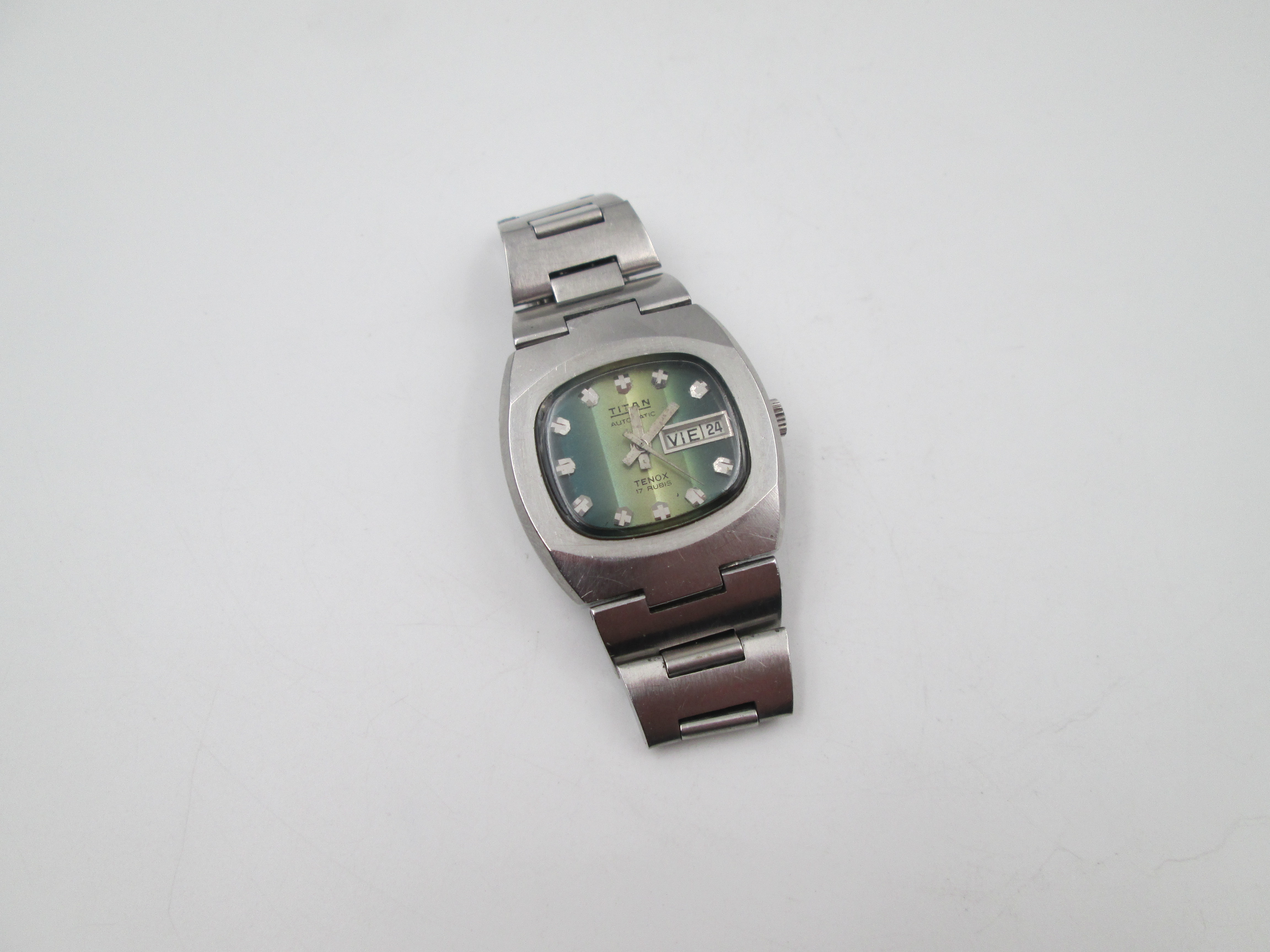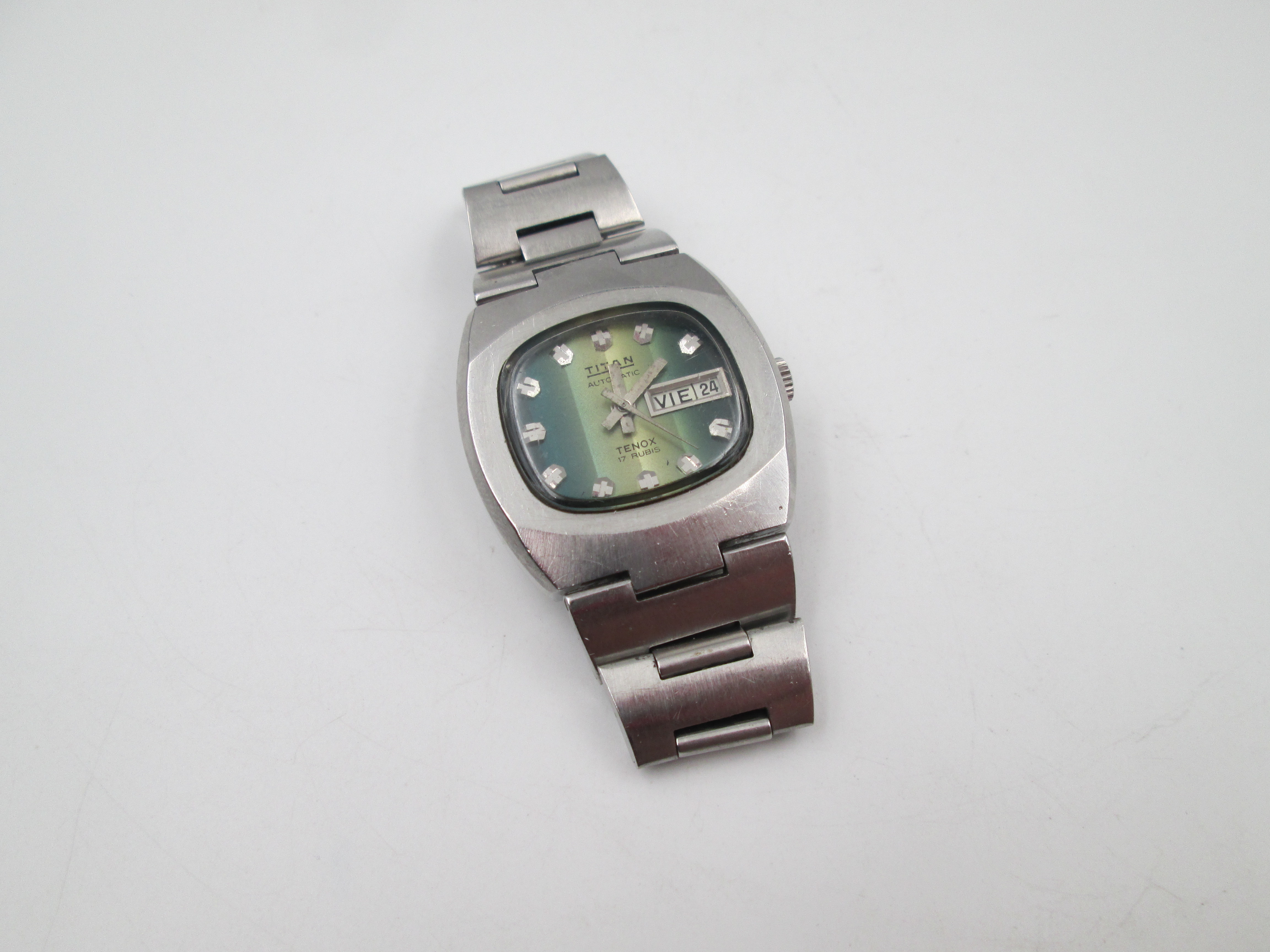 Titan Tenox. Acero inoxidable. Automático. Brazalete. Dial bicolor verde. Calendario. 1970