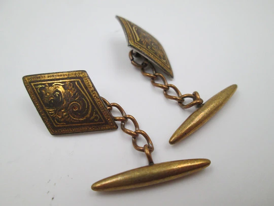 Trío gemelos caballero. Damasquinado y metal dorado. Años 70. España